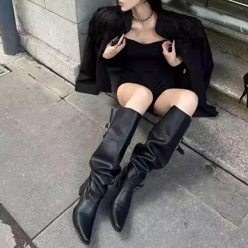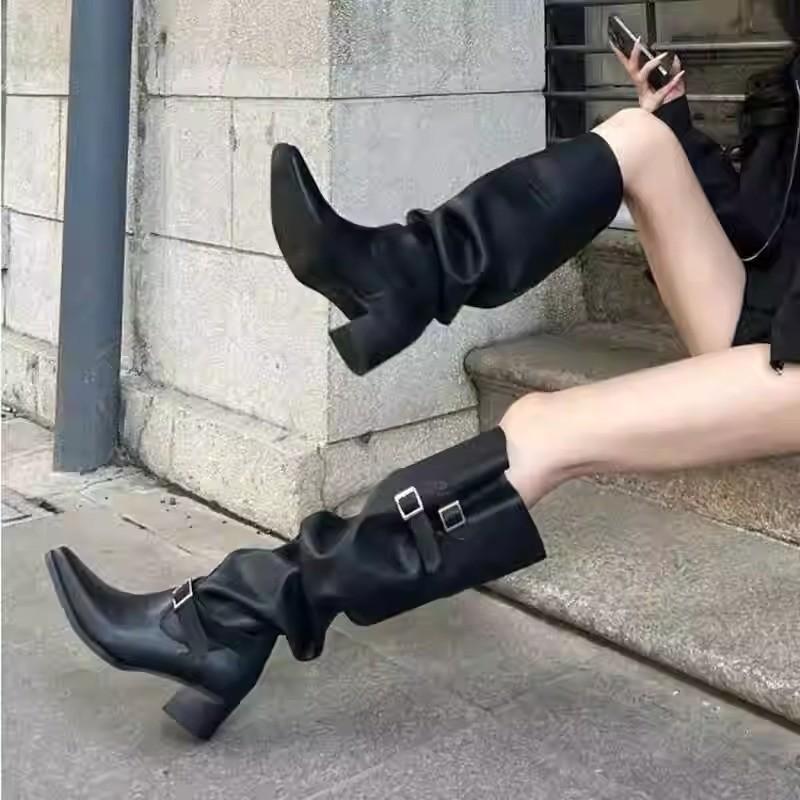Botas puntiagudas nuevas de otoño e invierno 2024, botas de mujer con tacón grueso y botas altas hasta la rodilla, zapatos de tacón alto para mujer