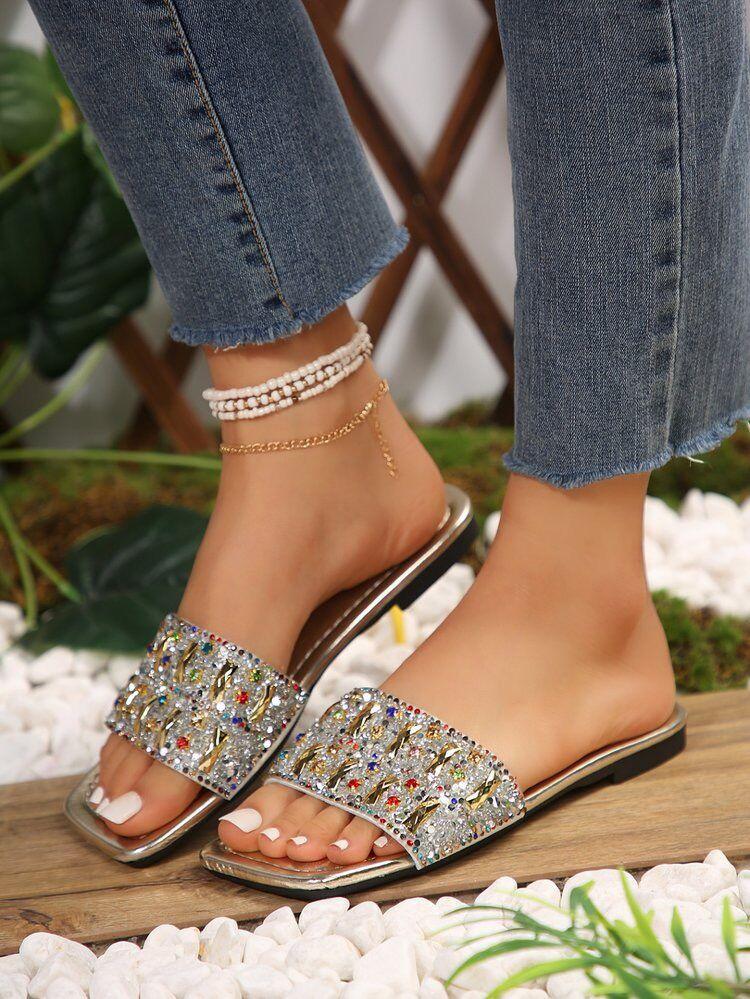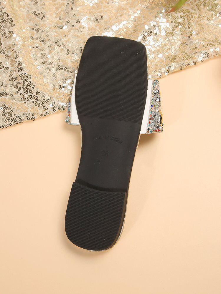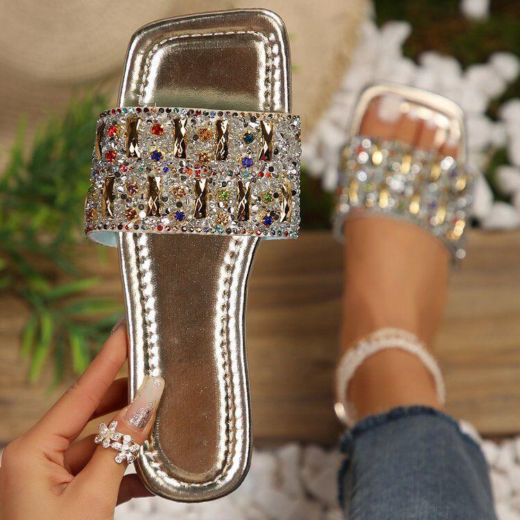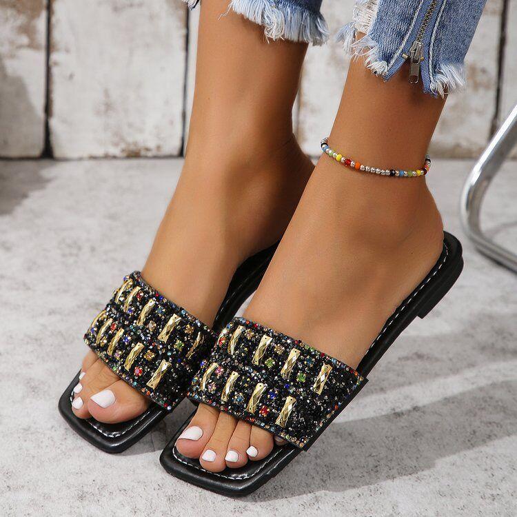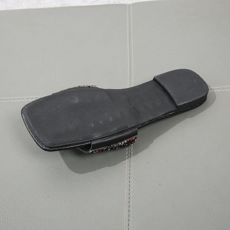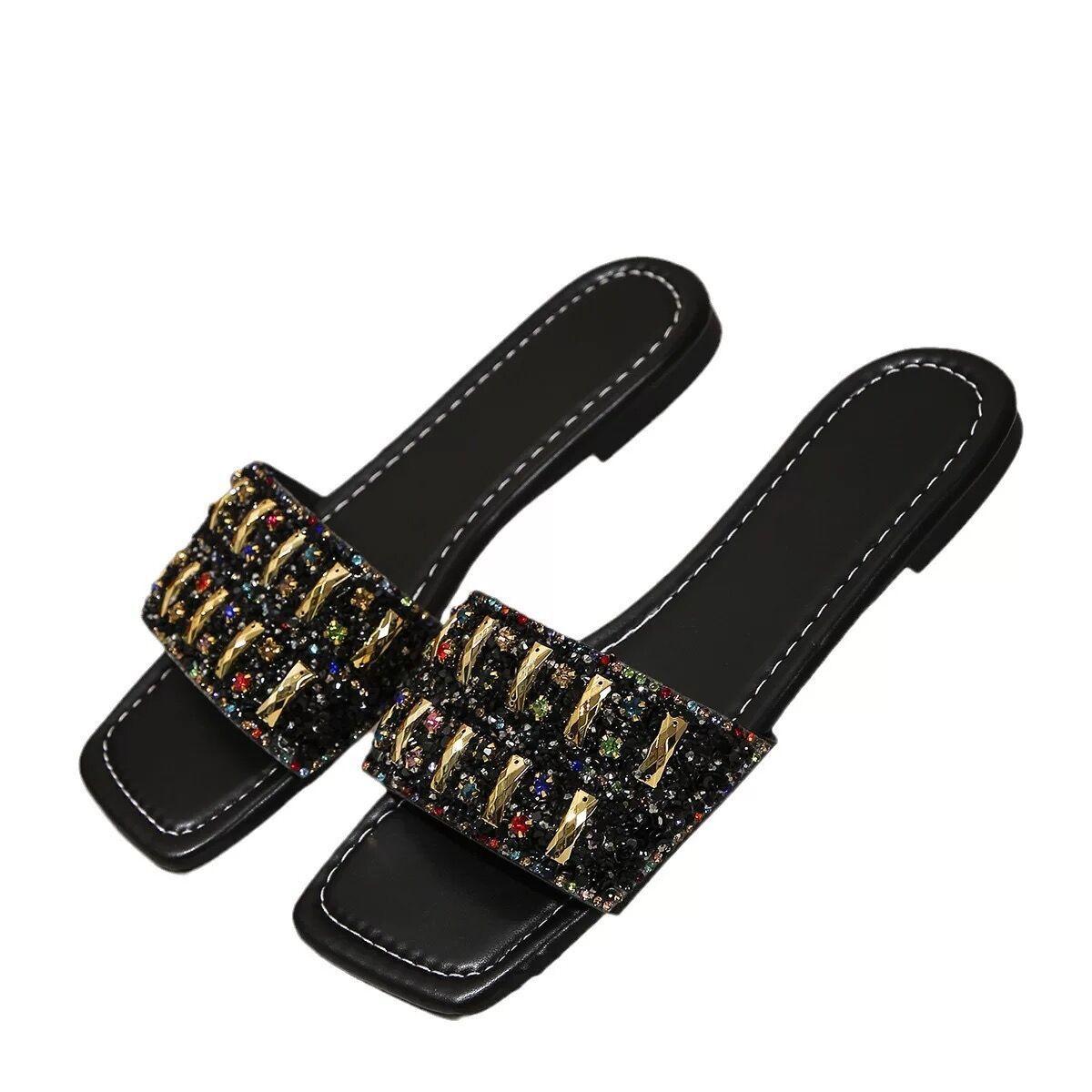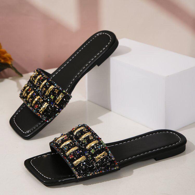 Zapatillas de suela plana de moda europea y americana para mujer, nuevas zapatillas informales de verano con cabeza cuadrada y diamantes de imitación para mujer