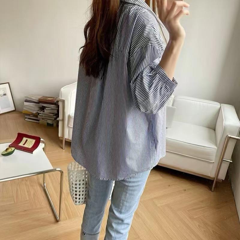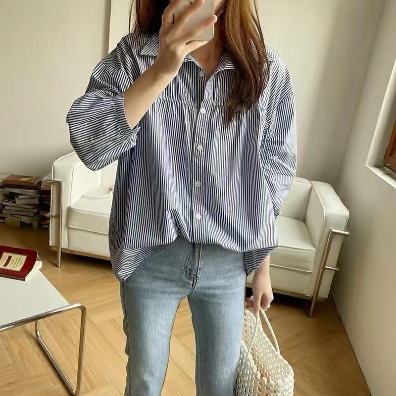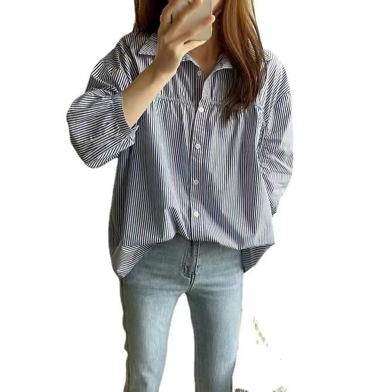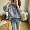 Diseño Sentido Nicho Camisa Mujer Delgada 2025 Principio de Primavera Estilo Coreano Manga Abullonada Cordón Manga Siete Rayas