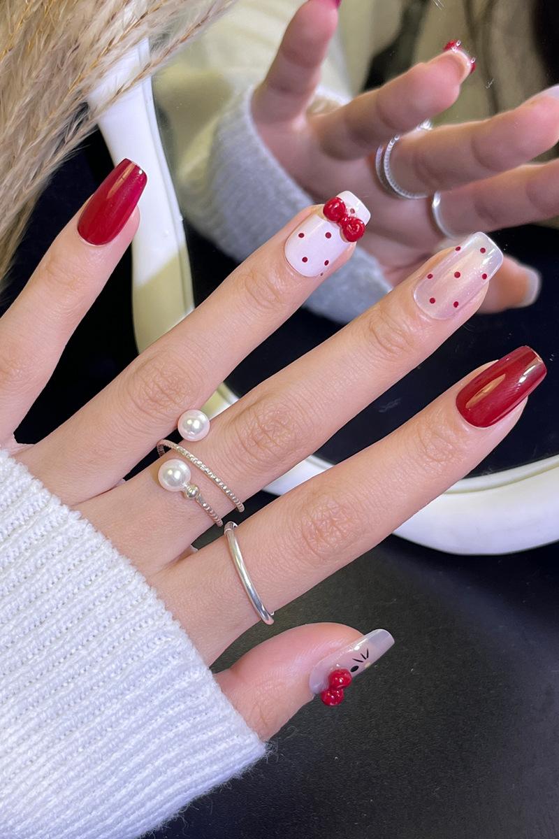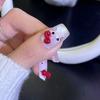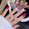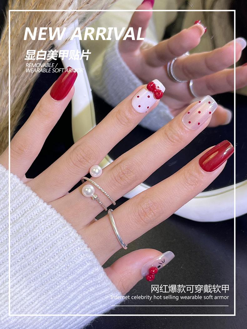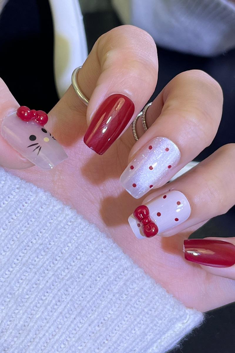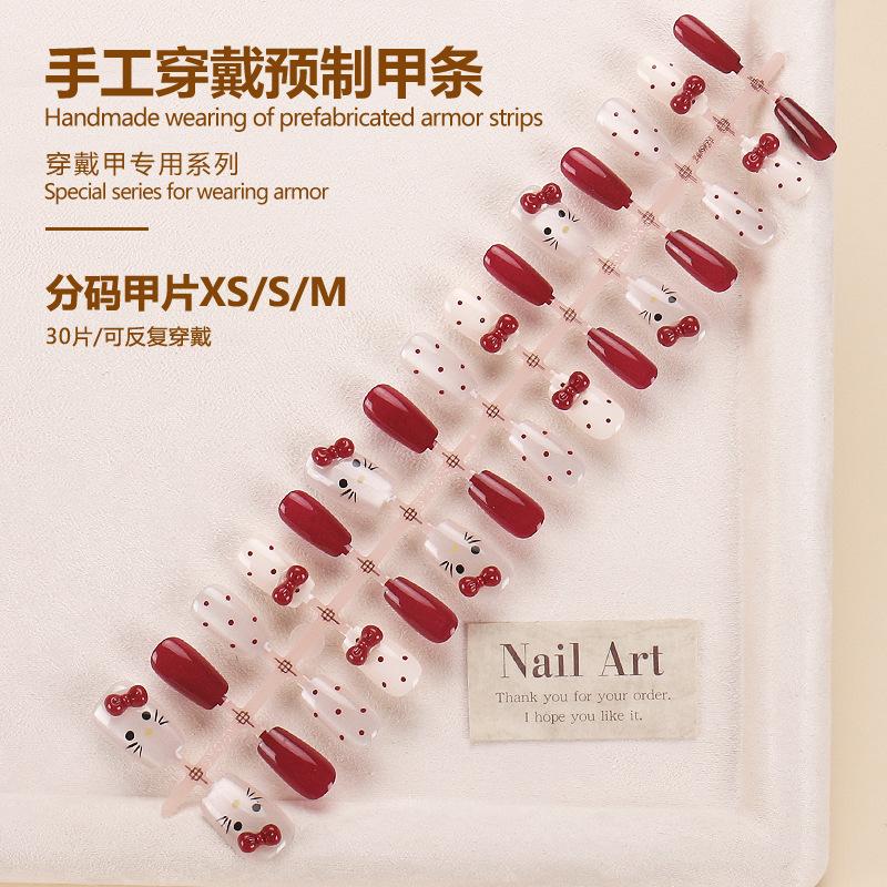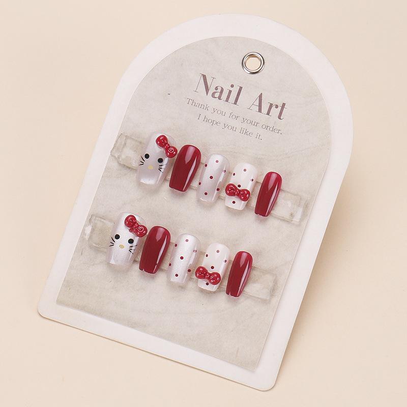 Uñas Postizas Populares de Xiaohongshu Ojo de Gato Dibujo Animado Lazo Manicura Hecha a Mano Uñas Cortas Otoño e Invierno Uñas Postizas Pre-Hechas
