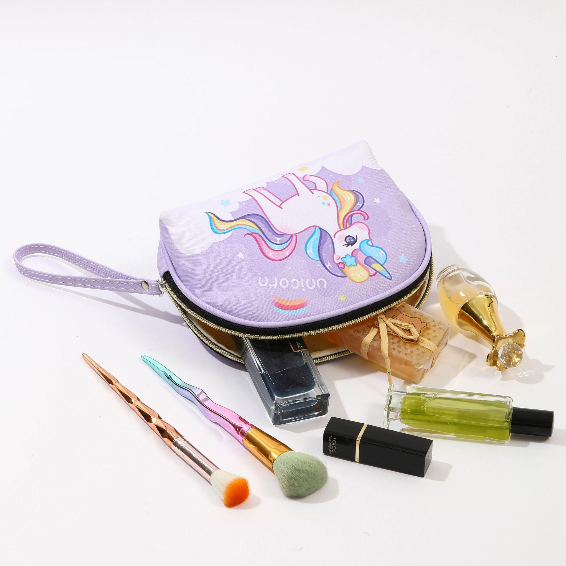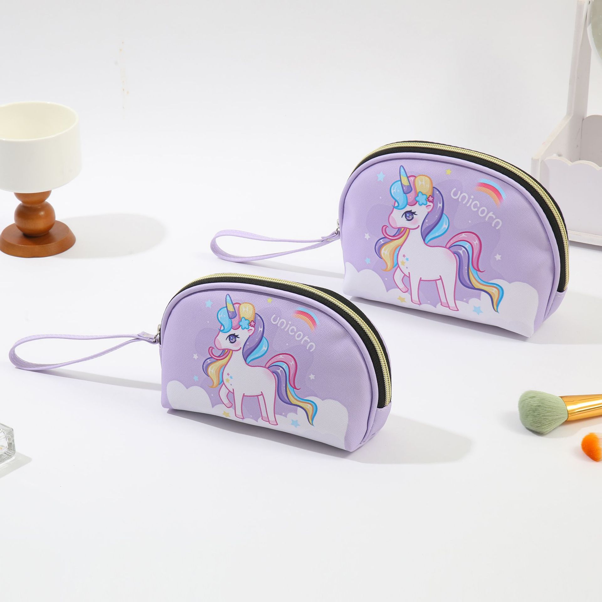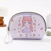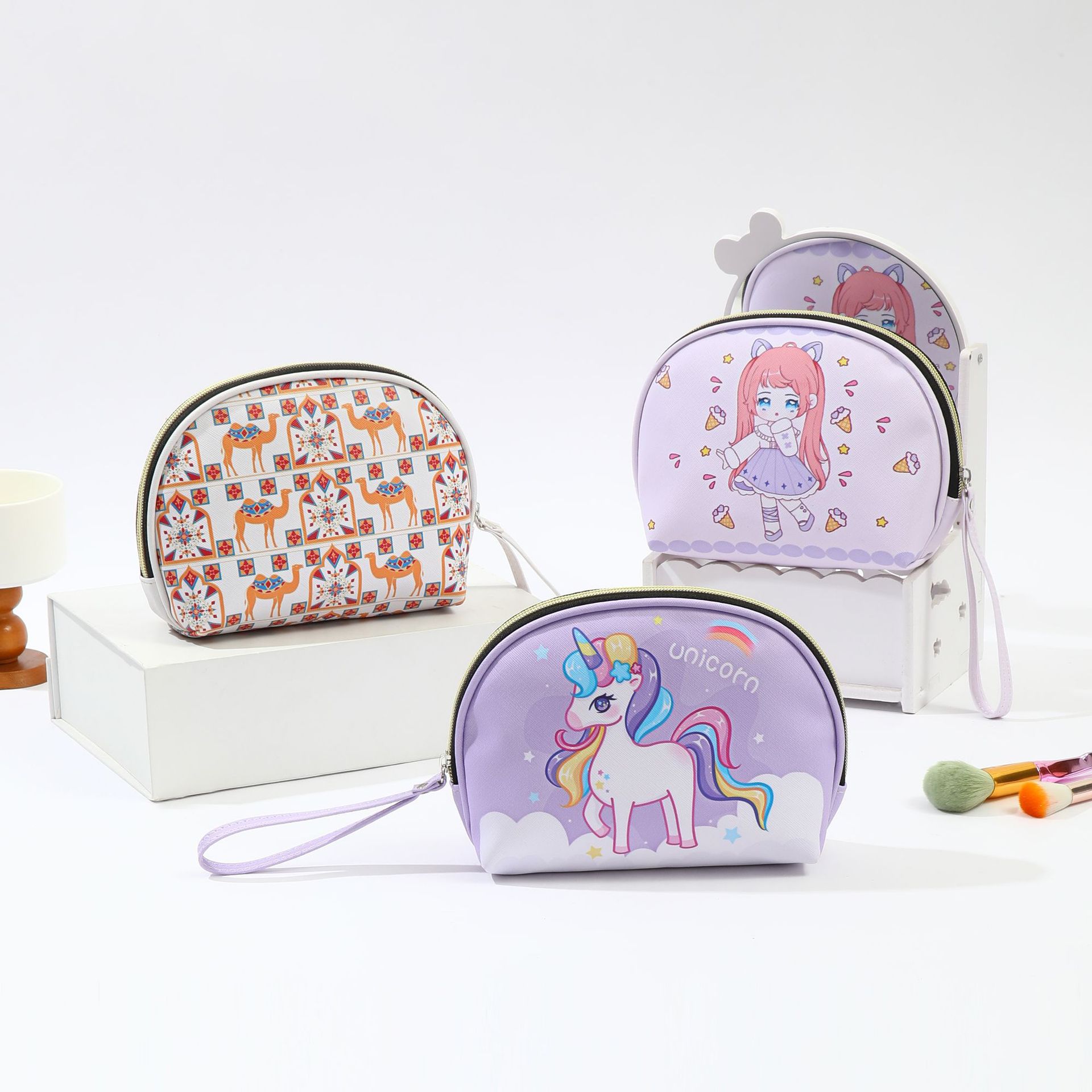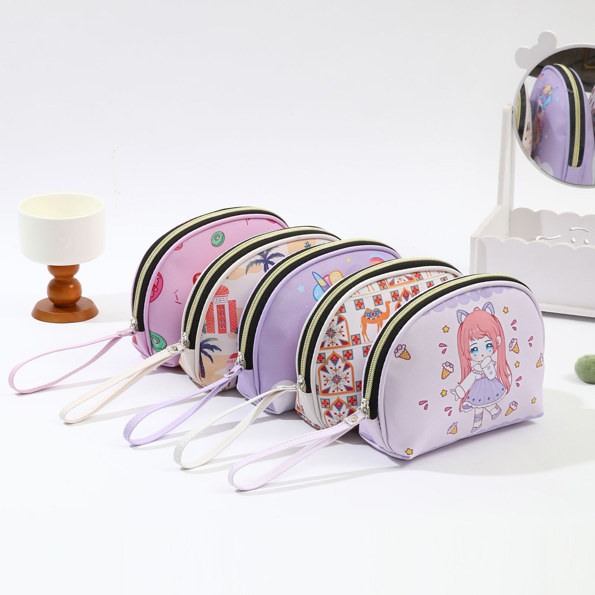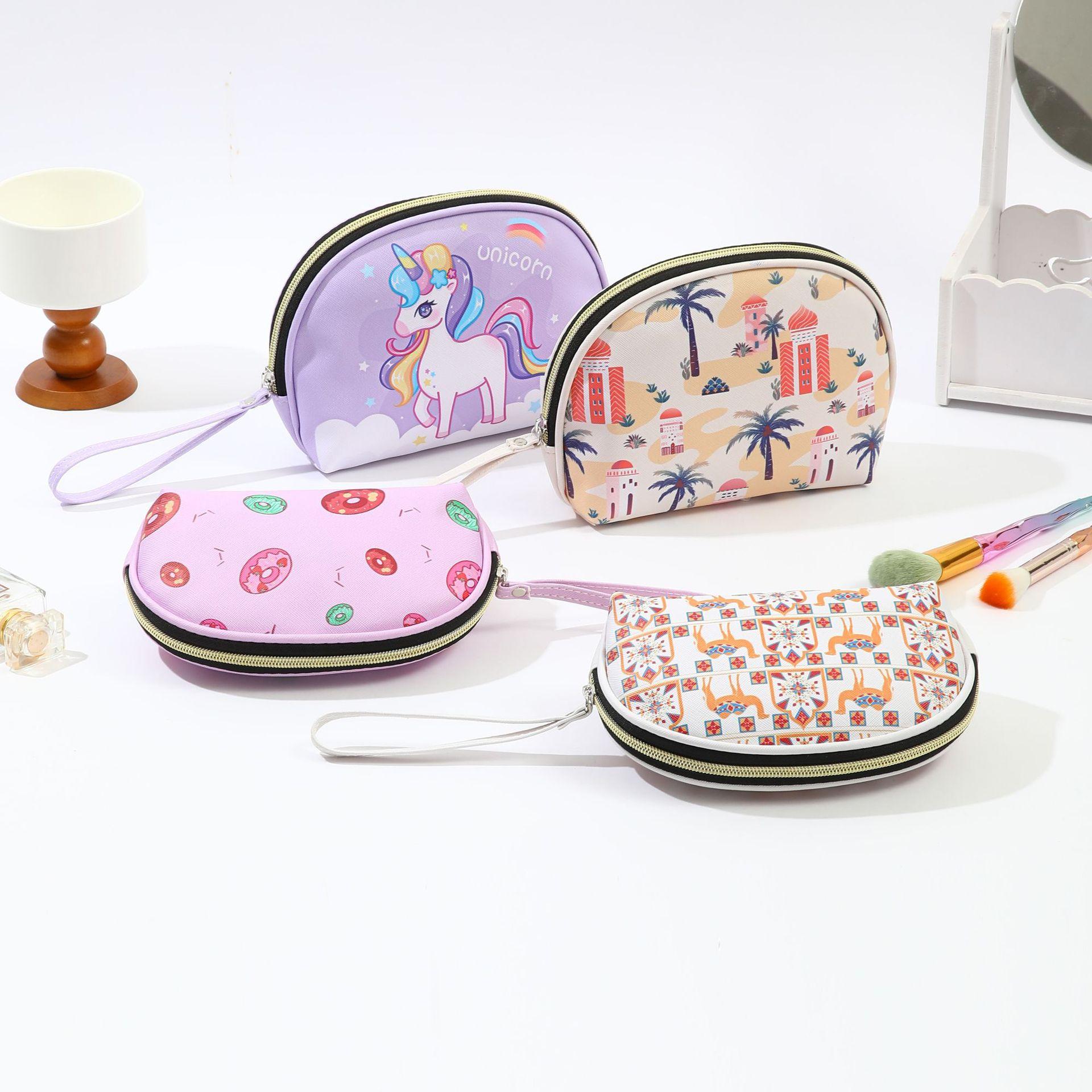 En stock, nueva bolsa de cosméticos de PU con estampado de dibujos animados en forma de semicírculo, bonita bolsa de almacenamiento portátil para niñas, bolsa de lavado para viajes al aire libre.