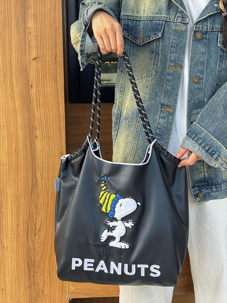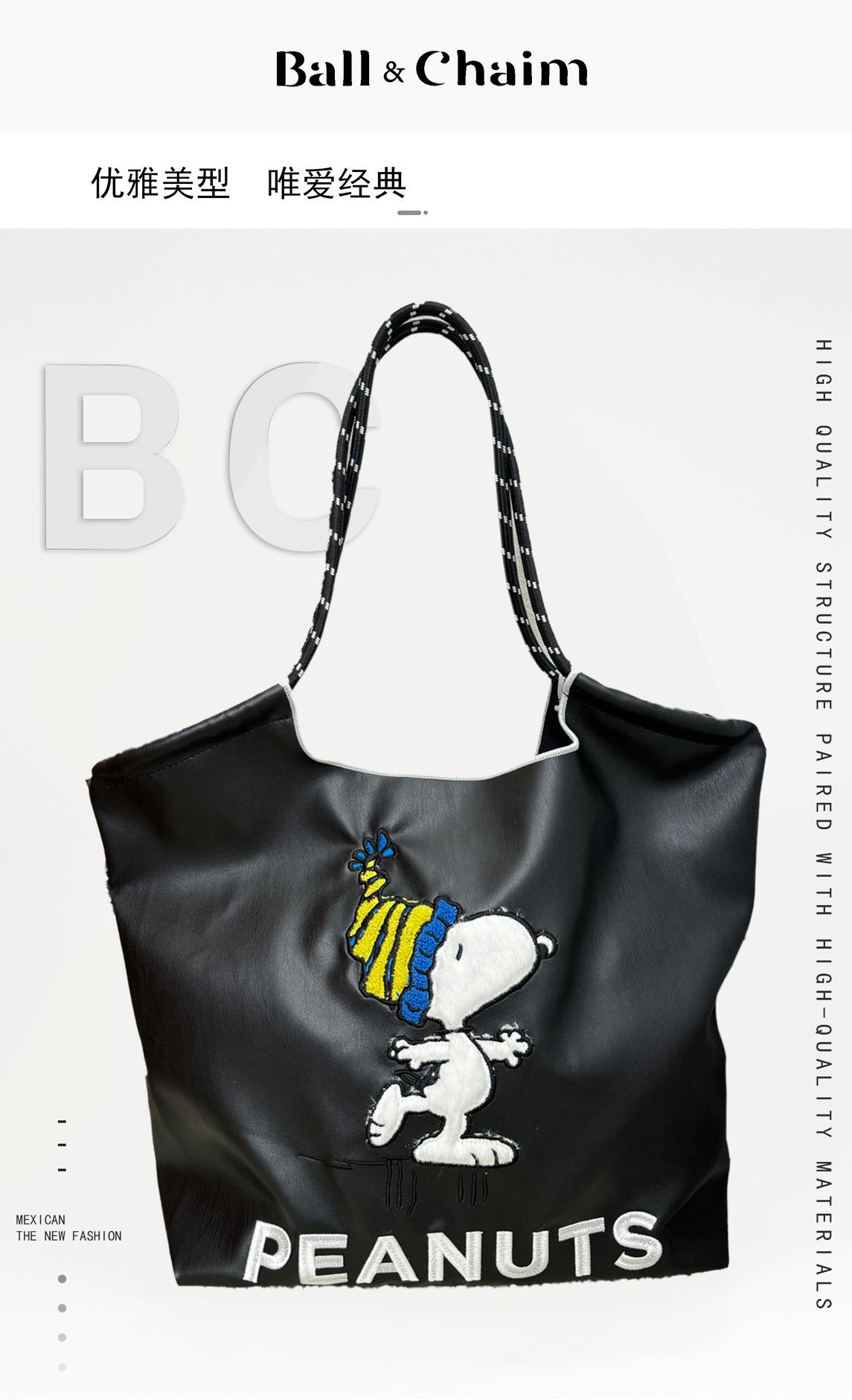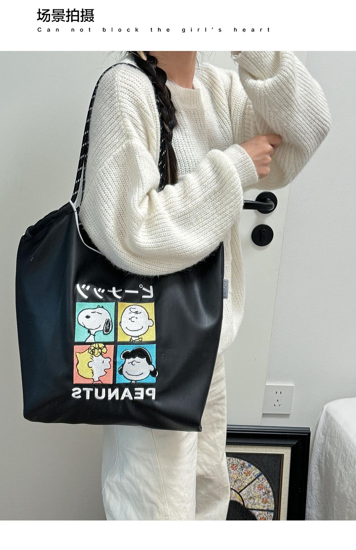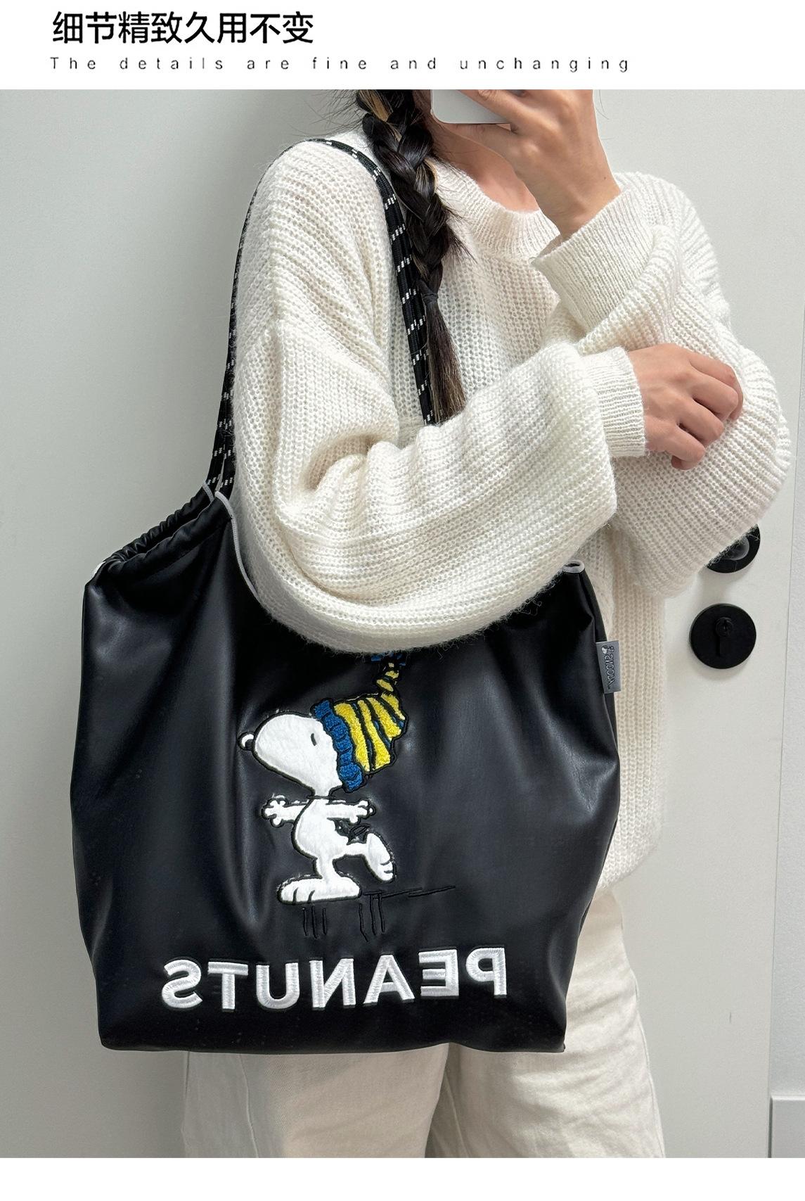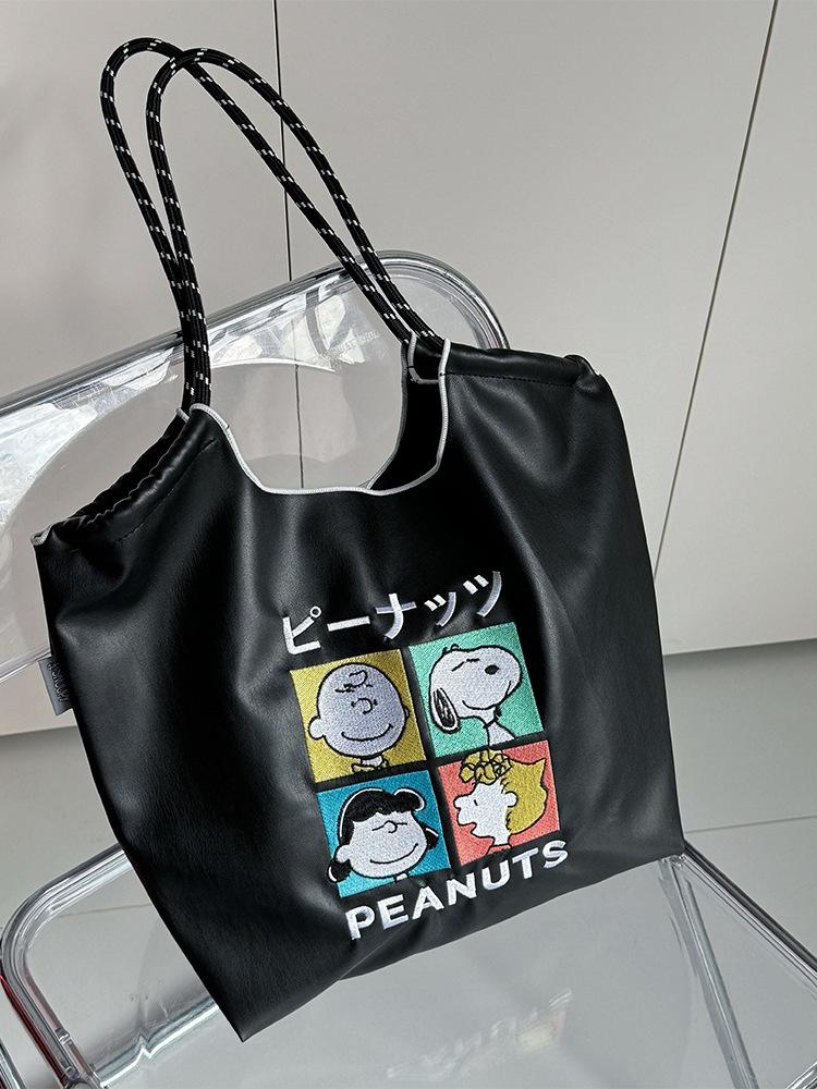 2025 Nuevo Bolso Tote de PU para Mujer de Gran Capacidad Negro Bolso de Hombro Cruzado Snoopy Lindo Bordado Bolso de Compras
