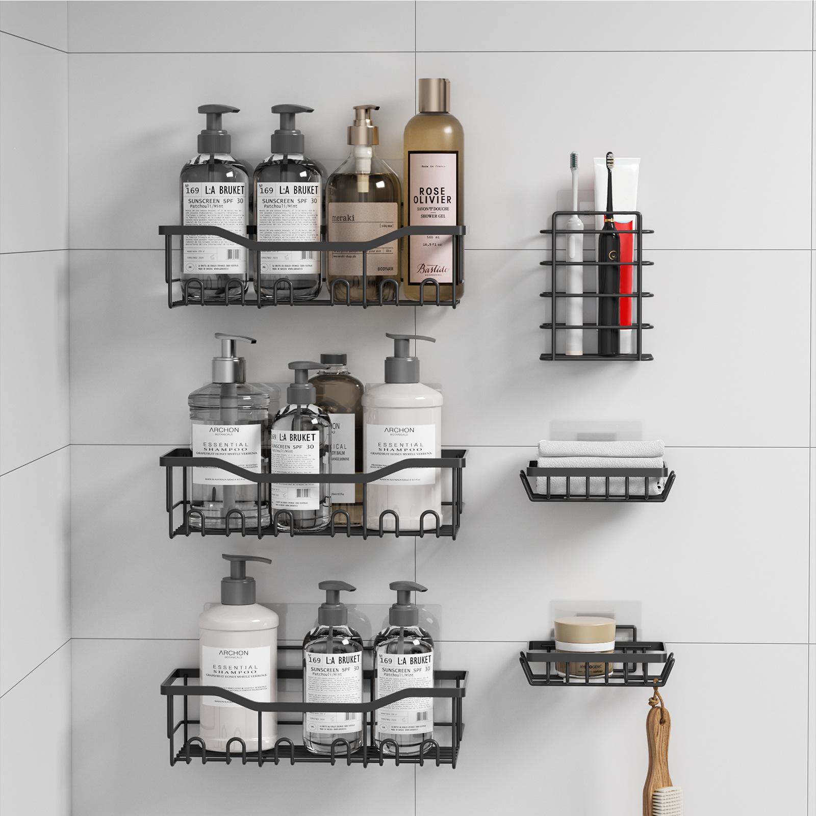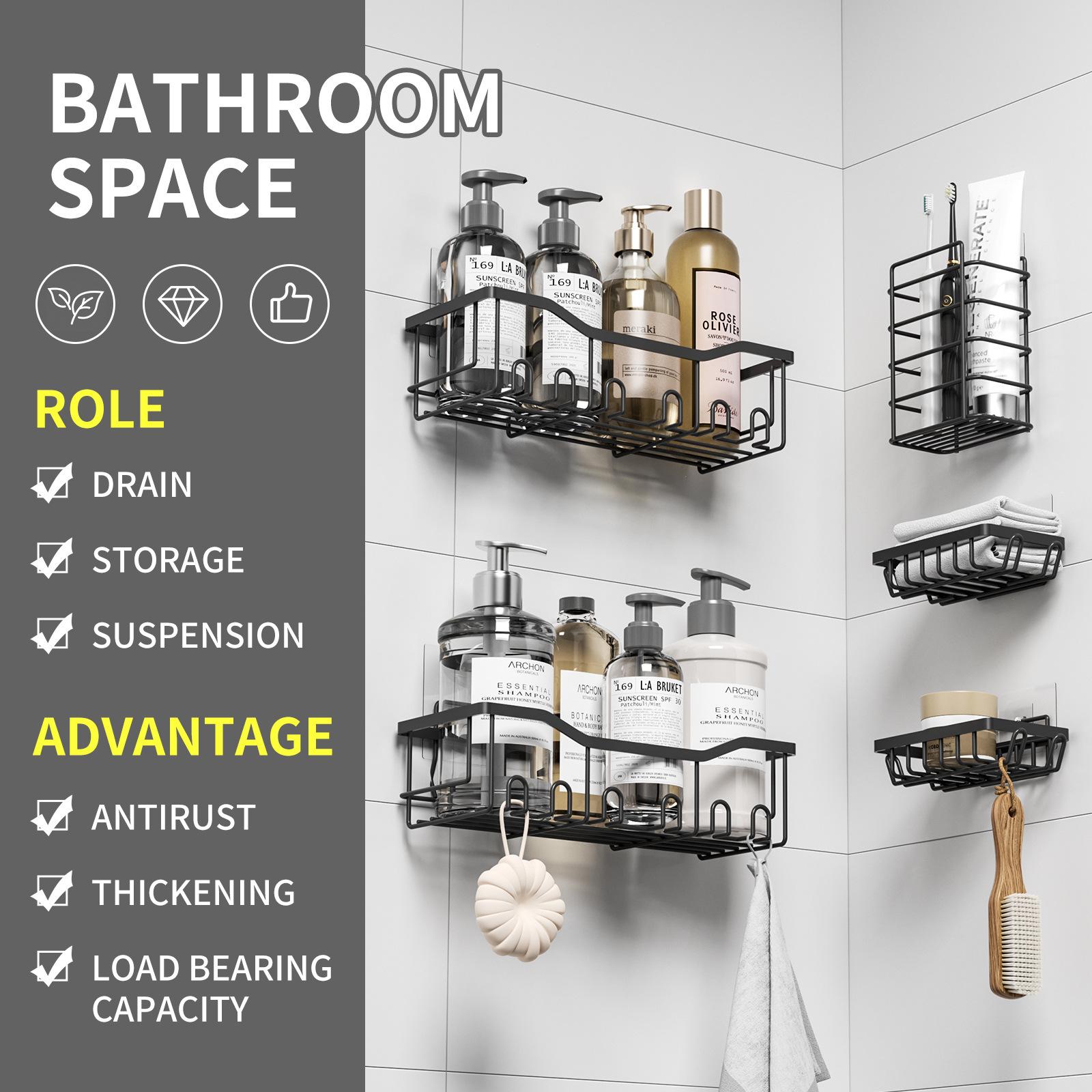 Black storage rack 5-piece set (2 6-hook baskets + 2 soap dishes + 1 toothbrush holder)