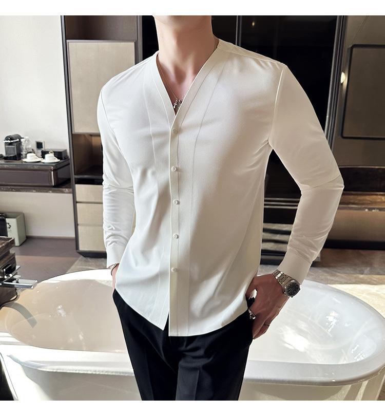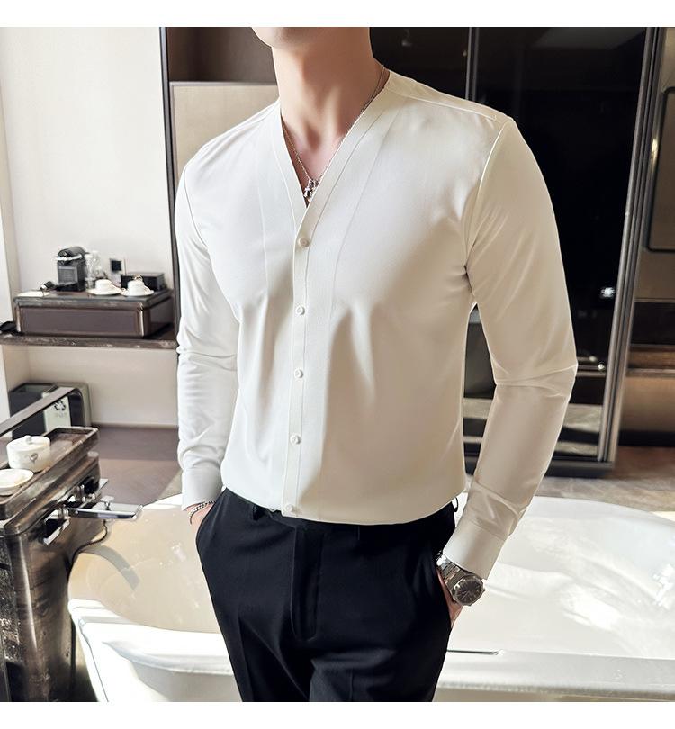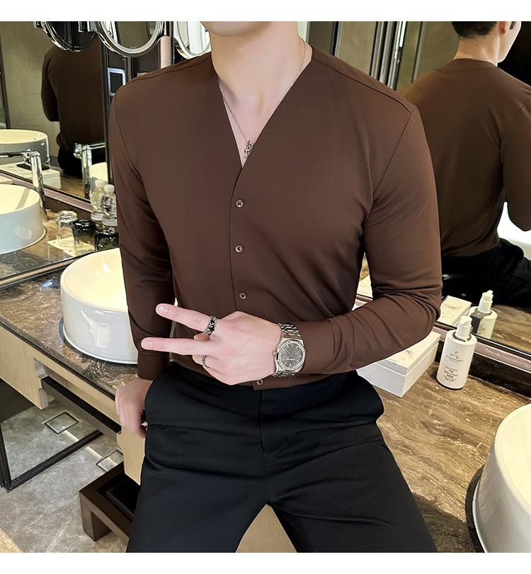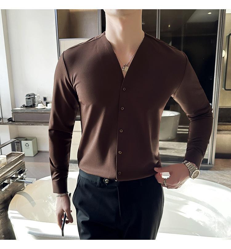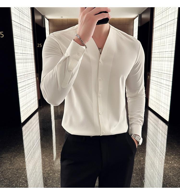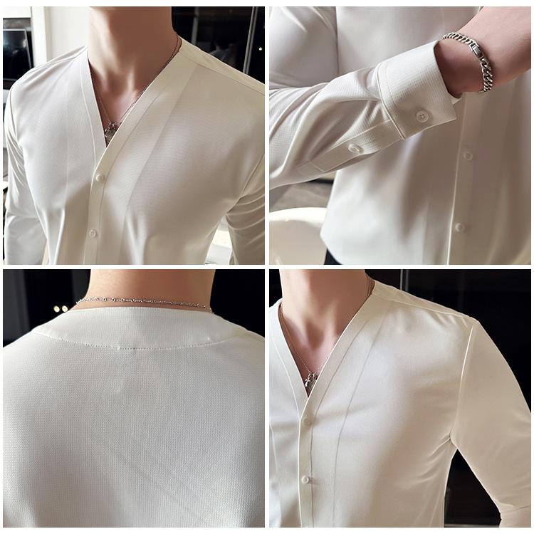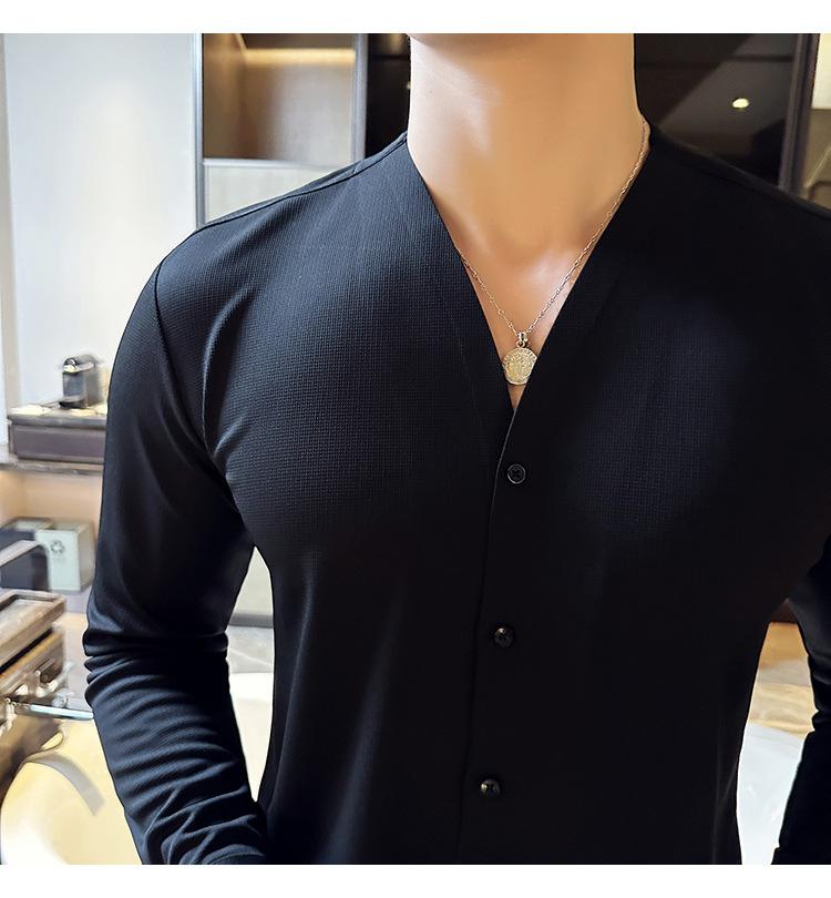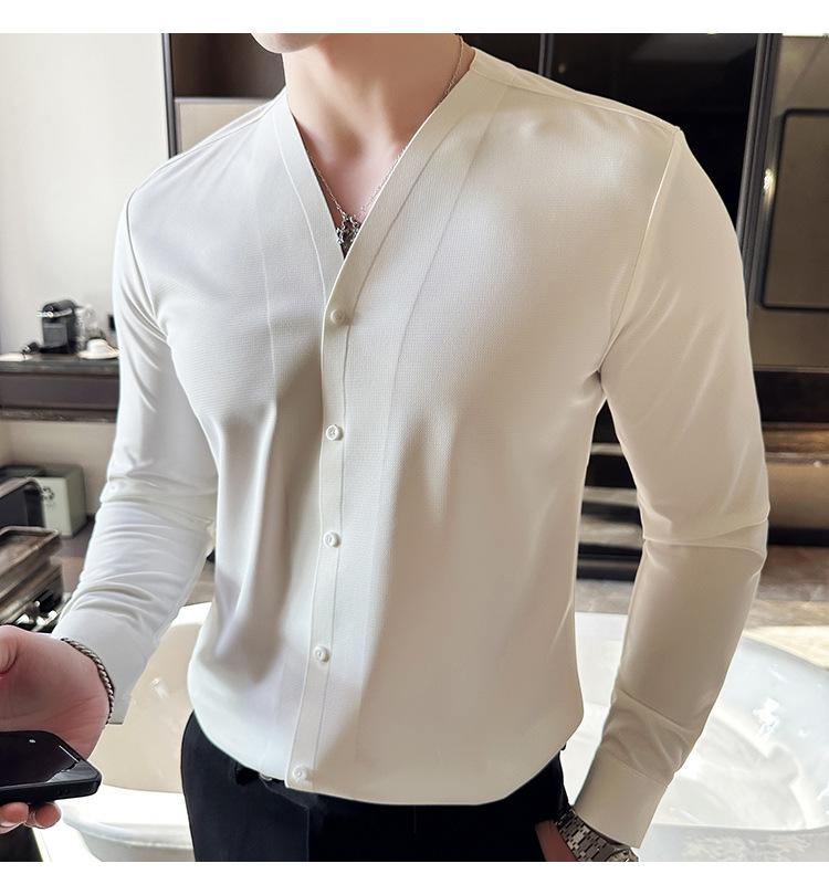 Camisa de manga larga para hombre 2023, camisa de cuello en V con diseño de gofre de alta calidad, camisa sin cuello con drapeado adhesivo sin costuras de manga larga para hombre