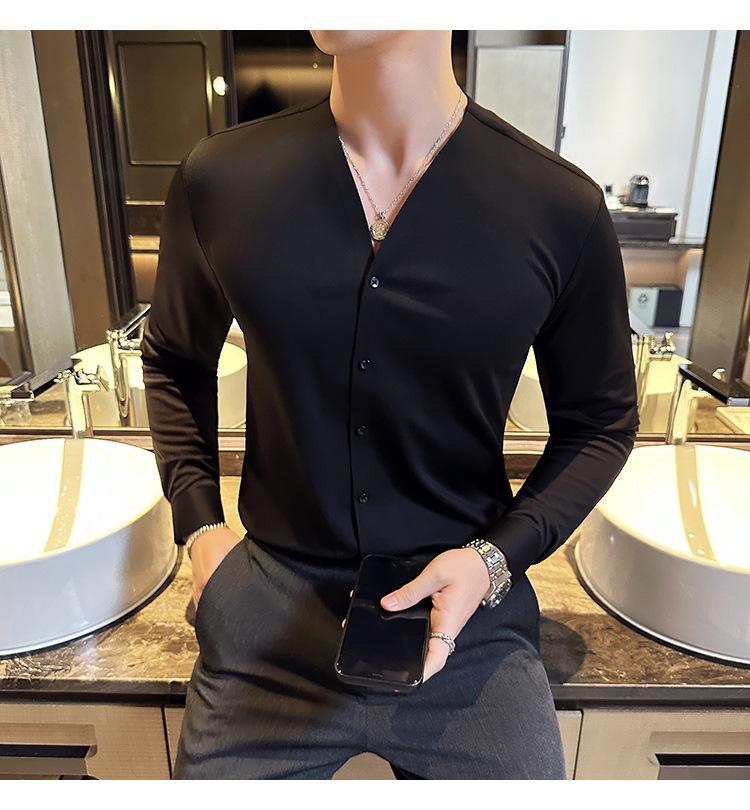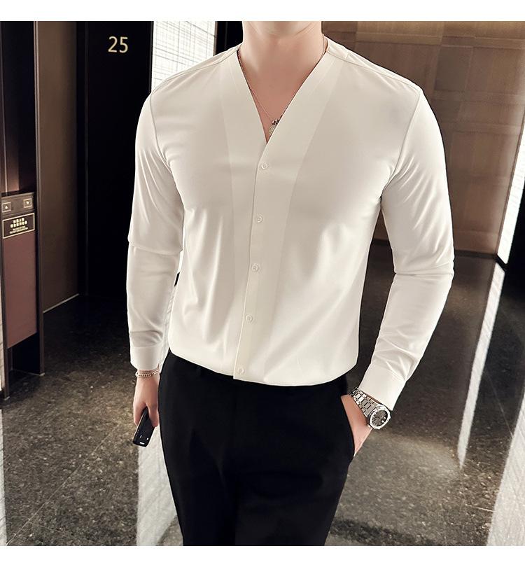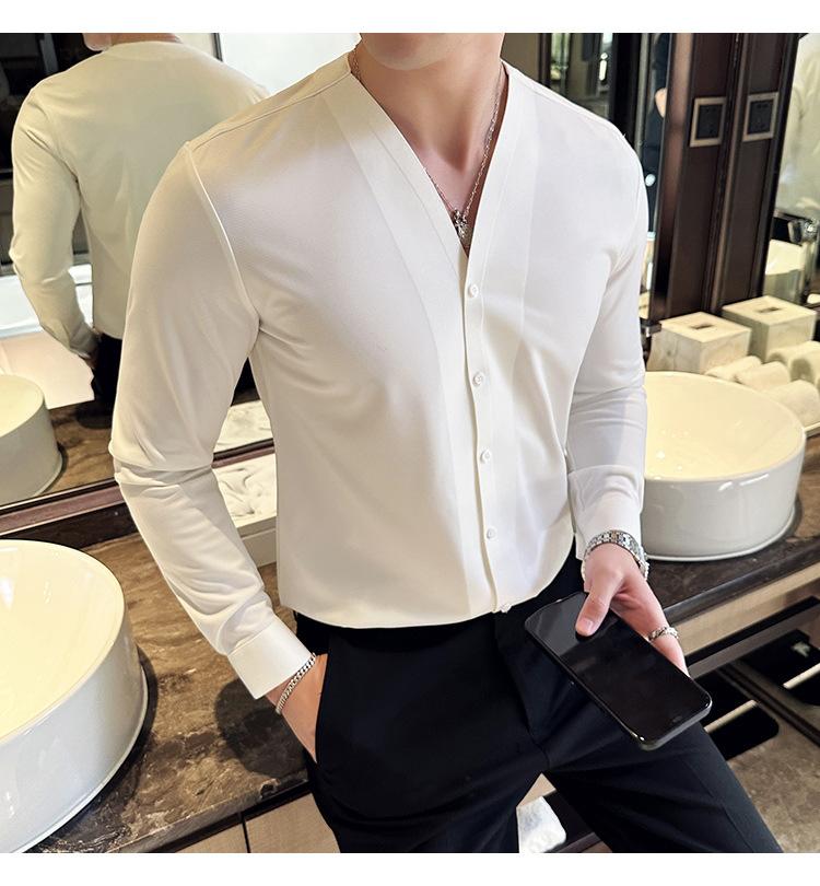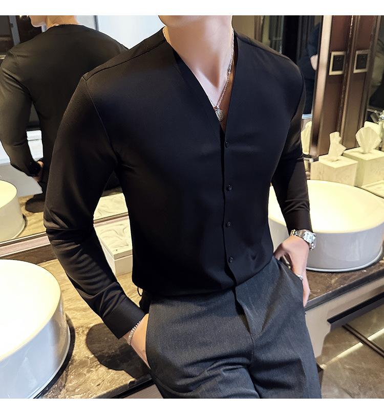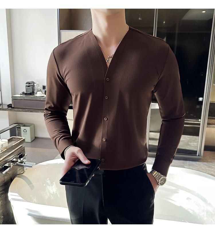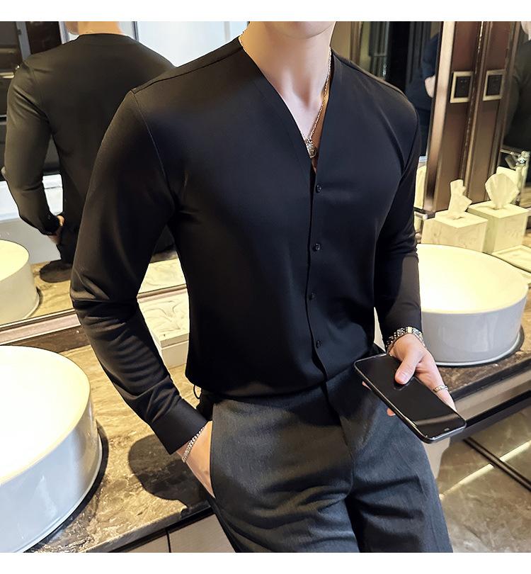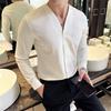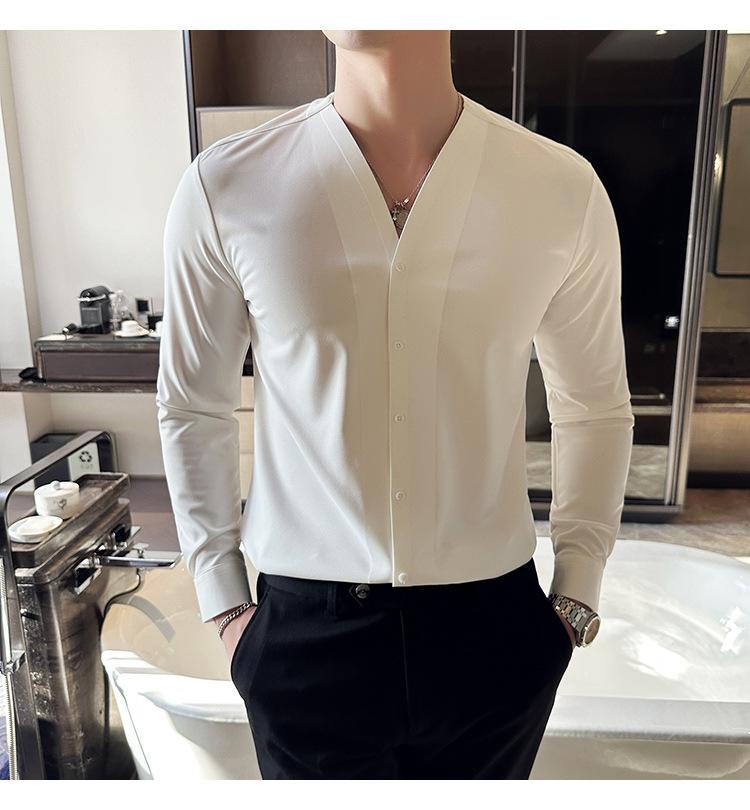 Camisa de manga larga para hombre 2023, camisa de cuello en V con diseño de gofre de alta calidad, camisa sin cuello con drapeado adhesivo sin costuras de manga larga para hombre