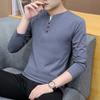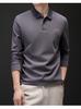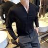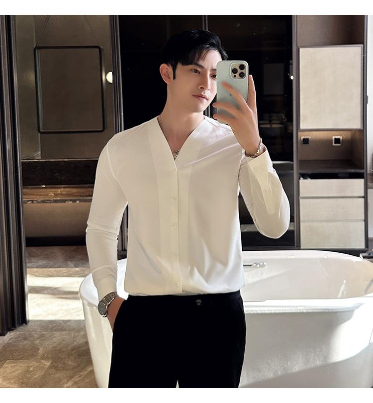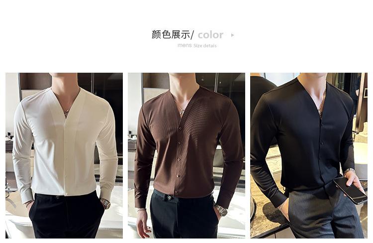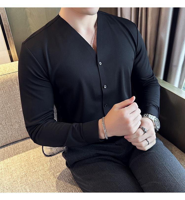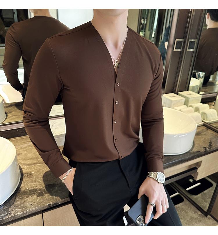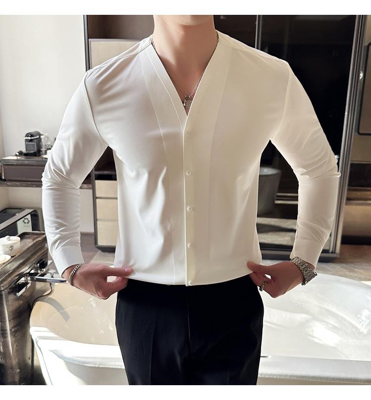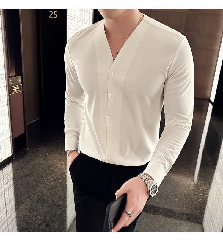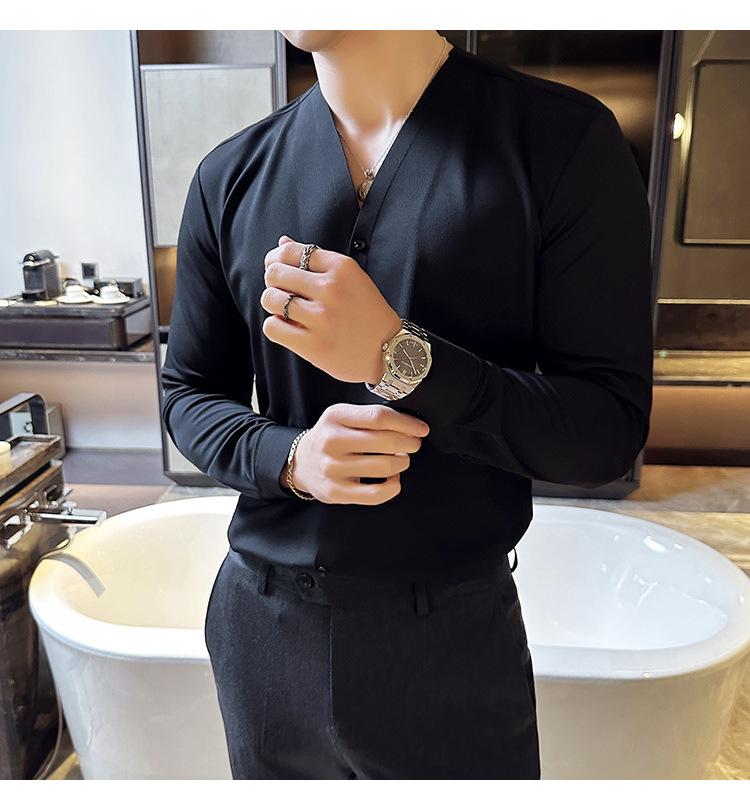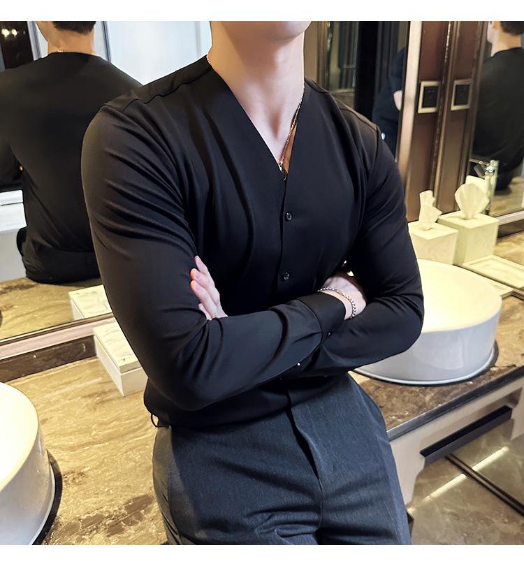 Camisa de manga larga para hombre 2023, camisa de cuello en V con diseño de gofre de alta calidad, camisa sin cuello con drapeado adhesivo sin costuras de manga larga para hombre