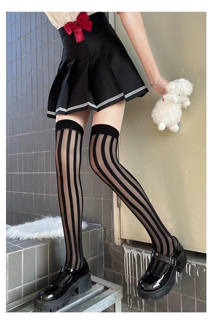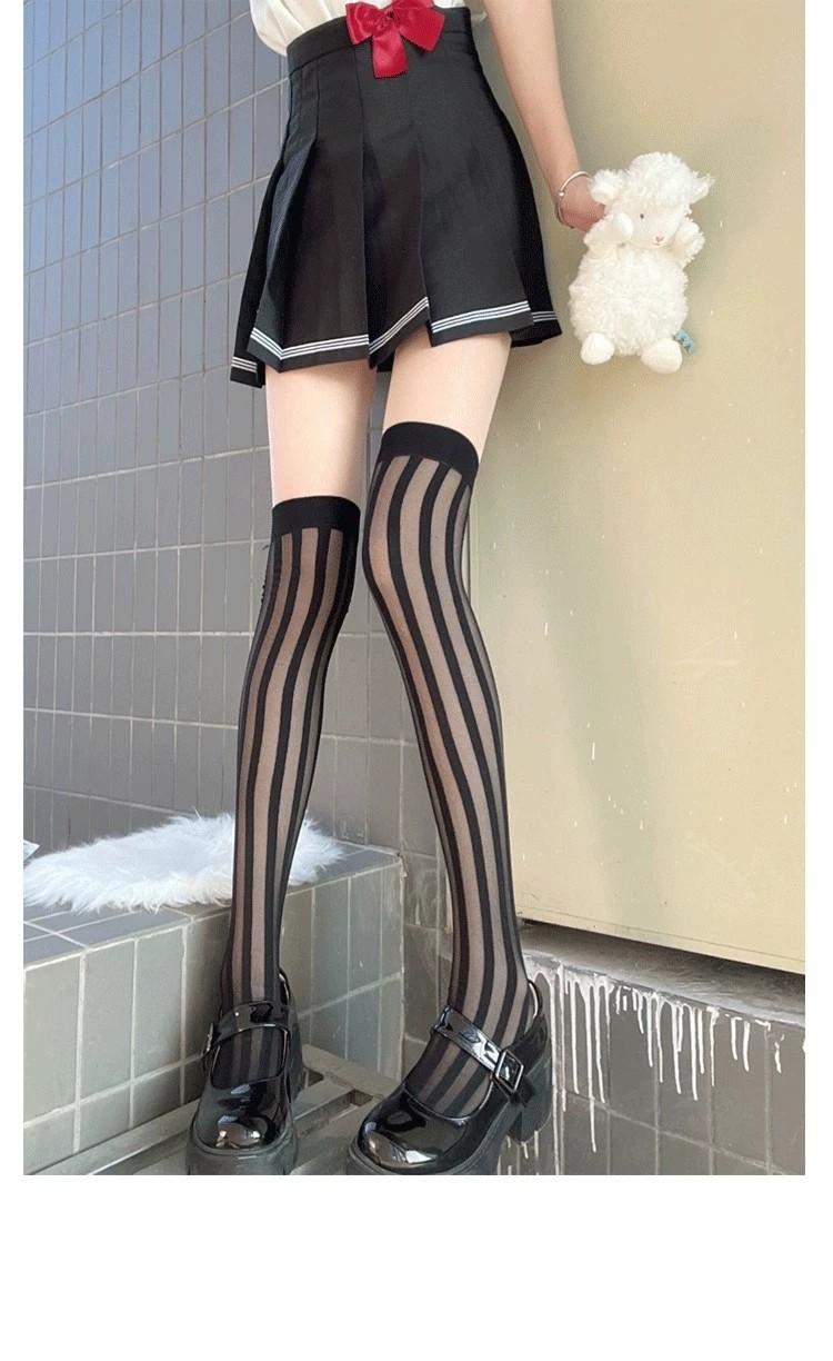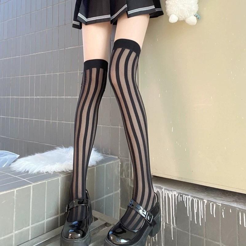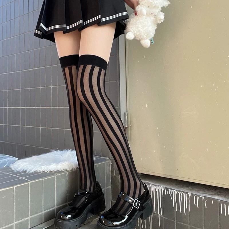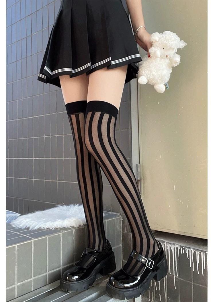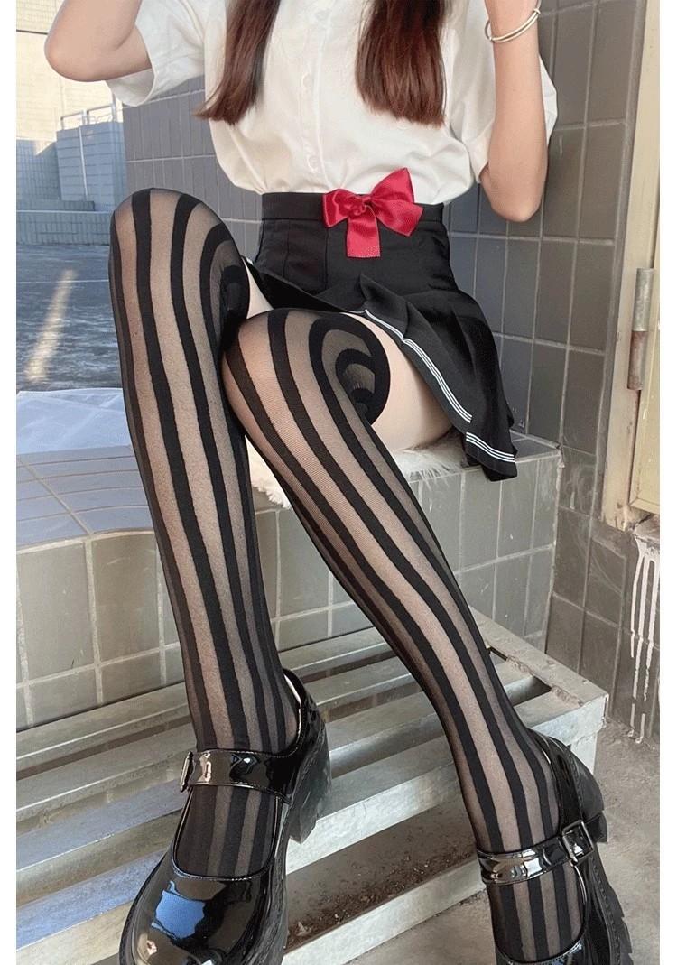 Primavera y Verano Raya Vertical Oscura Negro Jacquard de Seda Elástico Medias Altas Medias hasta la Cadera Medias por Encima de la Rodilla Sesión de Fotos Callejera Japonesa Uniforme JK