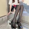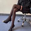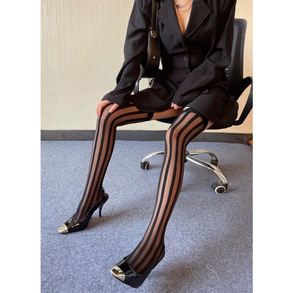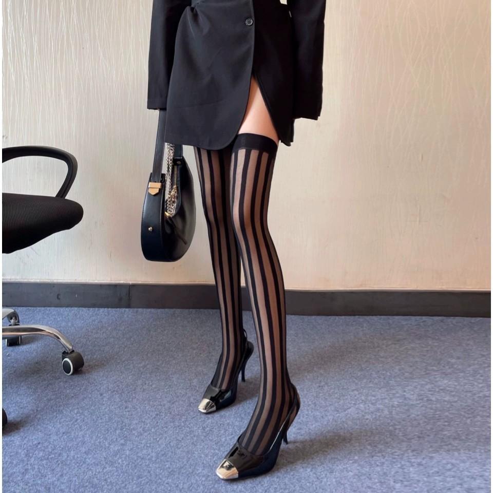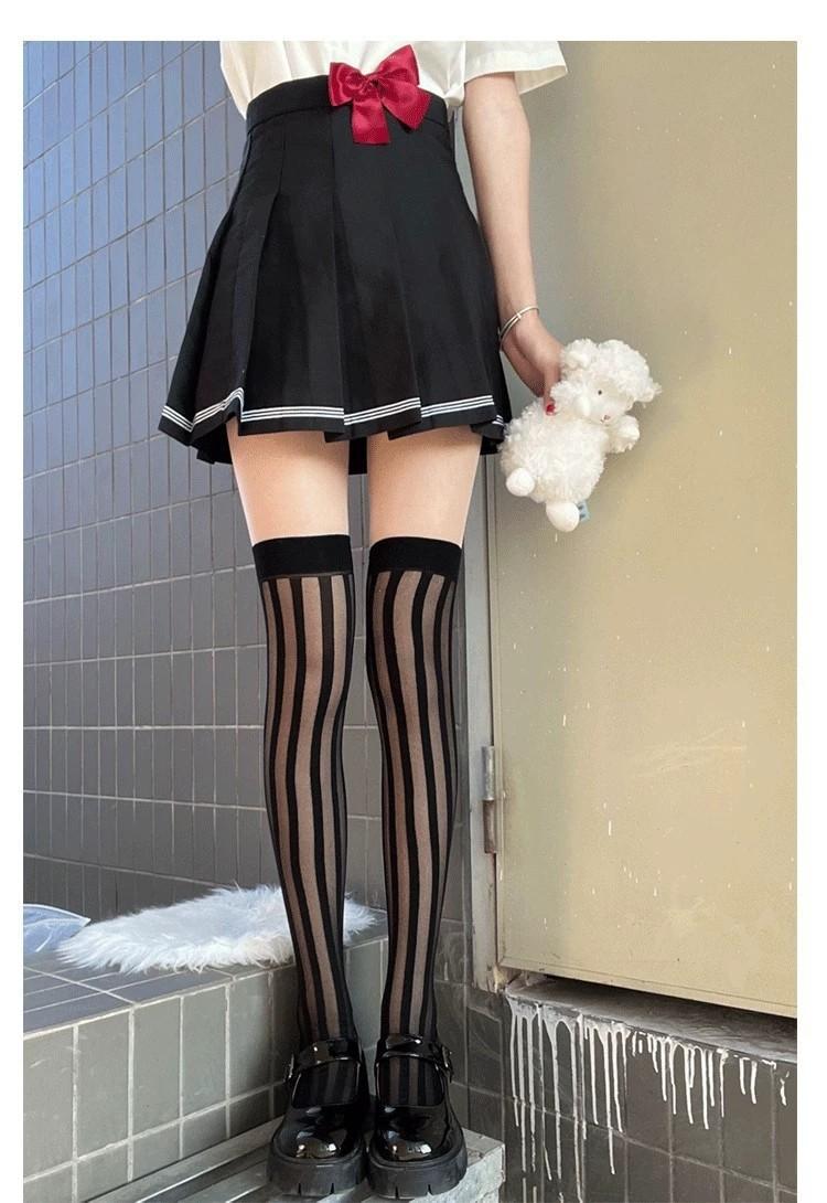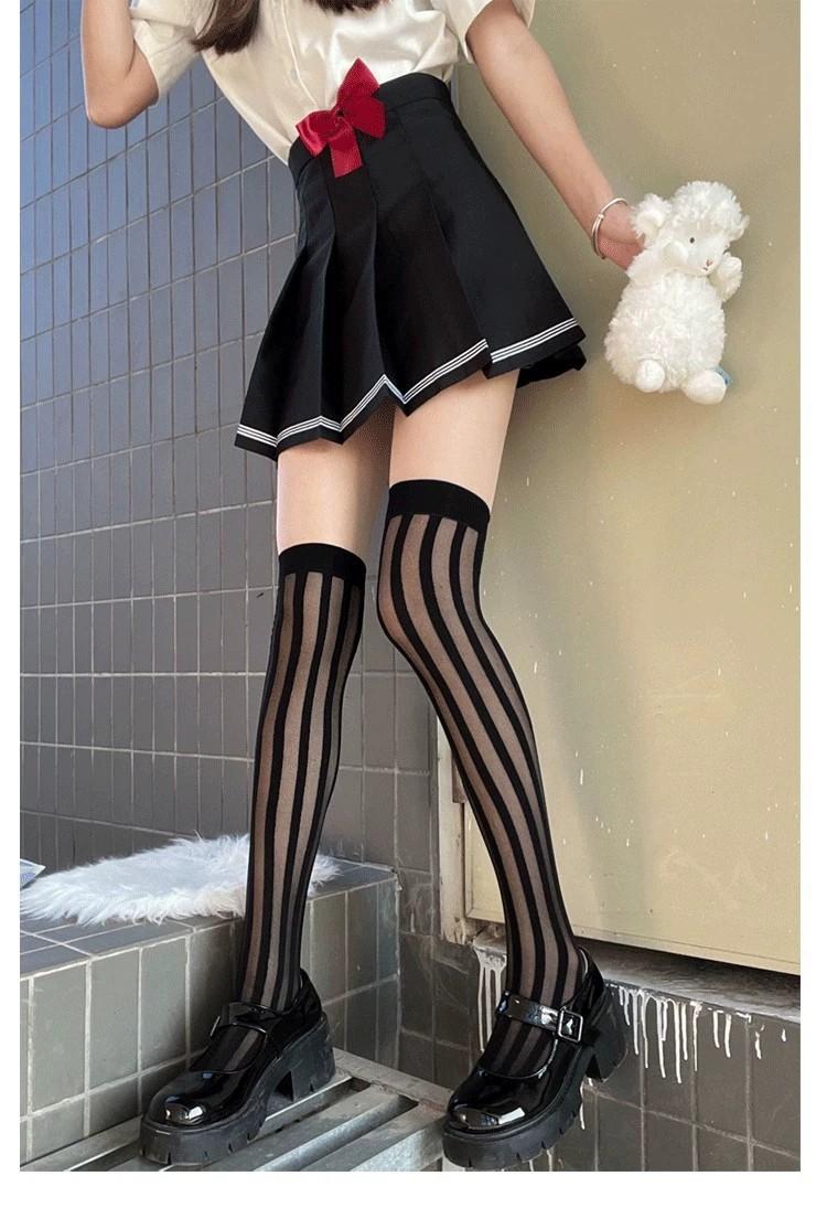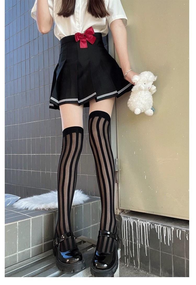 Primavera y Verano Raya Vertical Oscura Negro Jacquard de Seda Elástico Medias Altas Medias hasta la Cadera Medias por Encima de la Rodilla Sesión de Fotos Callejera Japonesa Uniforme JK