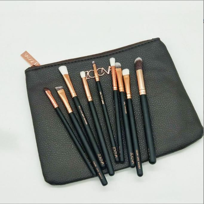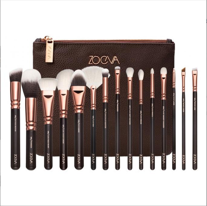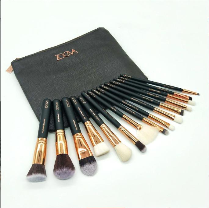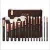 Brocha de maquillaje marrón brillante con bolsa, disponible en 15 unidades, para rubor, base y maquillaje profesional de comercio exterior.
