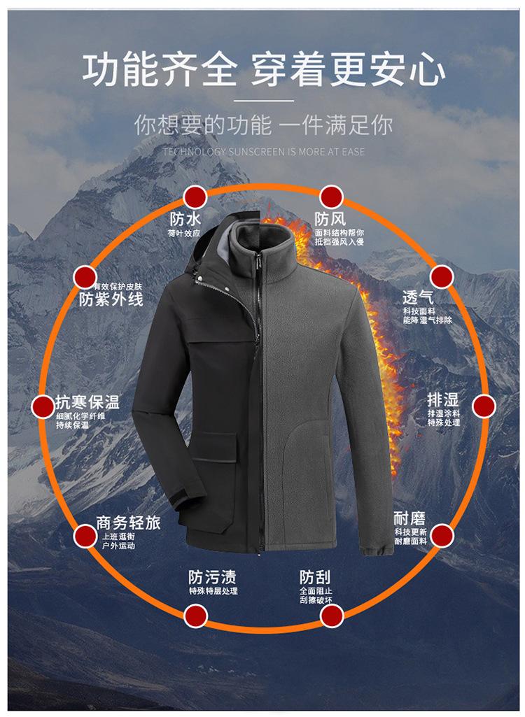 Ropa de asalto polar tres en uno, ropa para exteriores, ropa Parker, ropa de montañismo a prueba de viento, impresión de logotipo personalizado y bordado.