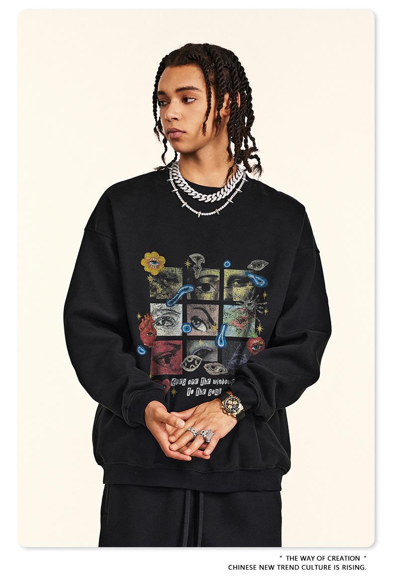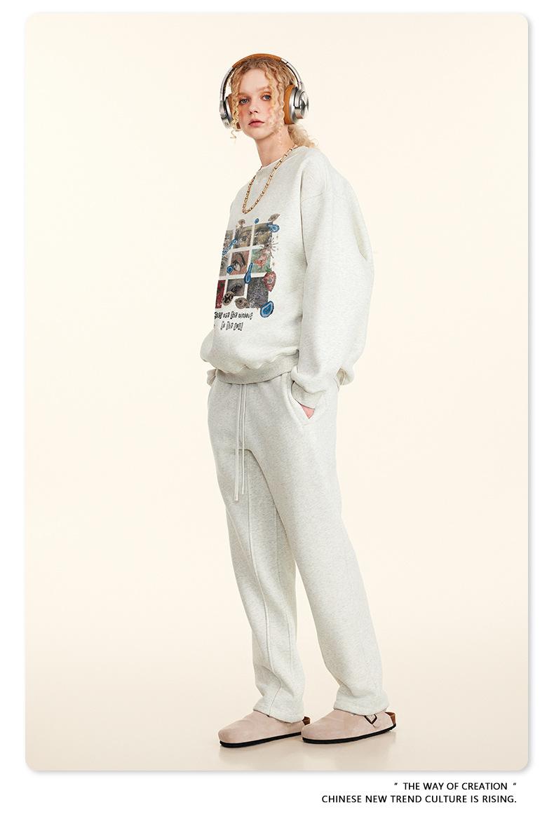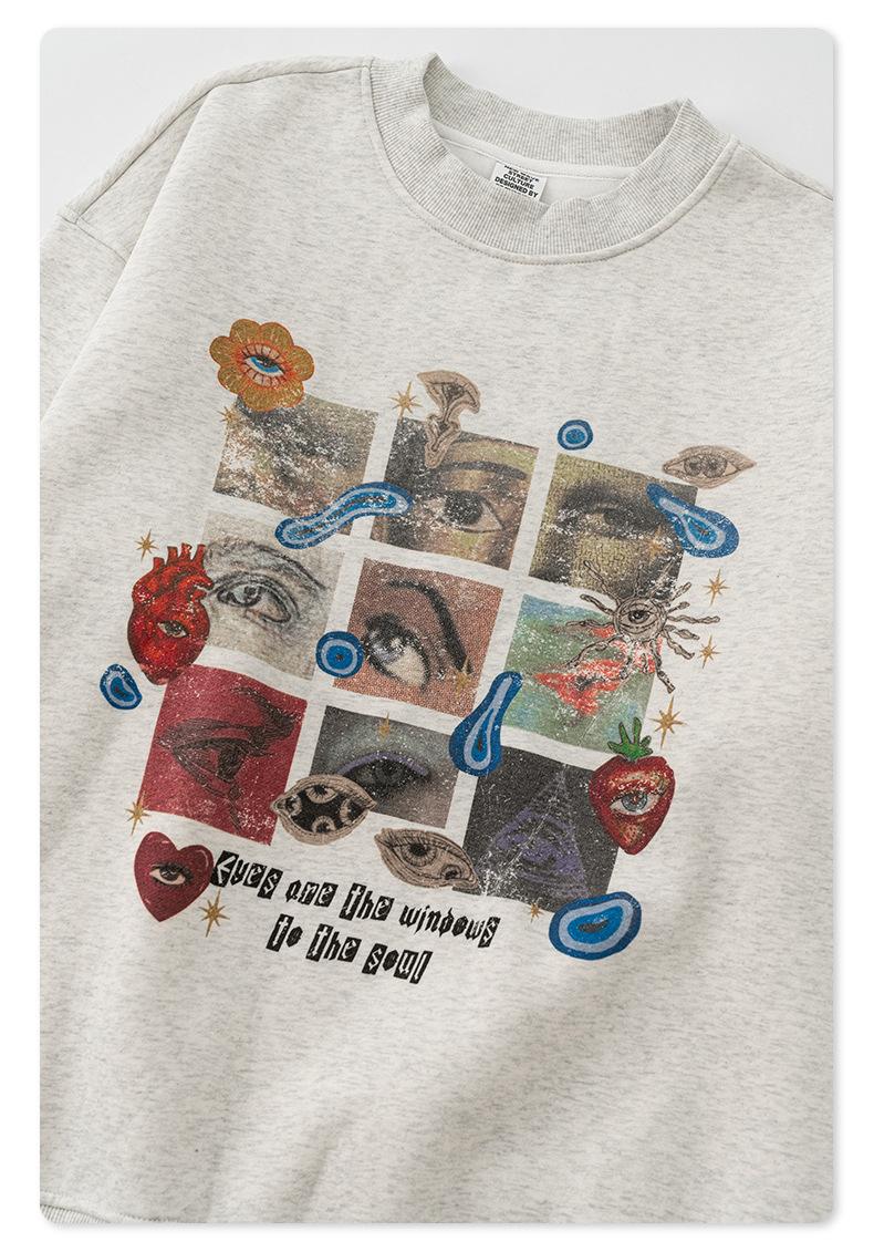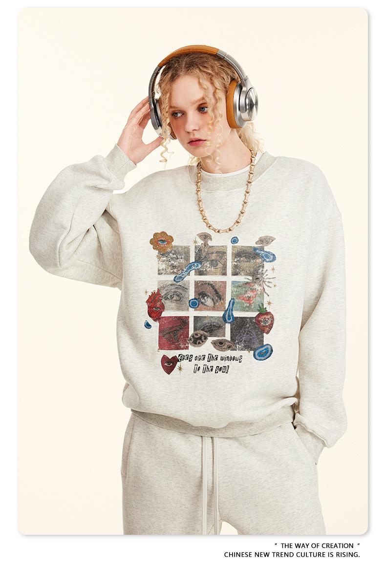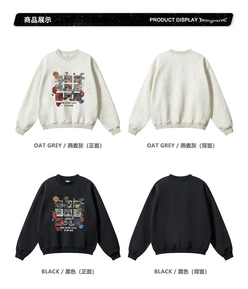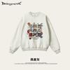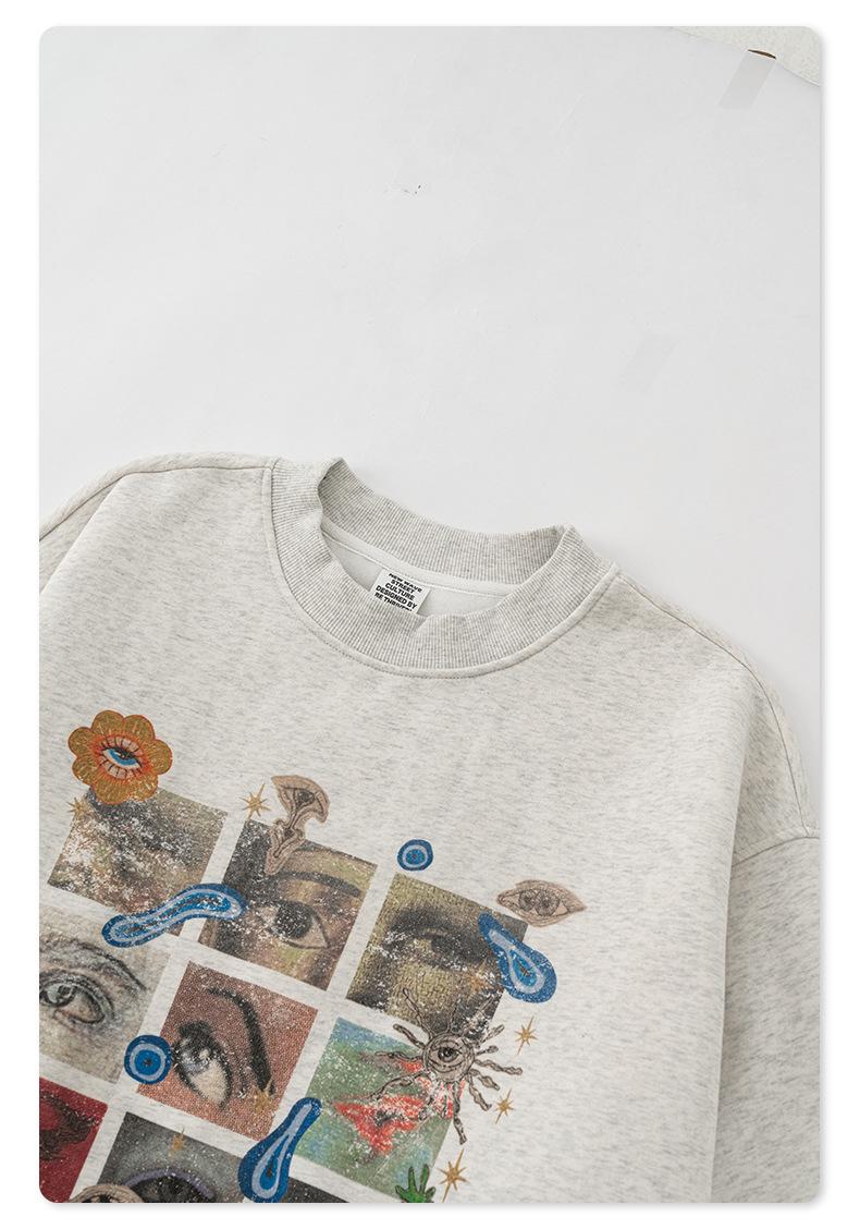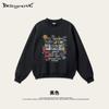 2025 Otoño Chic Retro Americano Top de Manga Descubierta Suelto con Forro Polar Grueso Estampado por Inyección Directa Sudadera de Cuello Redondo para Hombre