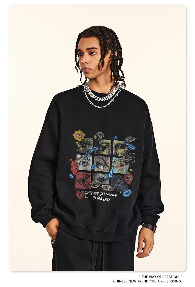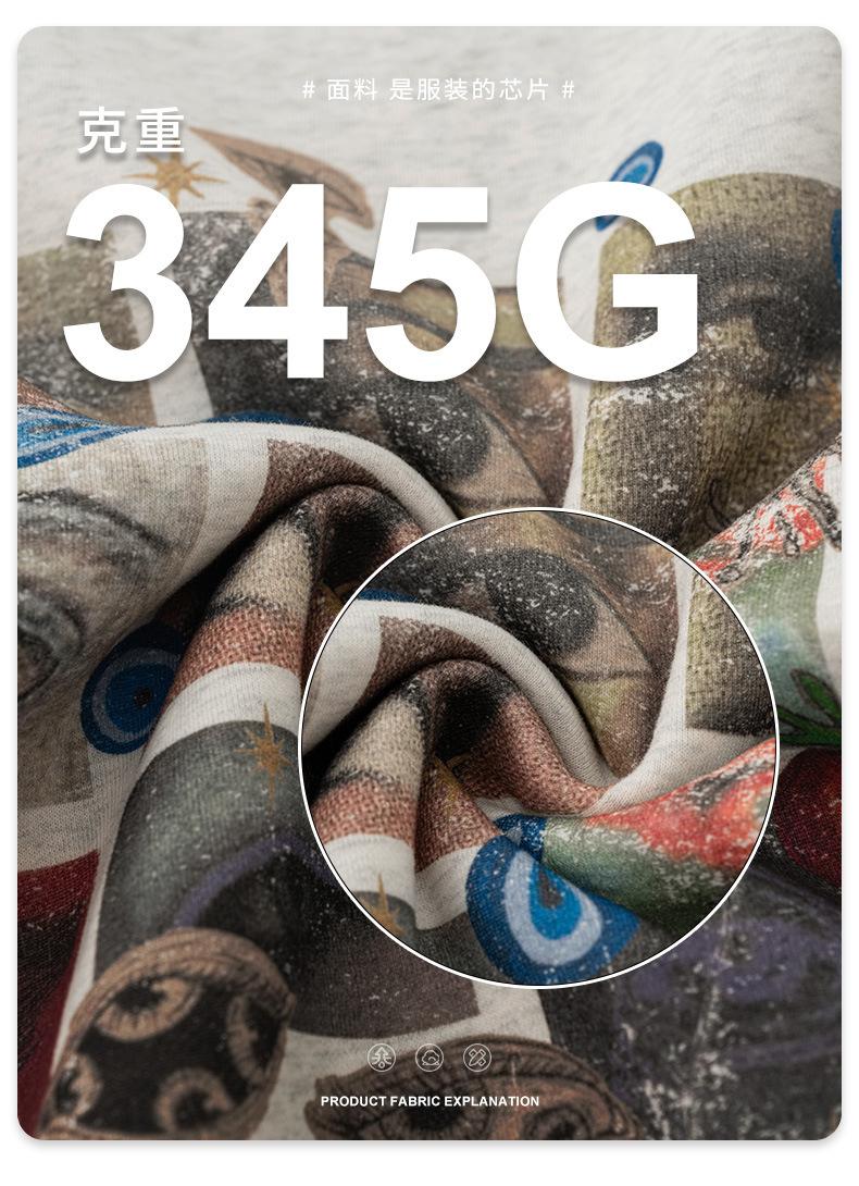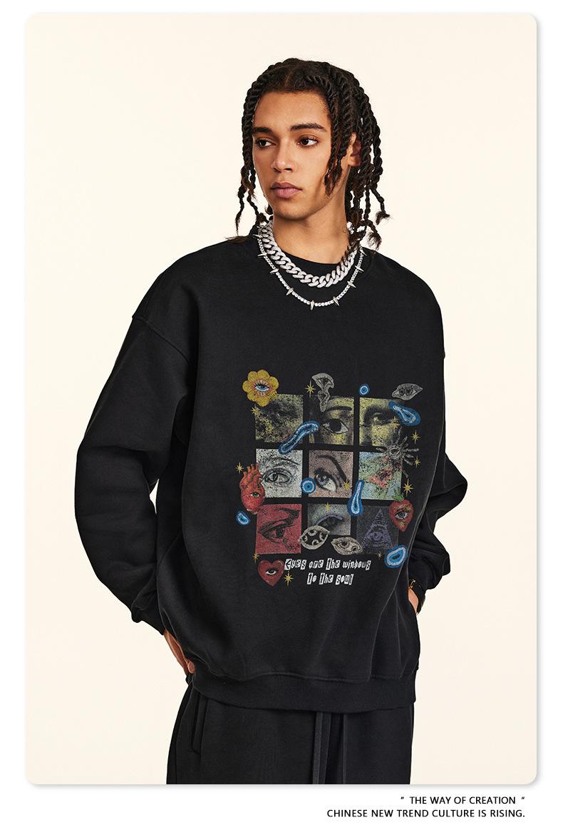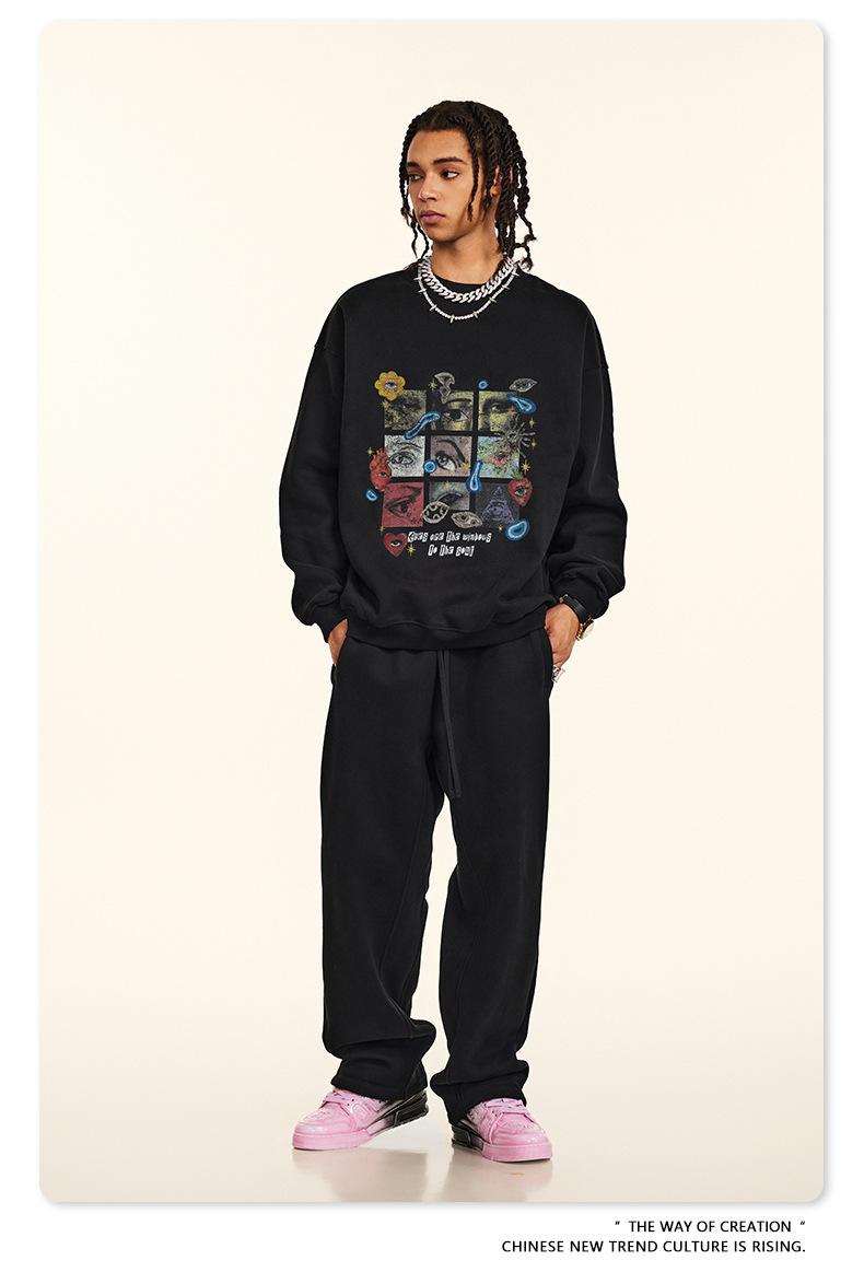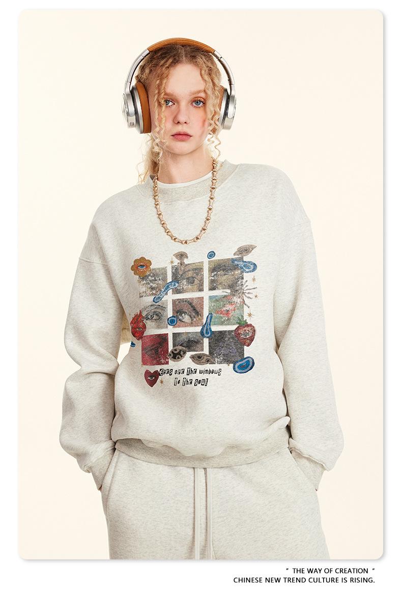 2025 Otoño Chic Retro Americano Top de Manga Descubierta Suelto con Forro Polar Grueso Estampado por Inyección Directa Sudadera de Cuello Redondo para Hombre