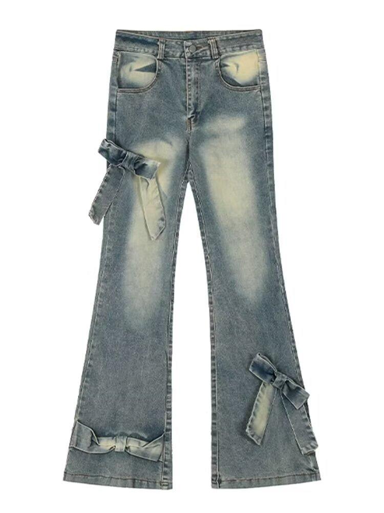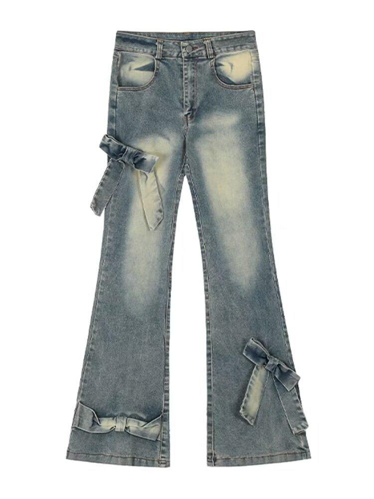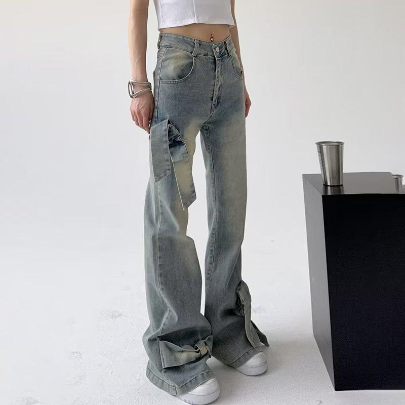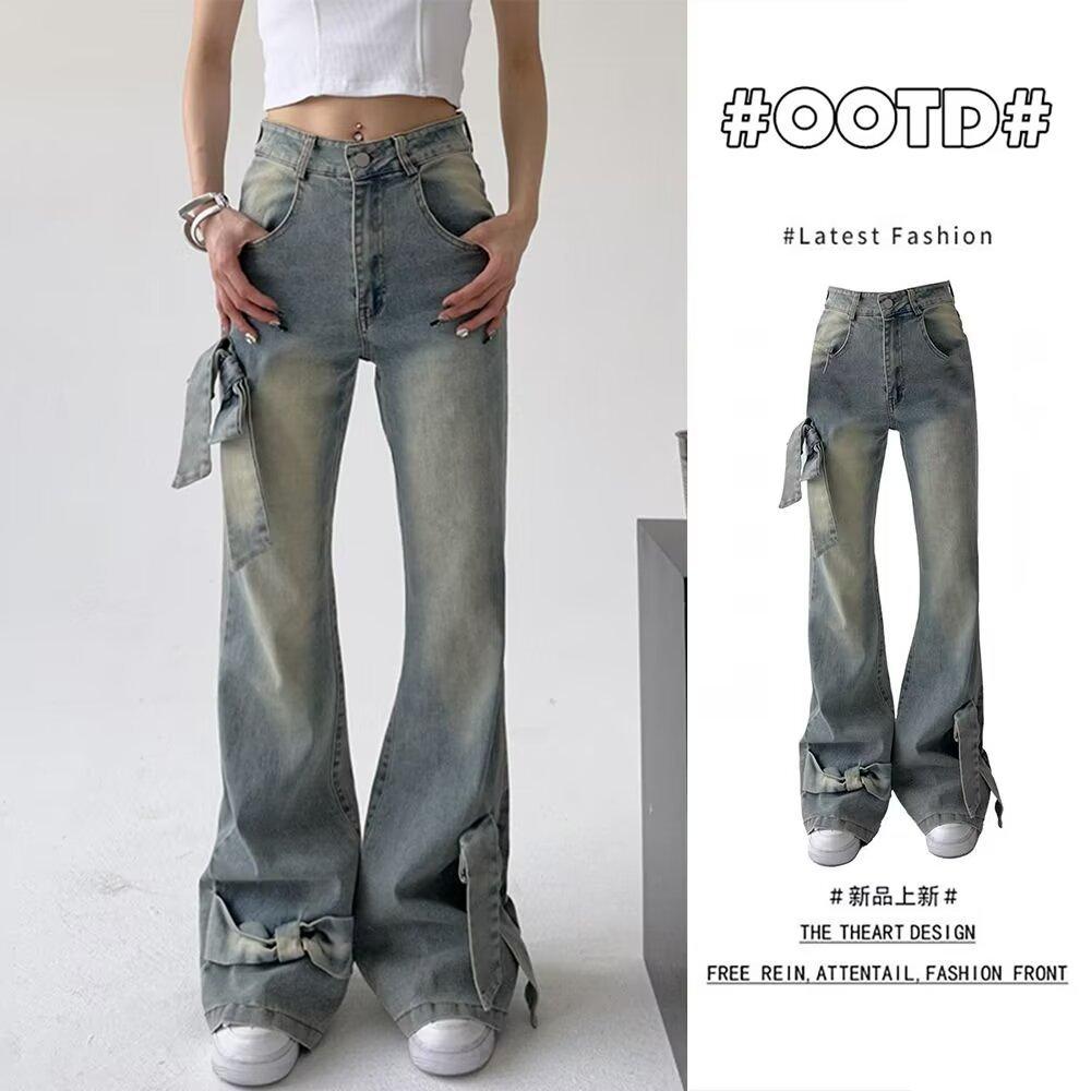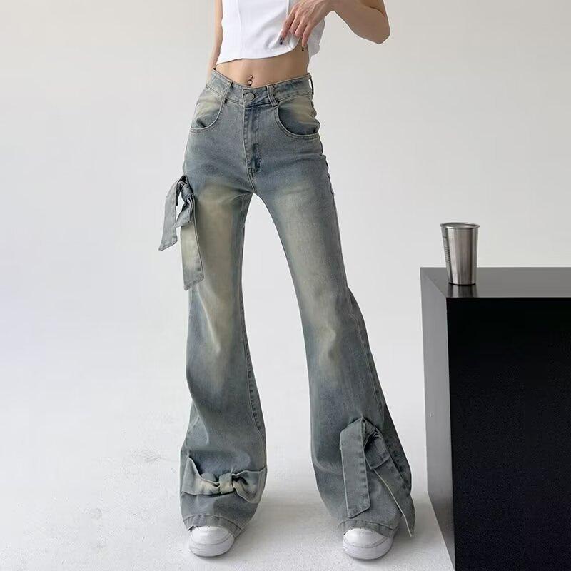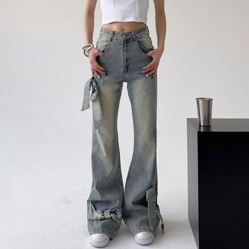 Compra Pantalones vaqueros retro de microlargo estilo americano para mujer, de primavera y otoño, con diseño adelgazante de cintura alta y lazo, con diseño de herradura de calle. al por mayor en Joom.pro