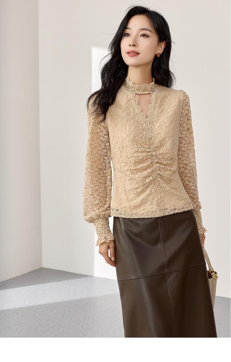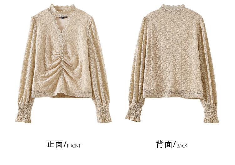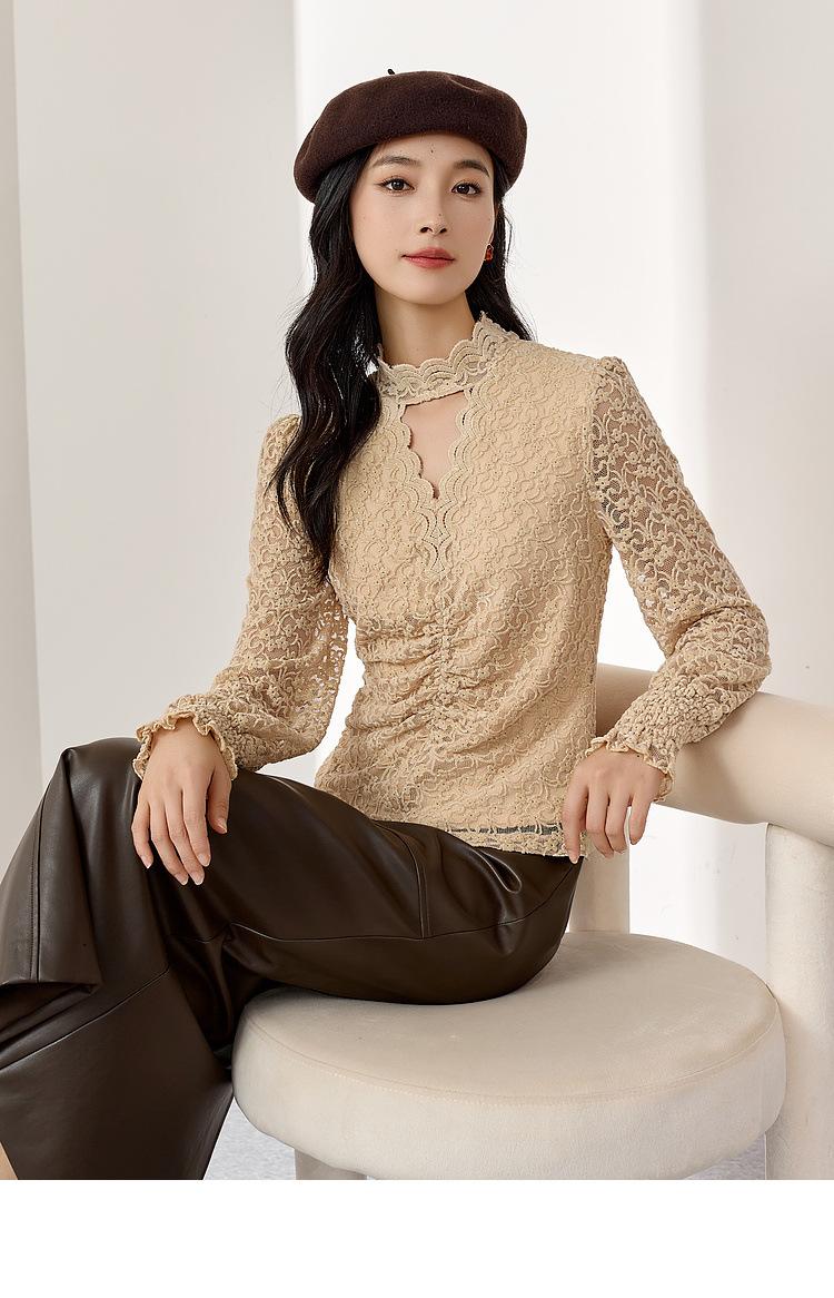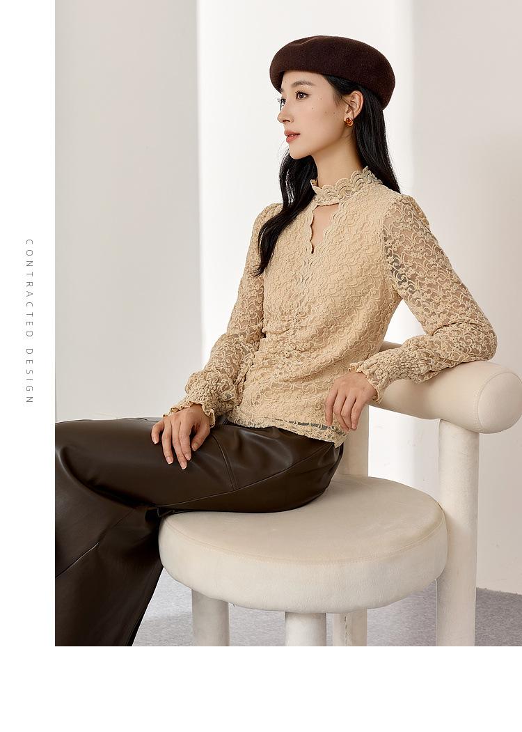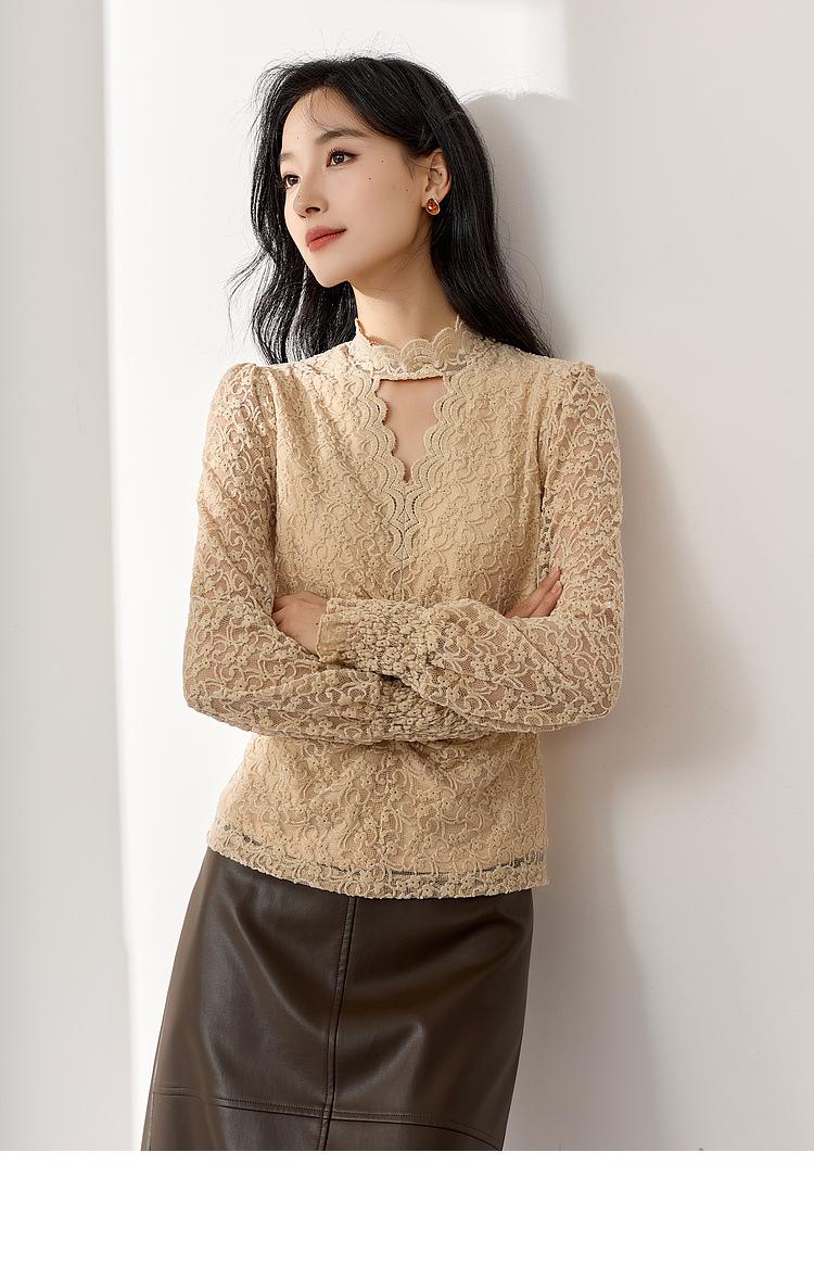 Zhen Xi Nueva Camisa de Encaje Calada con Cuello y Manga Larga para Mujer, Moda Casual con Perspectiva de Encaje Polar SQ102