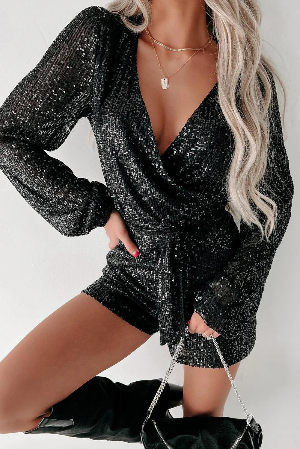 2025 nuevo vestido europeo y americano transfronterizo de Amazon directo para fiesta de vacaciones de moda con lentejuelas de manga larga y shorts de una pieza