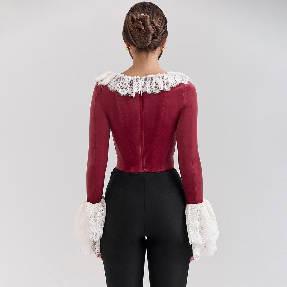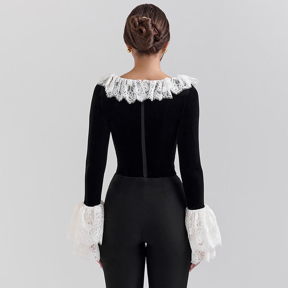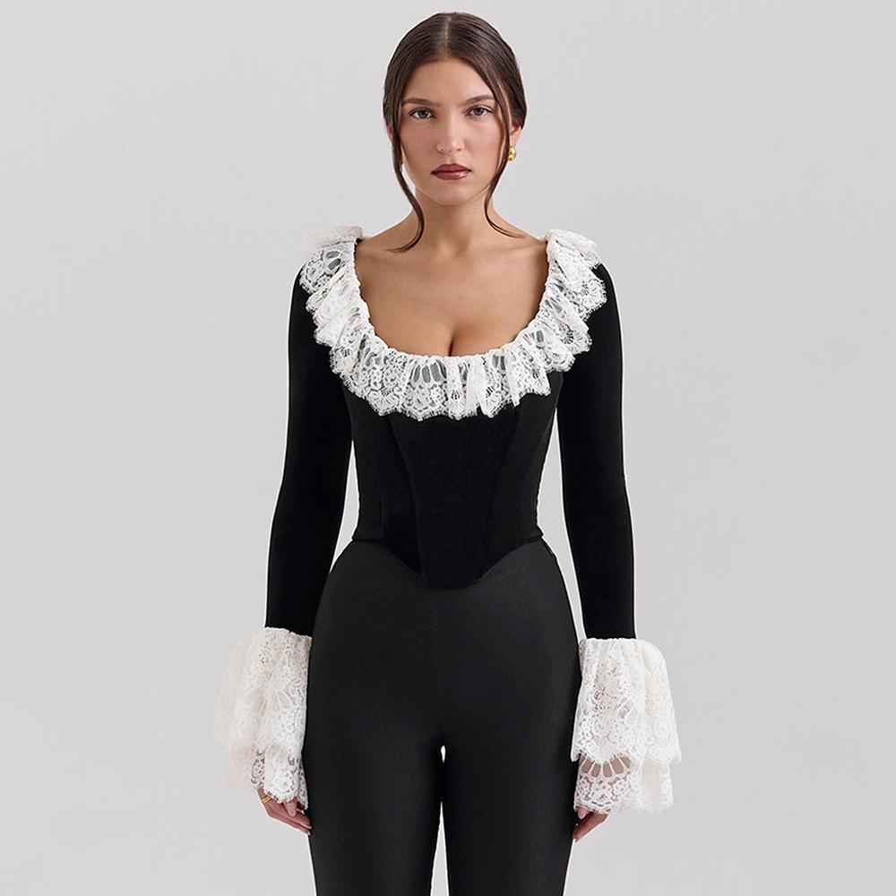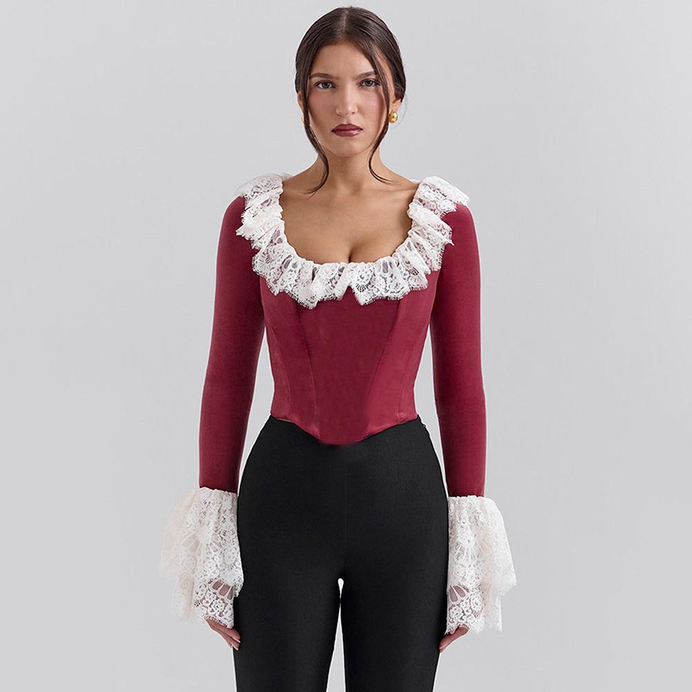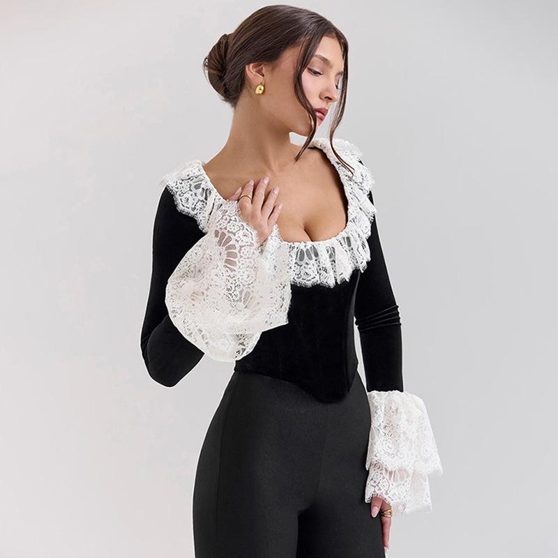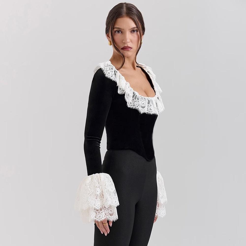 Nuevo otoño e invierno 2024 transfronterizo, camiseta de encaje con cuello cuadrado y encaje, estilo europeo y americano, sexy, ajustada, manga trompeta