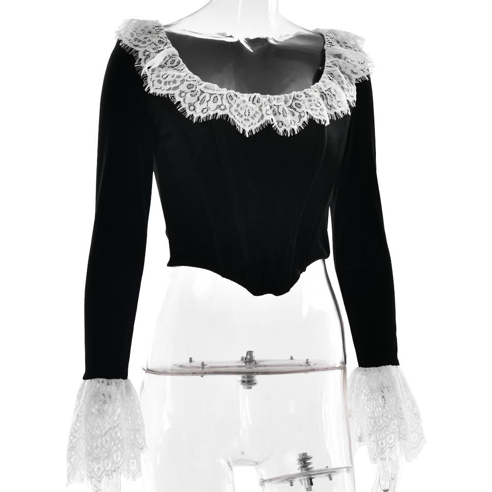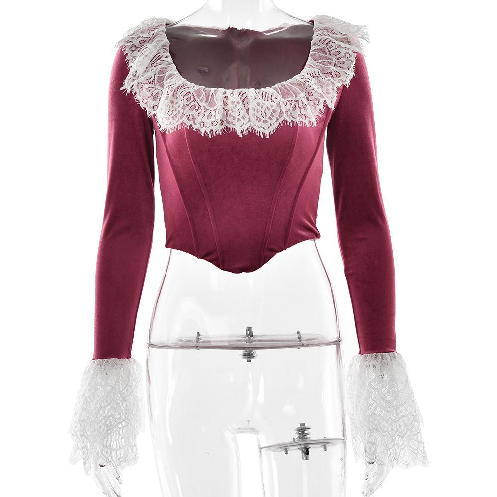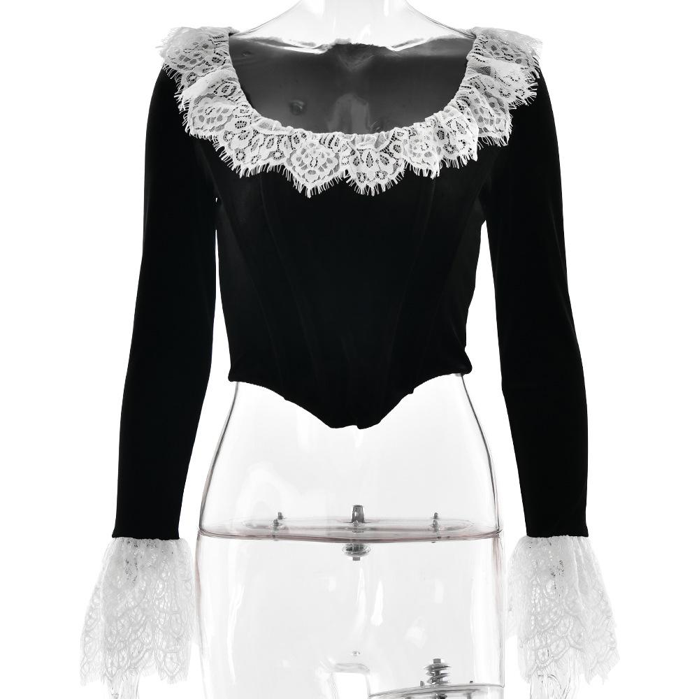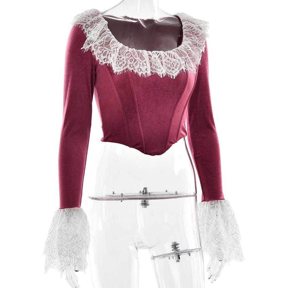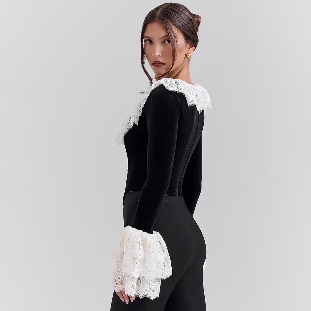 Nuevo otoño e invierno 2024 transfronterizo, camiseta de encaje con cuello cuadrado y encaje, estilo europeo y americano, sexy, ajustada, manga trompeta