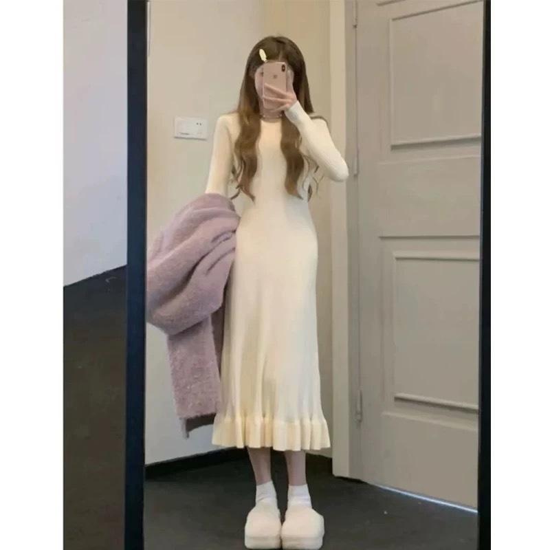 Vestido Elegante de Punto Estilo Francés Otoño e Invierno Nuevo Diseño Ajustado Manga Larga Largo Medio Base