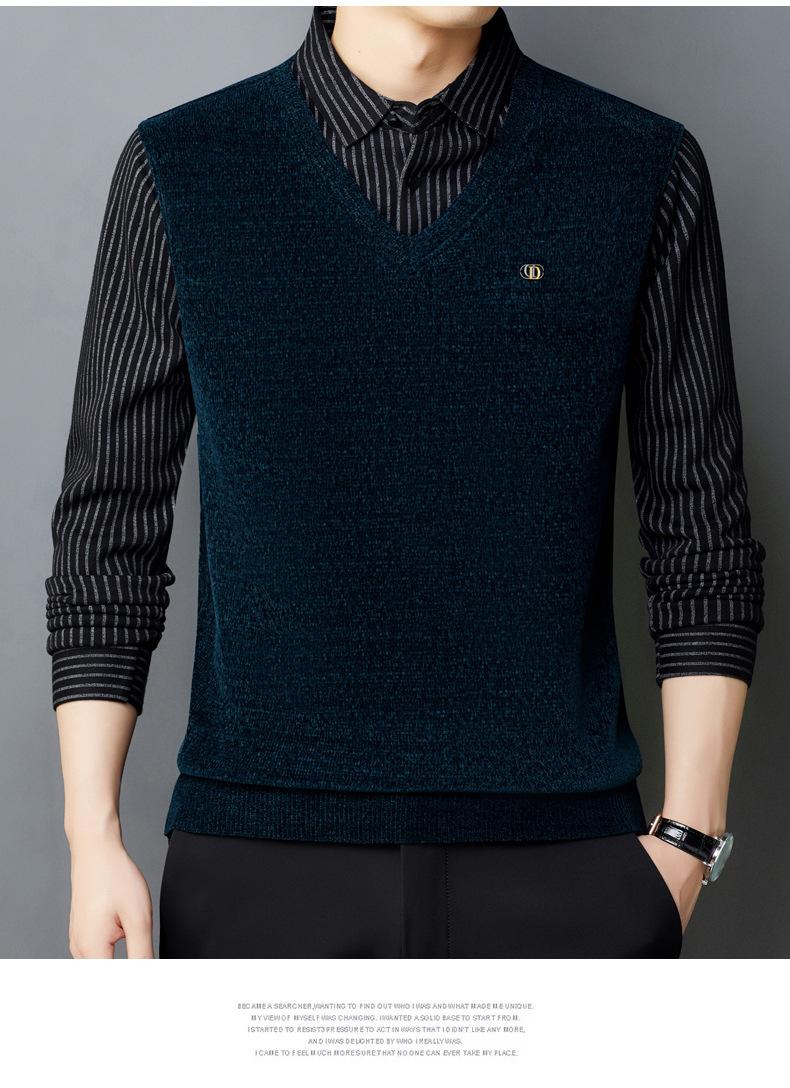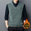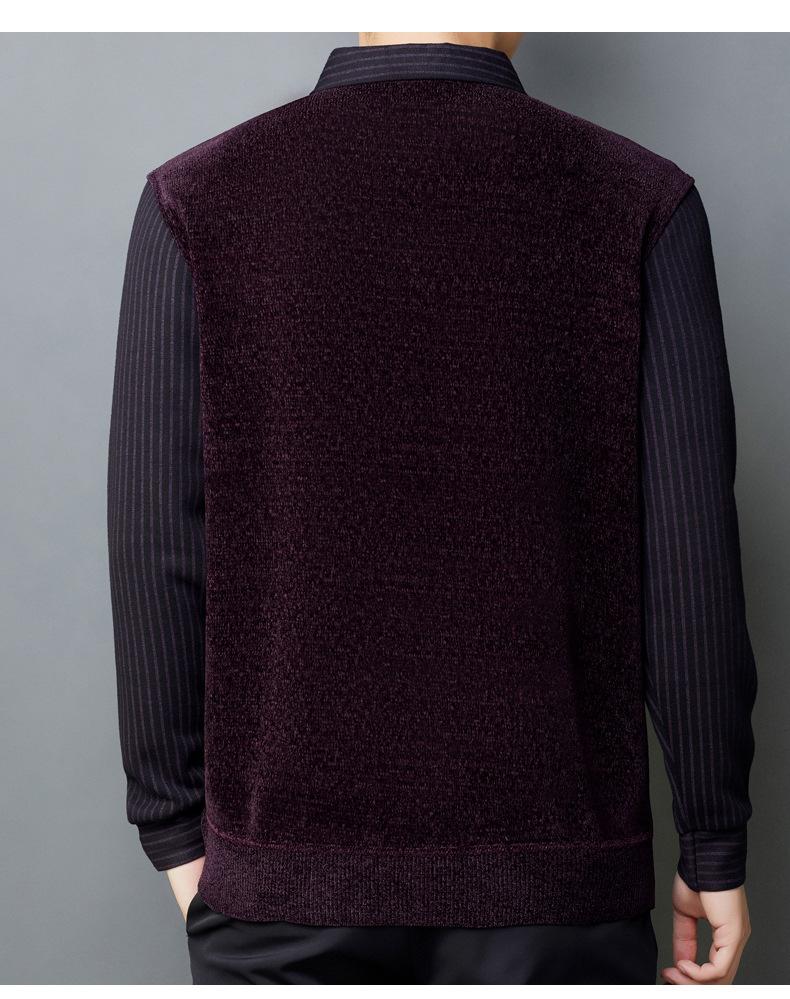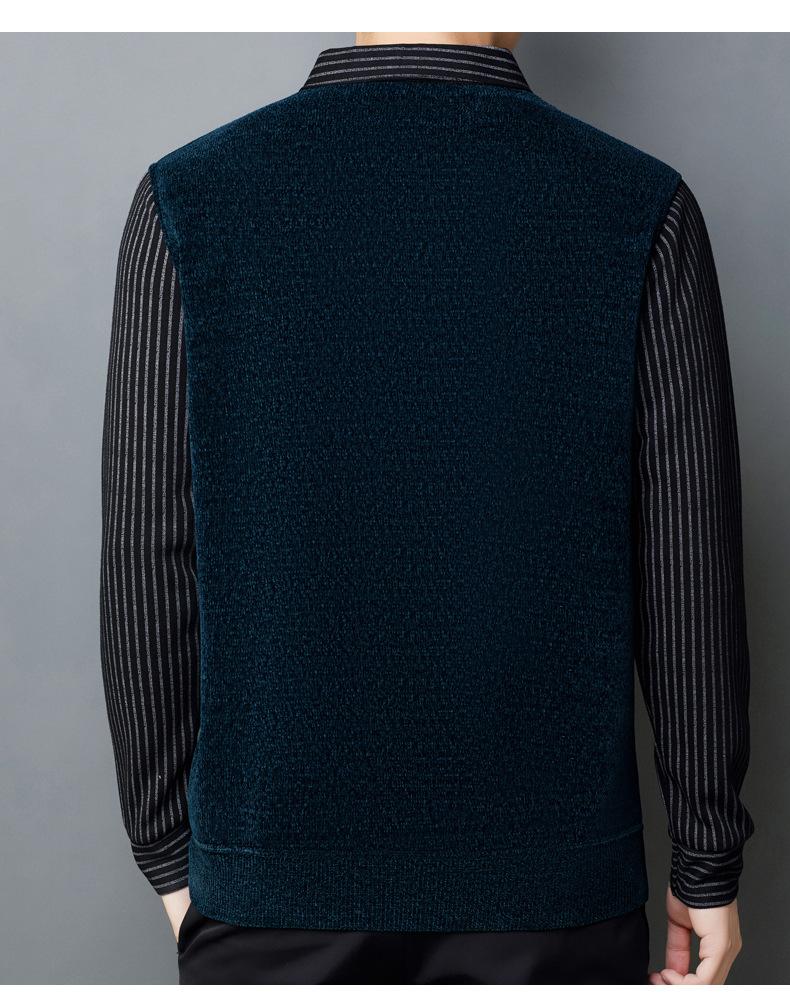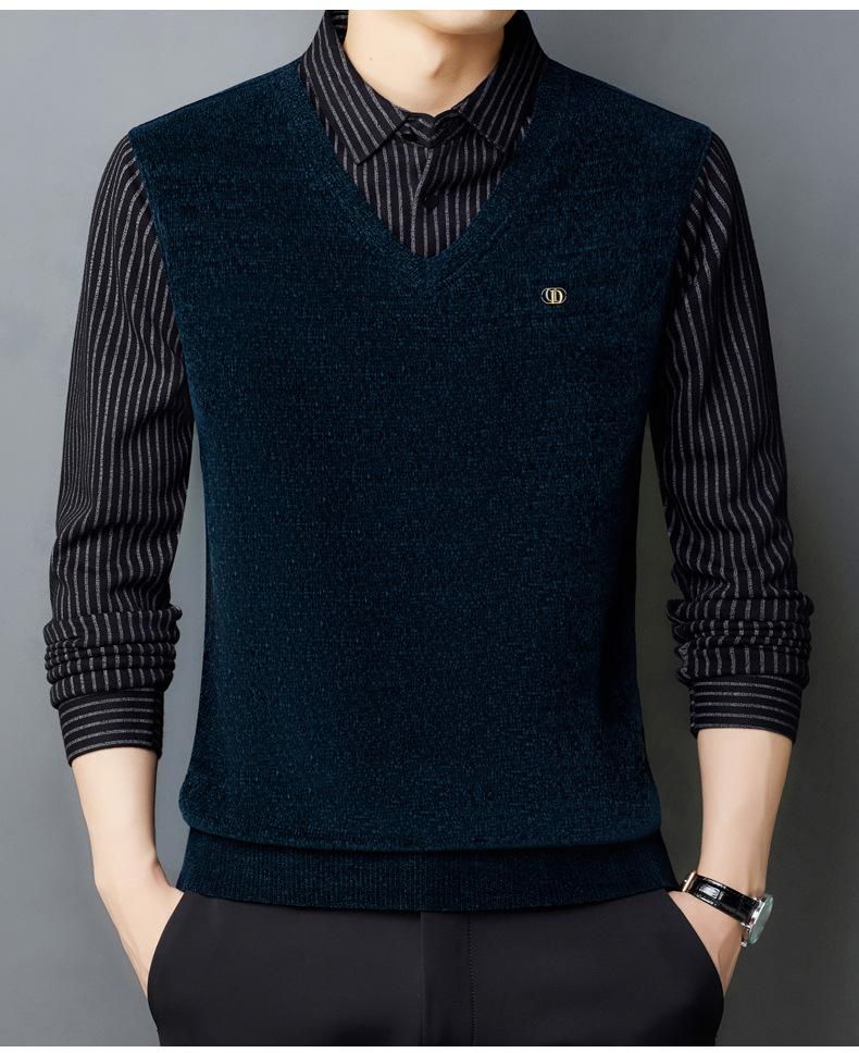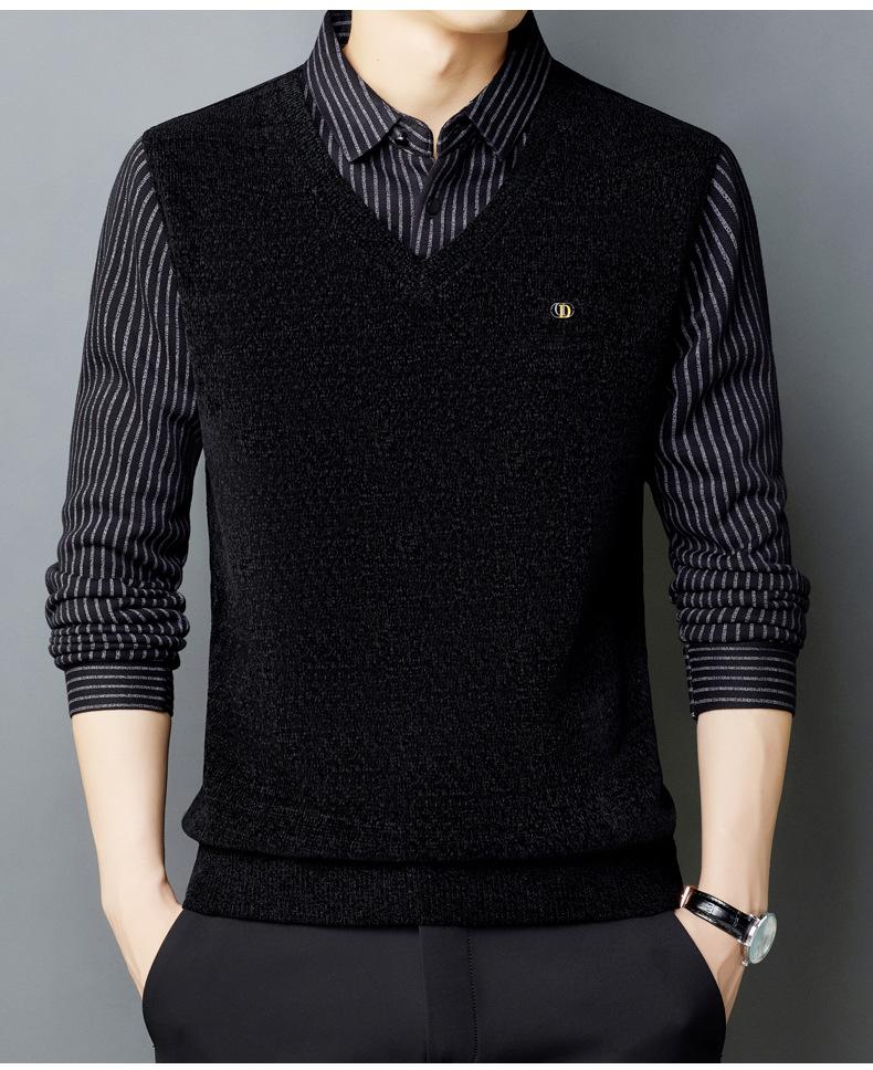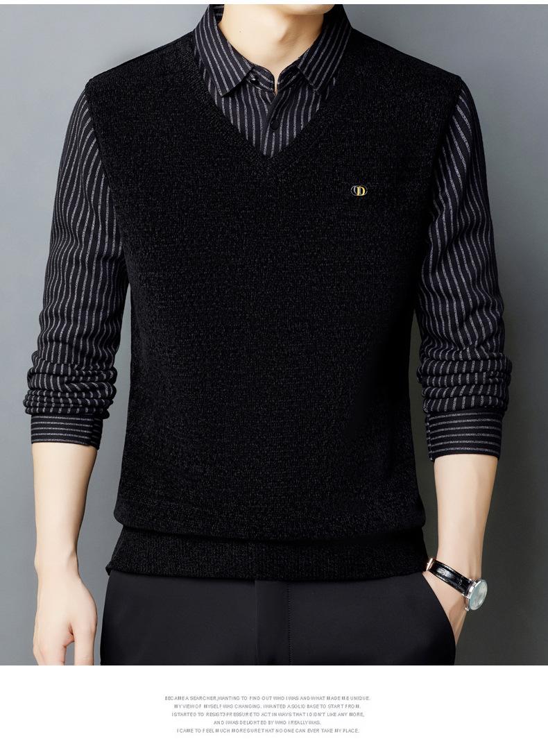 Suéter para Hombre Otoño e Invierno Tejido de Punto Falso de Dos Piezas Camisa de Cuello para Mediana Edad y Adulto Mayor Forrado de Felpa Engrosado Transfronterizo Cálido Camiseta Base