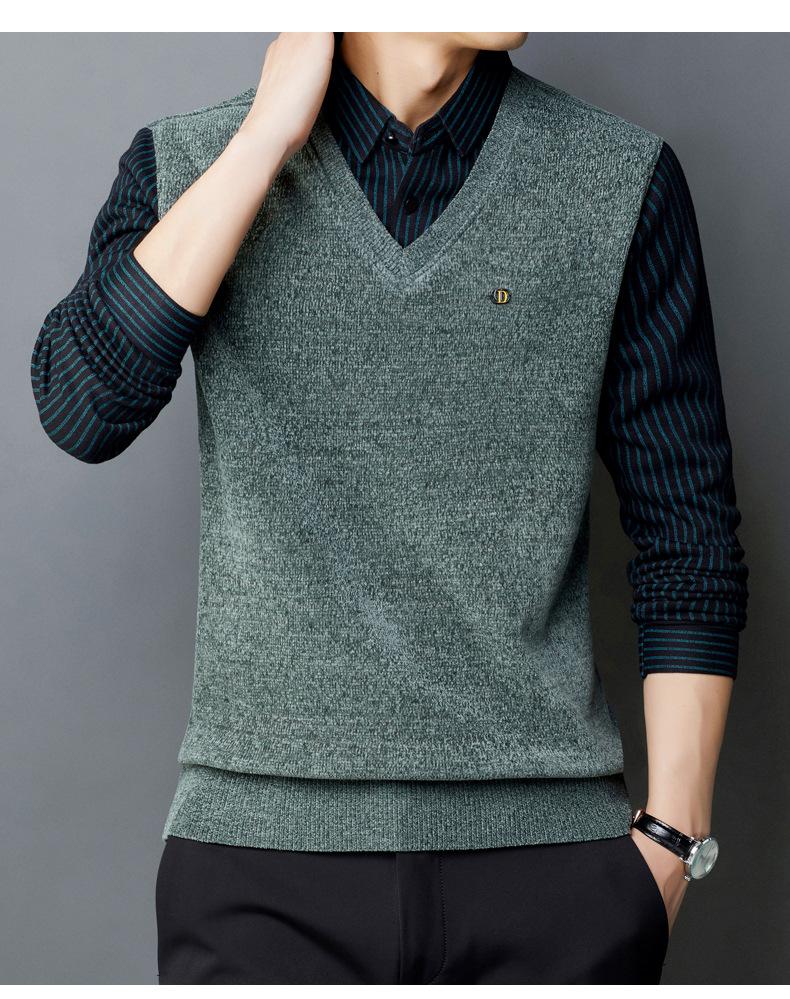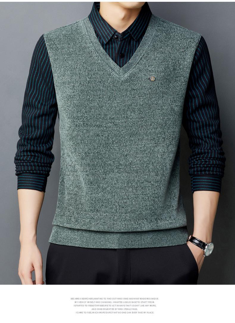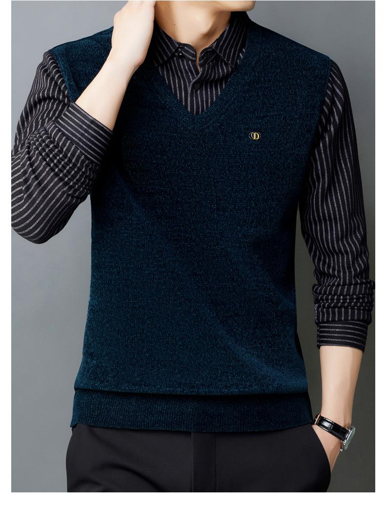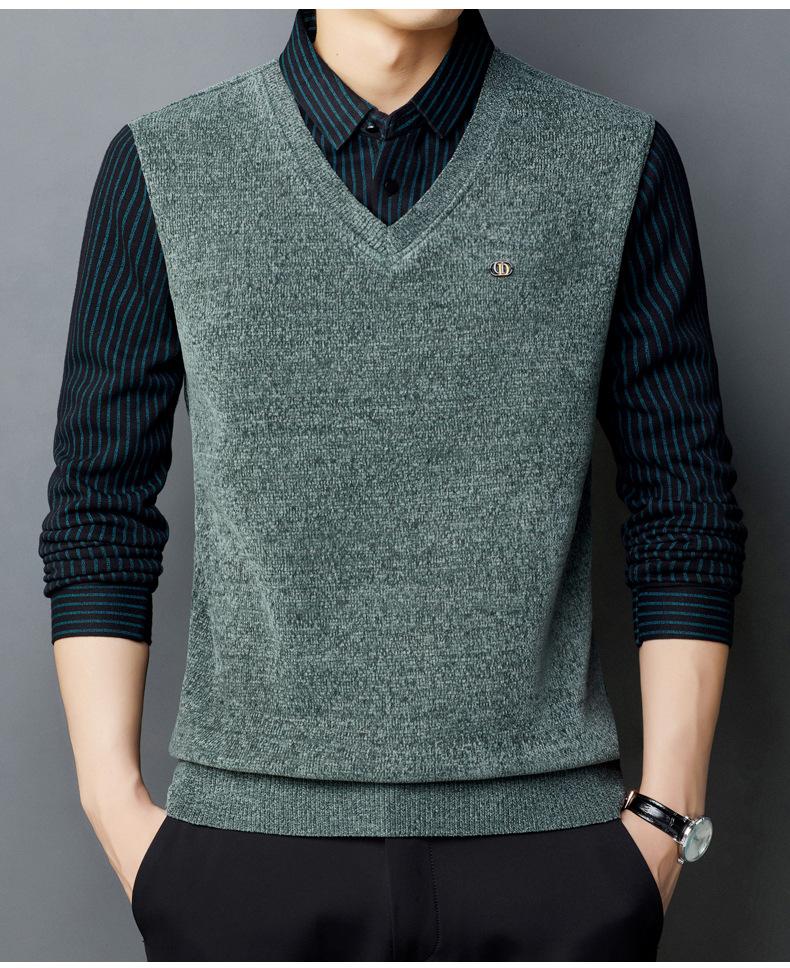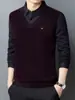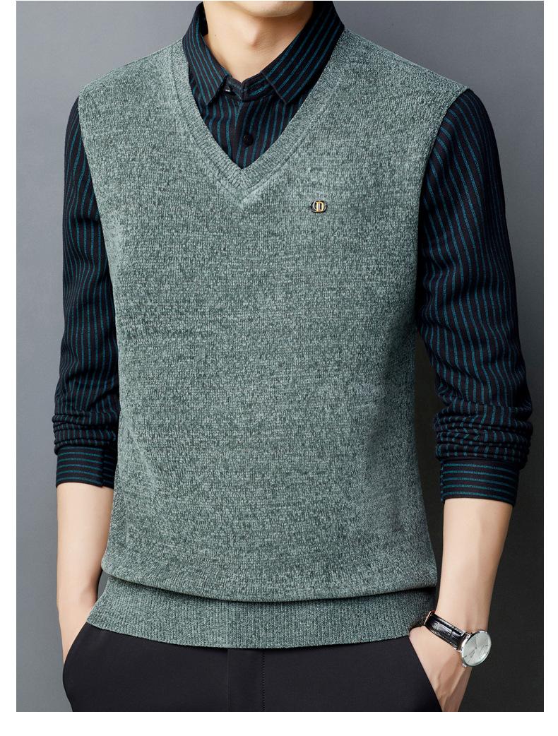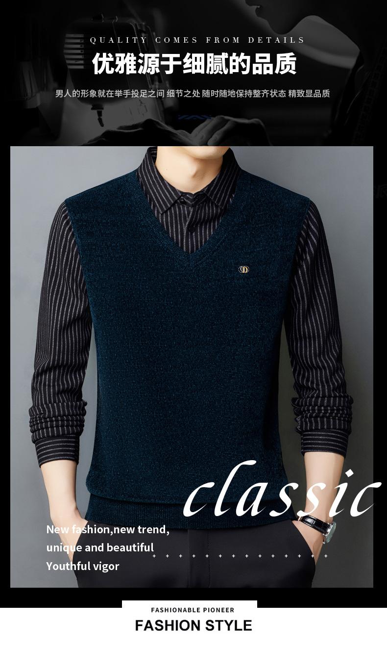 Suéter para Hombre Otoño e Invierno Tejido de Punto Falso de Dos Piezas Camisa de Cuello para Mediana Edad y Adulto Mayor Forrado de Felpa Engrosado Transfronterizo Cálido Camiseta Base
