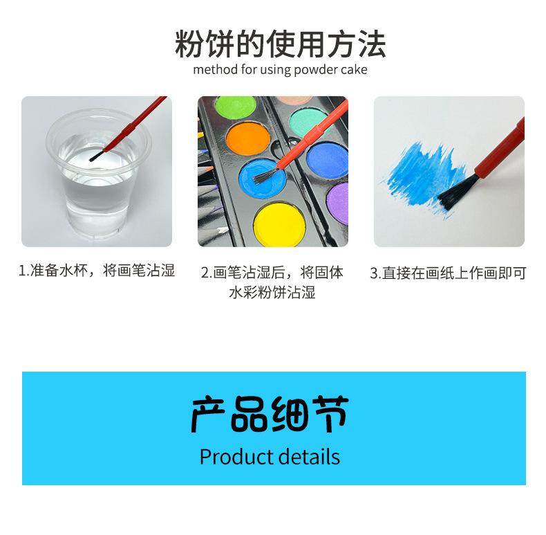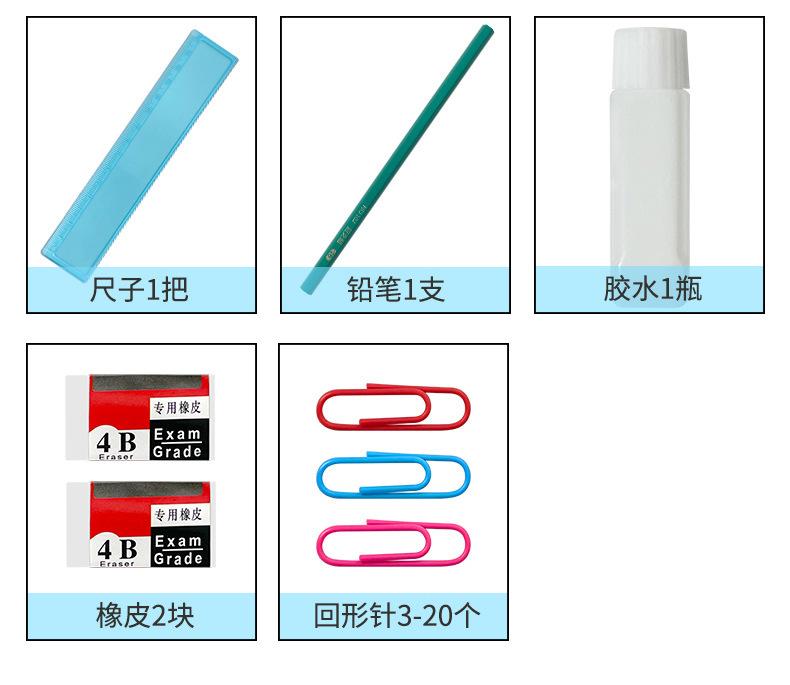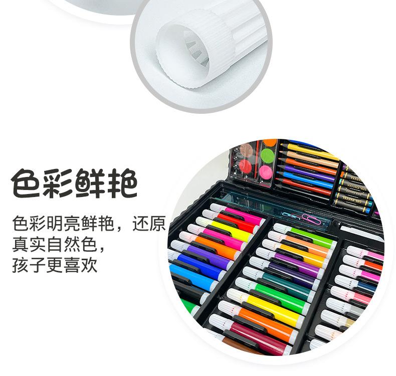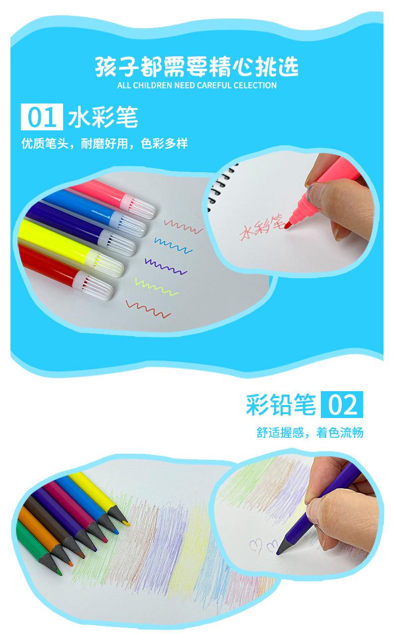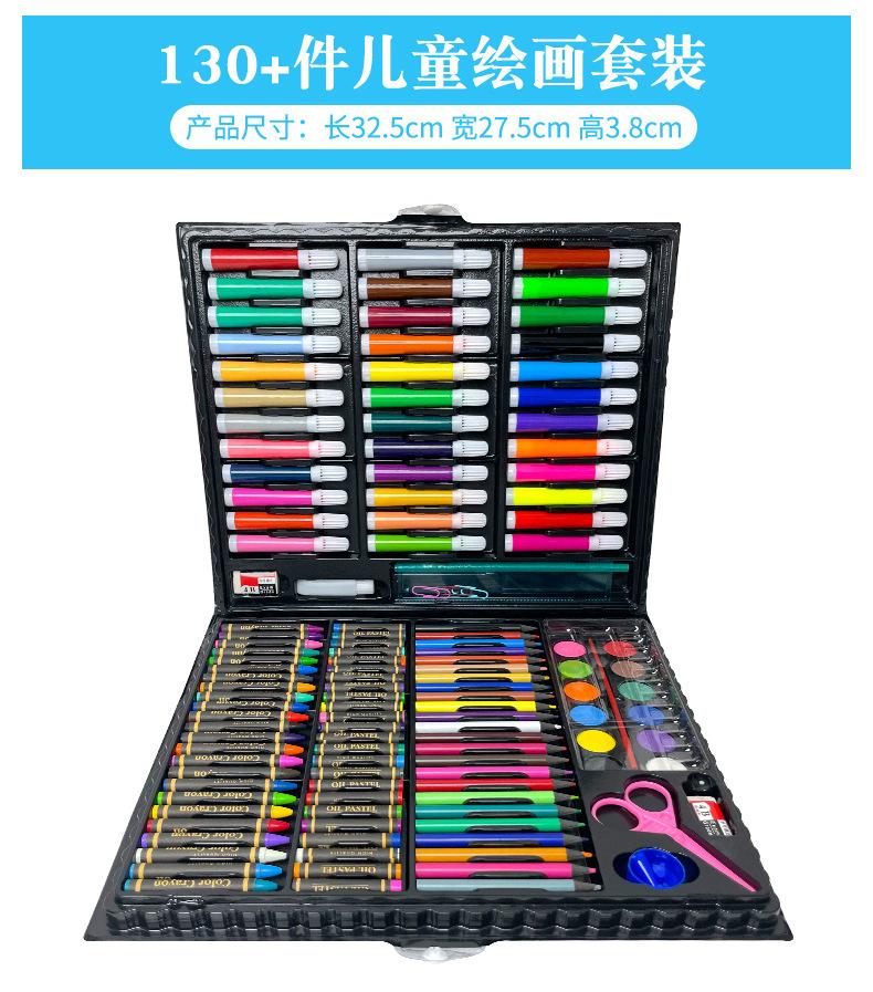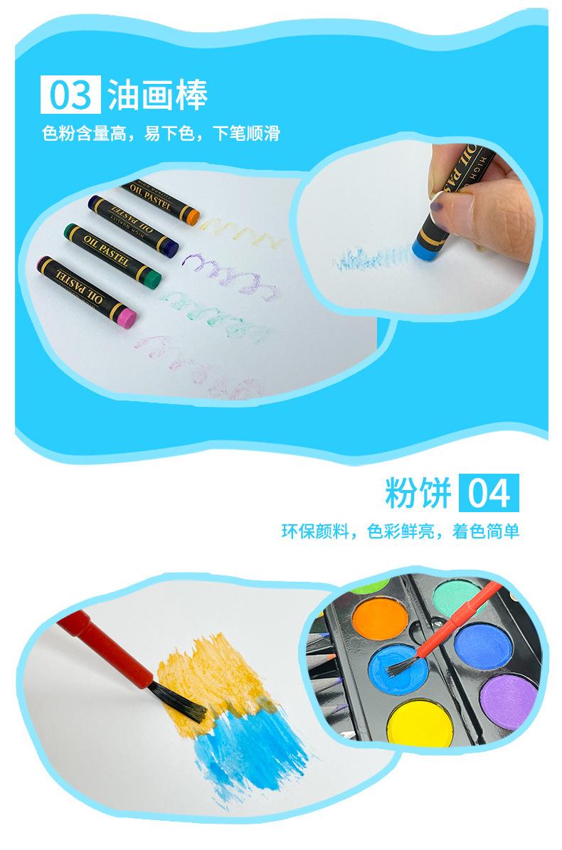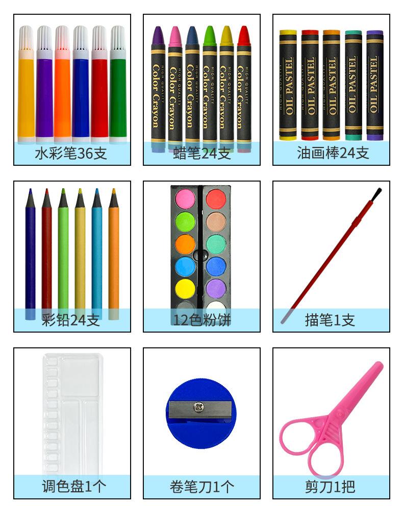 Configuración:36 lápices de acuarela + 24 pinceles de óleo + 24 ceras + 24 colores + polvo de 12 colores + paleta + 2-24 clips + 1 sacapuntas + 1 lápiz + 1 borrador + 2 barras de pegamento + 1 tijera + 1 grapadora + 1 pincel + 1 regla de plástico transparente