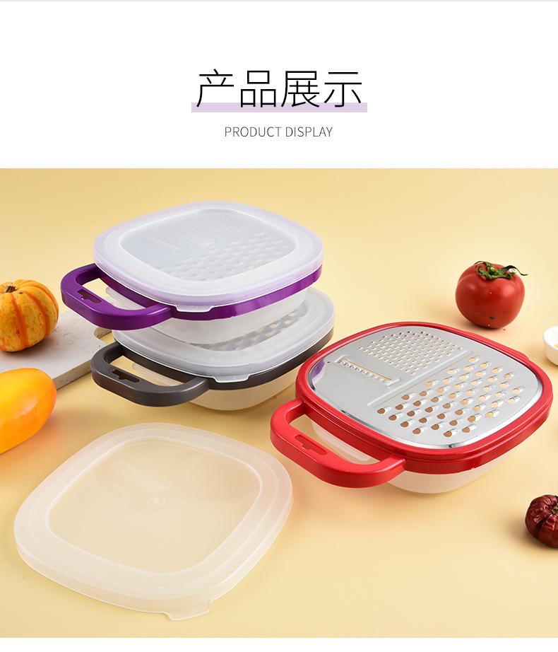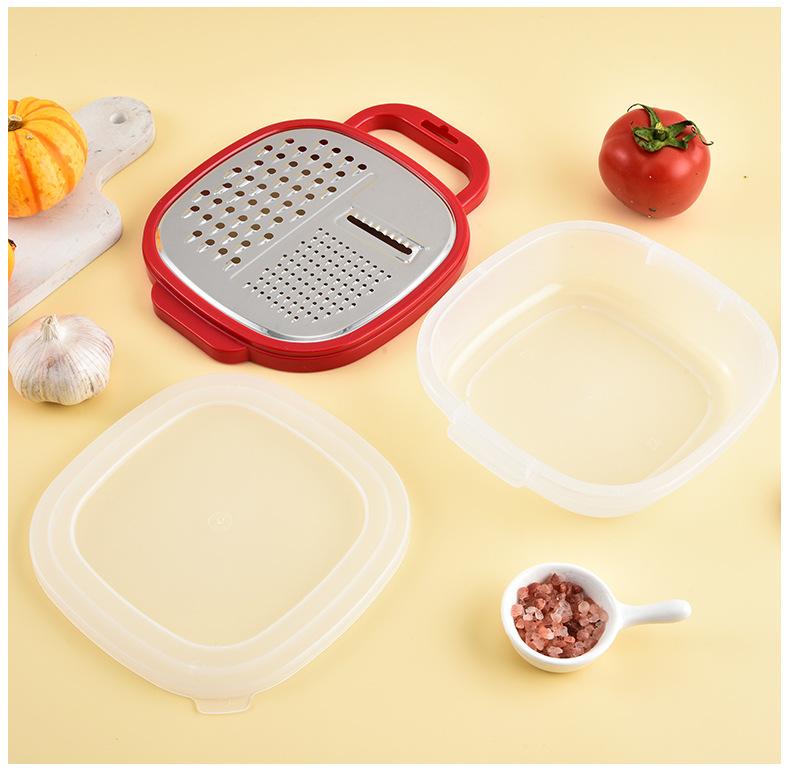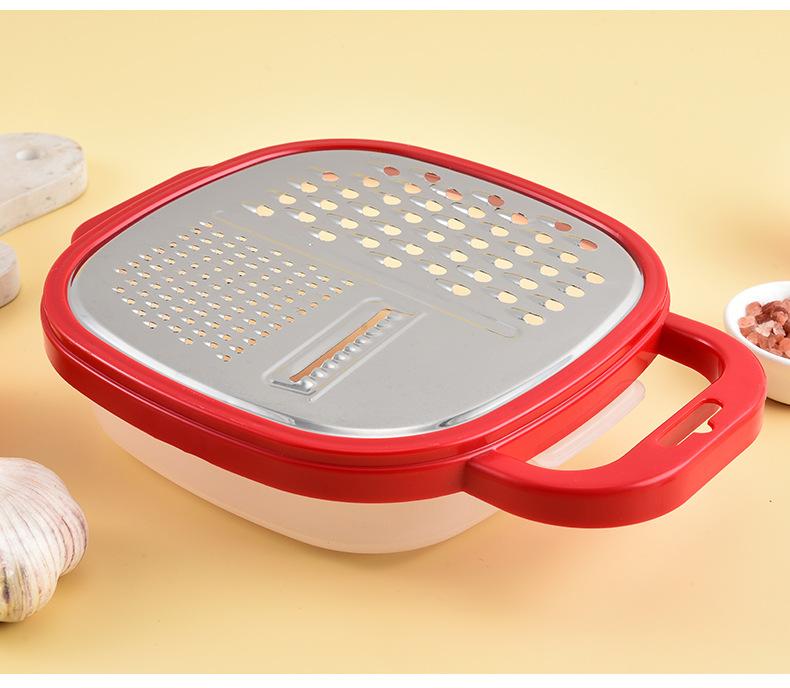Cepillo redondo multifuncional tres en uno de acero inoxidable con tapa inferior para rallar queso, verduras y frutas.