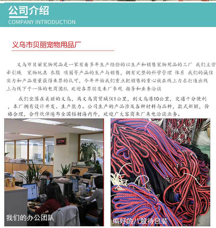 Yiwu Beili Pet Products Co., Ltd. se estableció en 2008. Originalmente era un fabricante de correas de tracción para mascotas. Después de 10 años de desarrollo, ahora cuenta con tres categorías de fábricas.Fábrica de cuerdas de remolque,Fábrica de Juguetes para Mascotas(juguetes tpr y juguetes de peluche), serie de linternas láser (Juguete Láser para Gatos, Serie de Linternas de Aluminio),