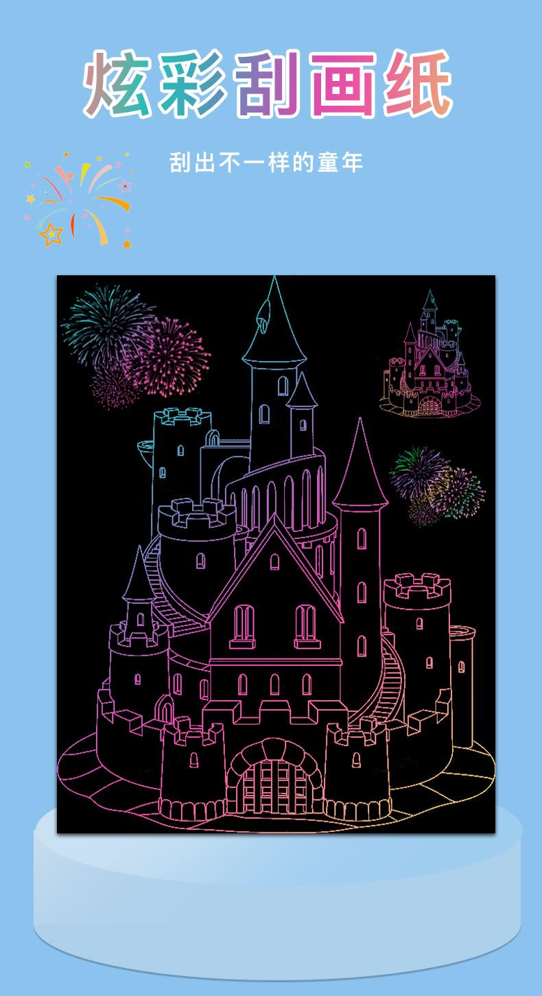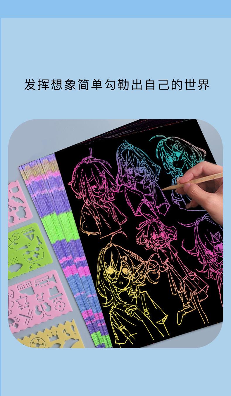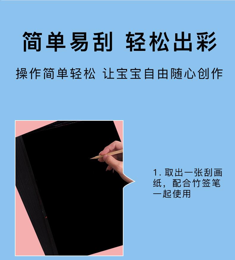 [Método de pintura adecuado]: Use cualquier objeto puntiagudo para raspar el negro del papel de dibujo para dibujar un patrón magnífico.