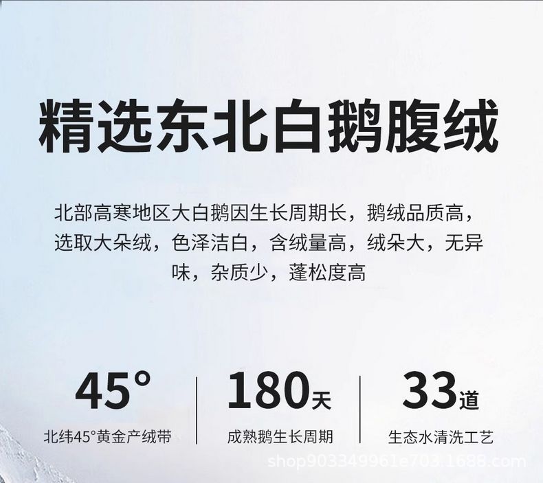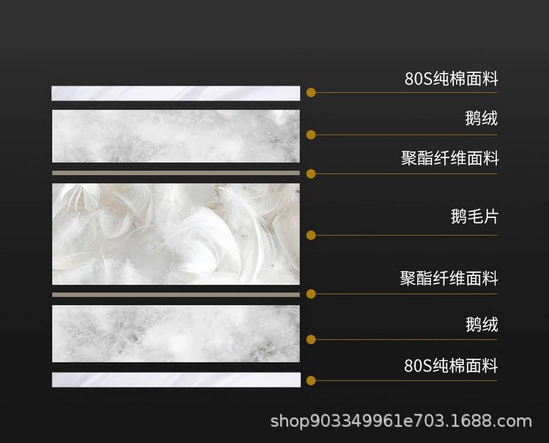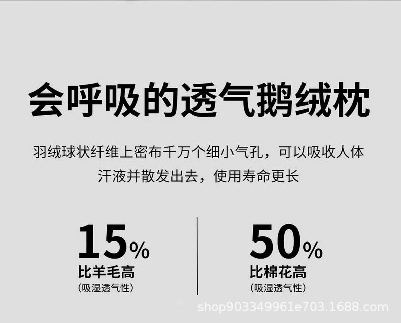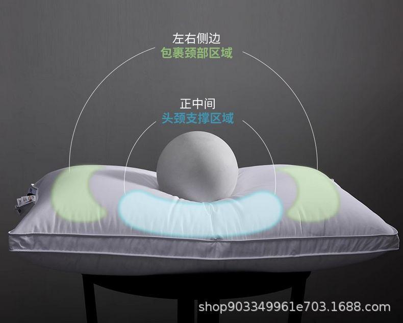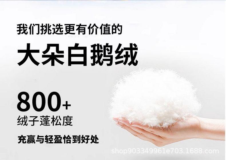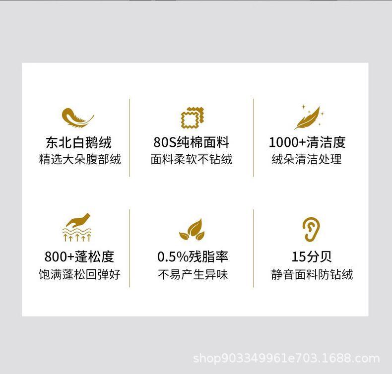 Relleno de almohada de plumón de ganso tipo sándwich: capa superior 95% plumón de ganso blanco 100g + capa media pluma de ganso 800g + capa inferior 95% plumón de ganso blanco 100g