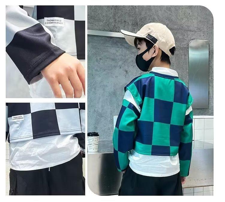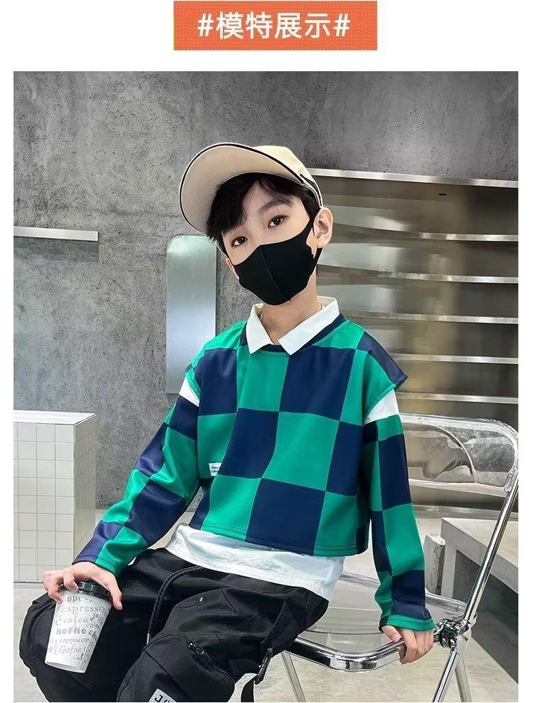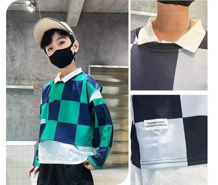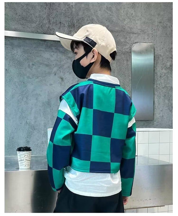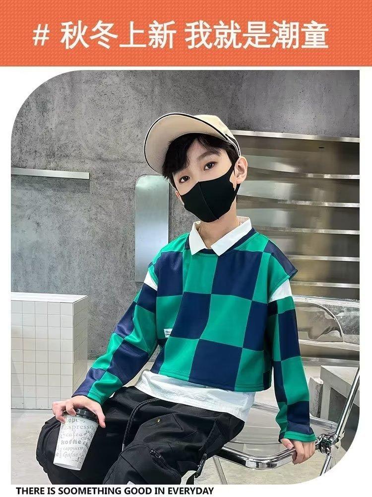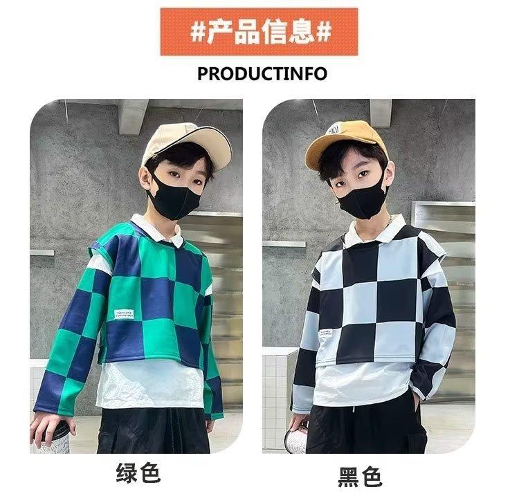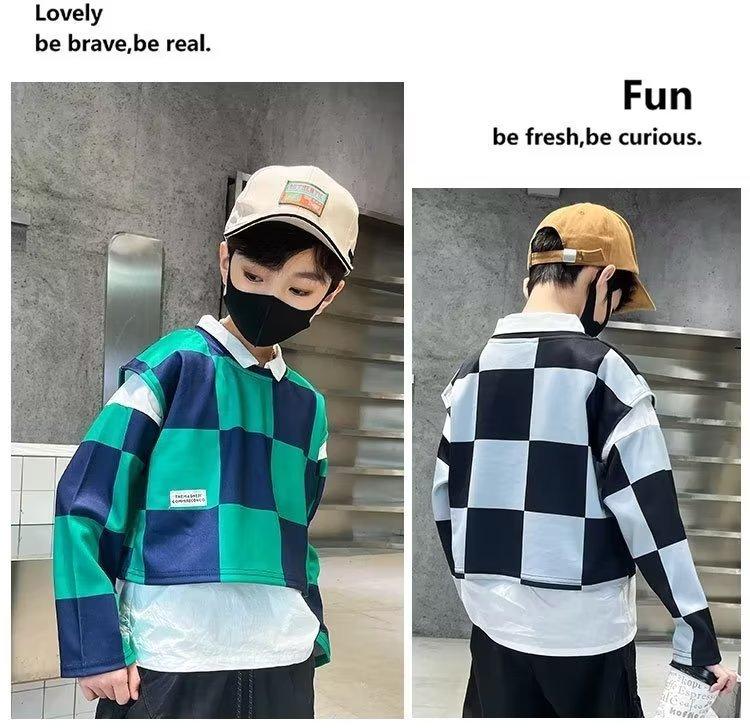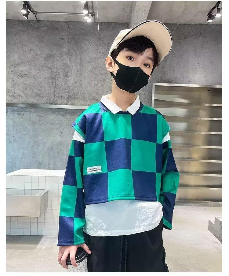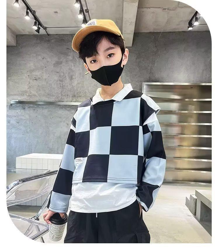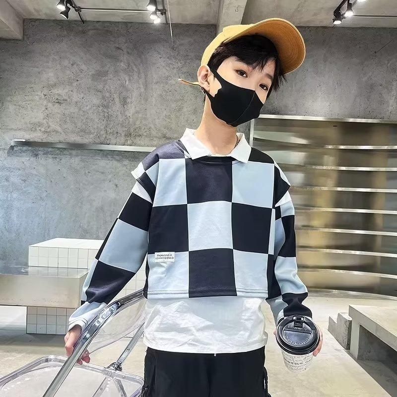 Traje de camisa a cuadros estilo coreano para niño, chaleco, otoño, nuevo, falso, dos piezas, suéteres de manga larga de moda, ropa de otoño
