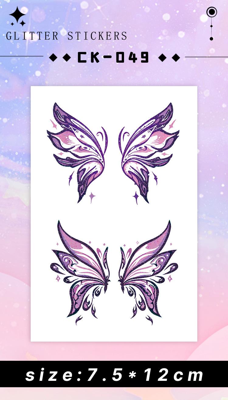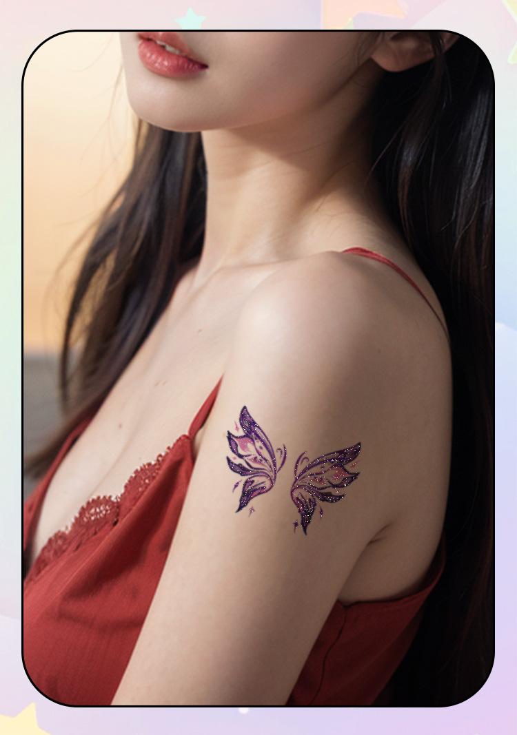 Pegatina de tatuaje de mariposa con purpurina morada, resistente al agua, de larga duración, para maquillaje facial y de brazo de mujer, hermosa pegatina lavable.