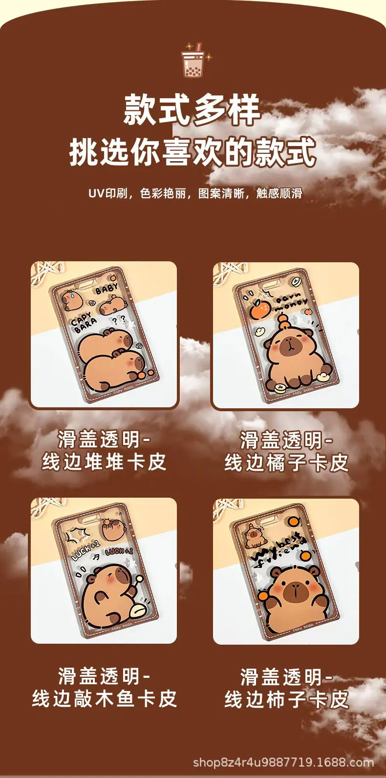 Transparent sliding cover - line edge persimmon card + brown edge card leather telescopic long lanyard (double card leather)