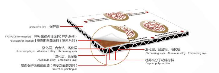 La placa de aluminio espacial tridimensional Weilun, también conocida como placa tridimensional, está compuesta por tres capas de aleación de aluminio 3003 o 5052. Las capas superior e inferior son placas de aleación de aluminio de alta pureza, resistentes a la corrosión, de 0,5 mm a 1,0 mm, y la capa intermedia es un núcleo de aleación de aluminio. La superficie del producto está pintada con pintura de fluorocarbono PPG de marca internacionalmente reconocida, combinada con un proceso de recubrimiento con rodillo de dos capas y dos horneados o tres capas y tres horneados, y se aplica una película protectora de PE de 0,1 mm de espesor en la parte frontal.