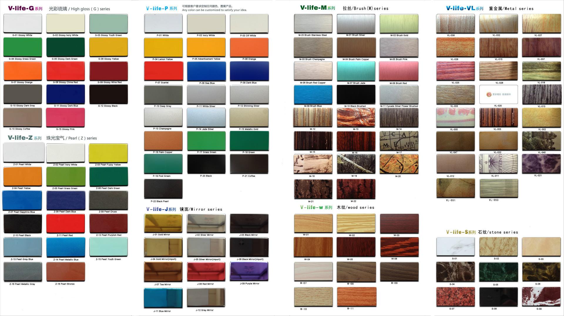 Los paneles de aluminio y plástico se clasifican, según el procesamiento de la superficie, en diez series principales: espejo, cepillado, perlado, alto brillo, color sólido, veta de madera, veta de piedra, impresión, impresión y revestimiento de PVC. Estas series de productos aún están en desarrollo.