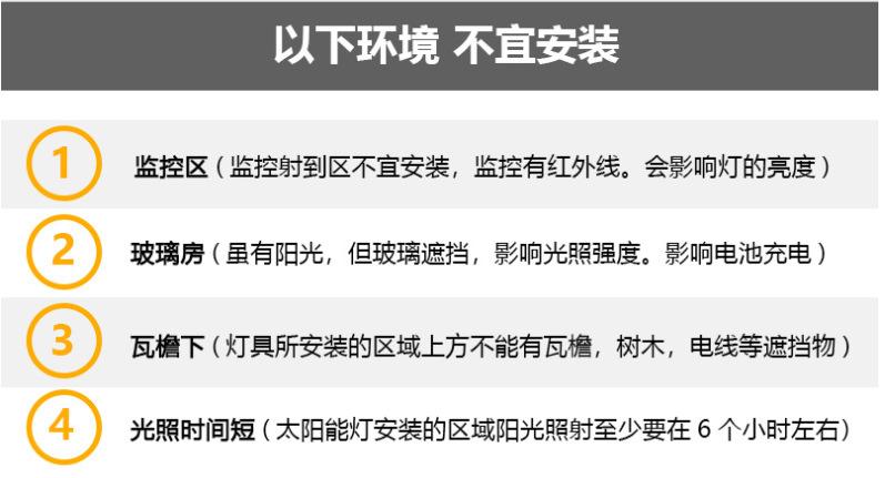 2. Ubicación: Por favor, elija un lugar con mucha luz solar, sin obstrucciones ni sombra para que la lámpara solar reciba mejor la energía.