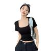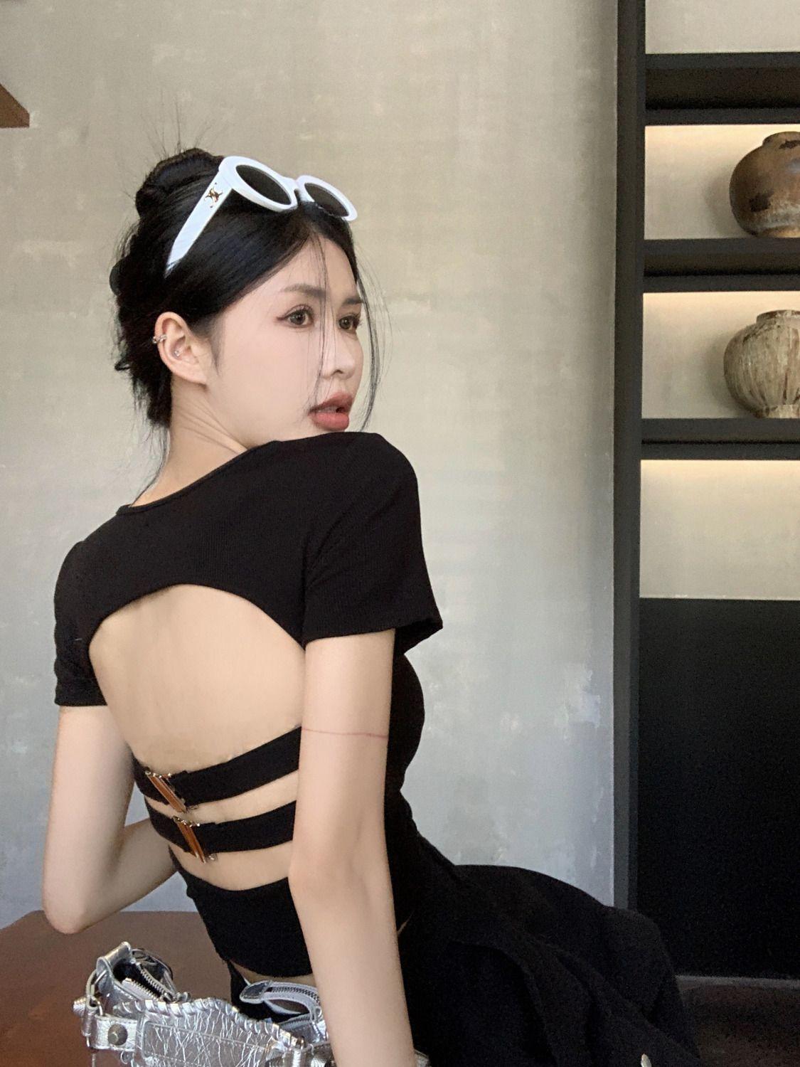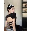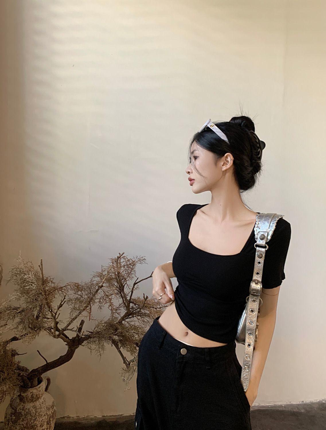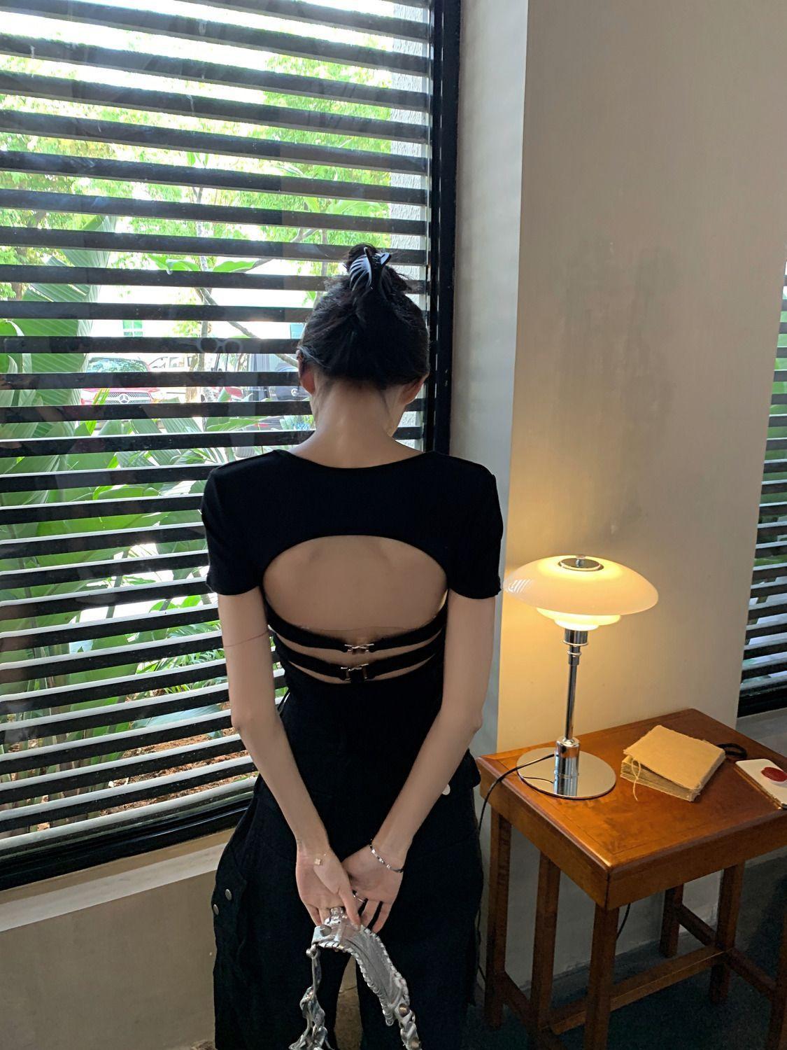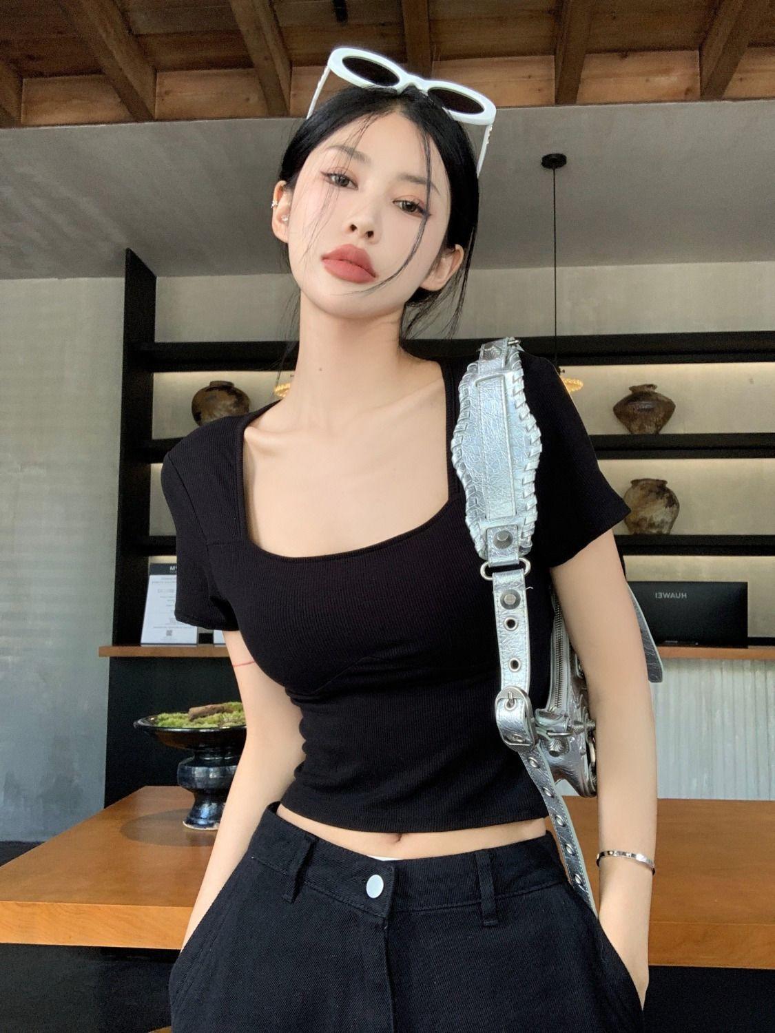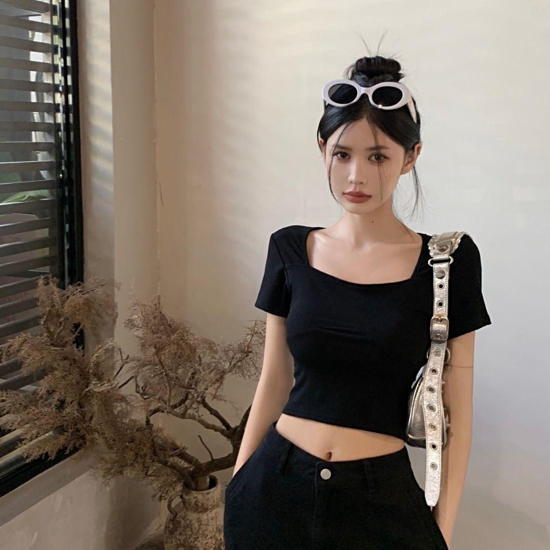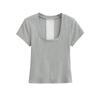 Playera de Diseño Recortado sin Espalda con Cuello Cuadrado para Mujer 2024 Verano Nuevo Sexy Hottie Adelgazante de Cintura Top de Manga Corta