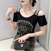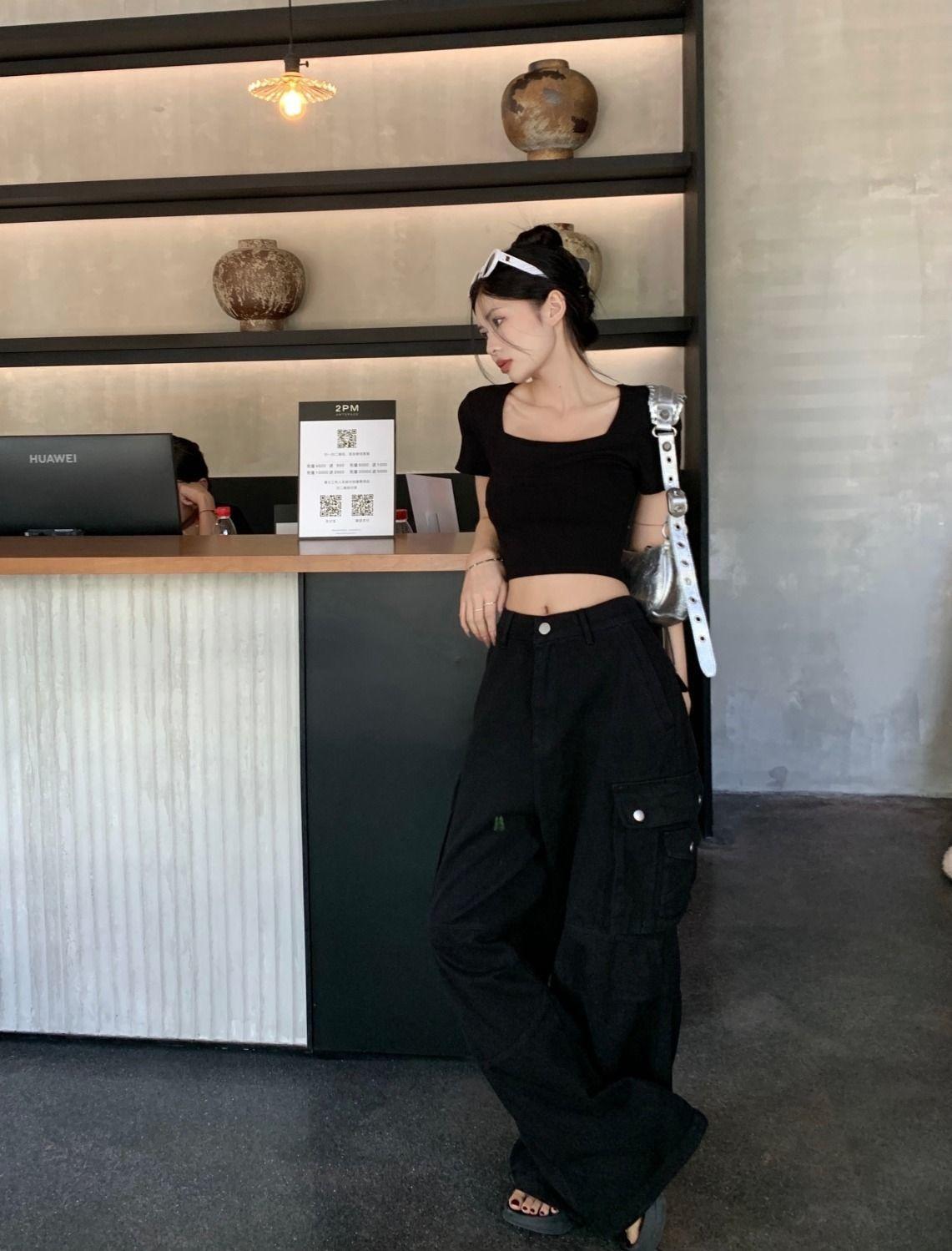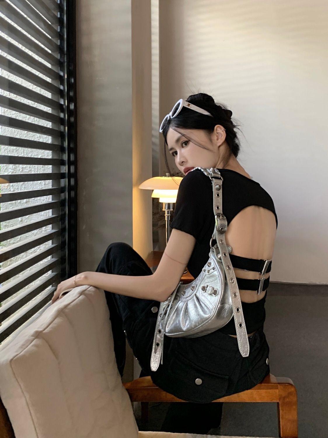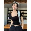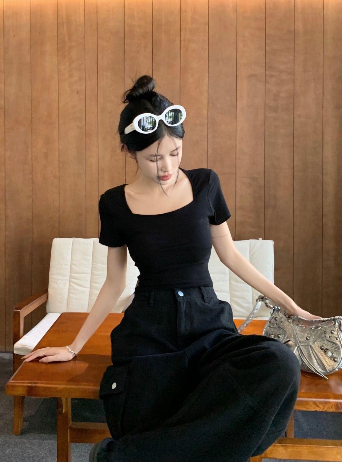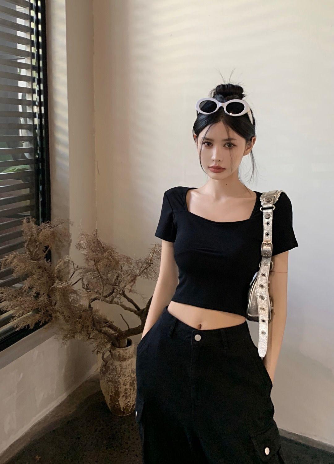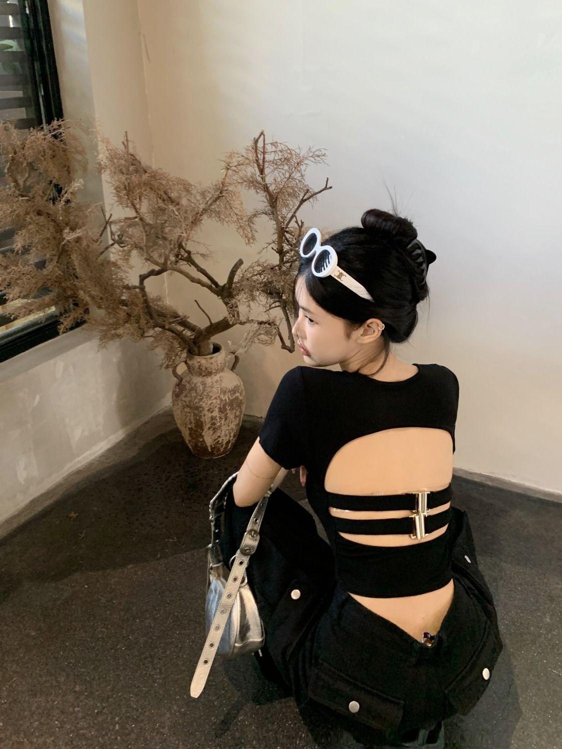 Playera de Diseño Recortado sin Espalda con Cuello Cuadrado para Mujer 2024 Verano Nuevo Sexy Hottie Adelgazante de Cintura Top de Manga Corta