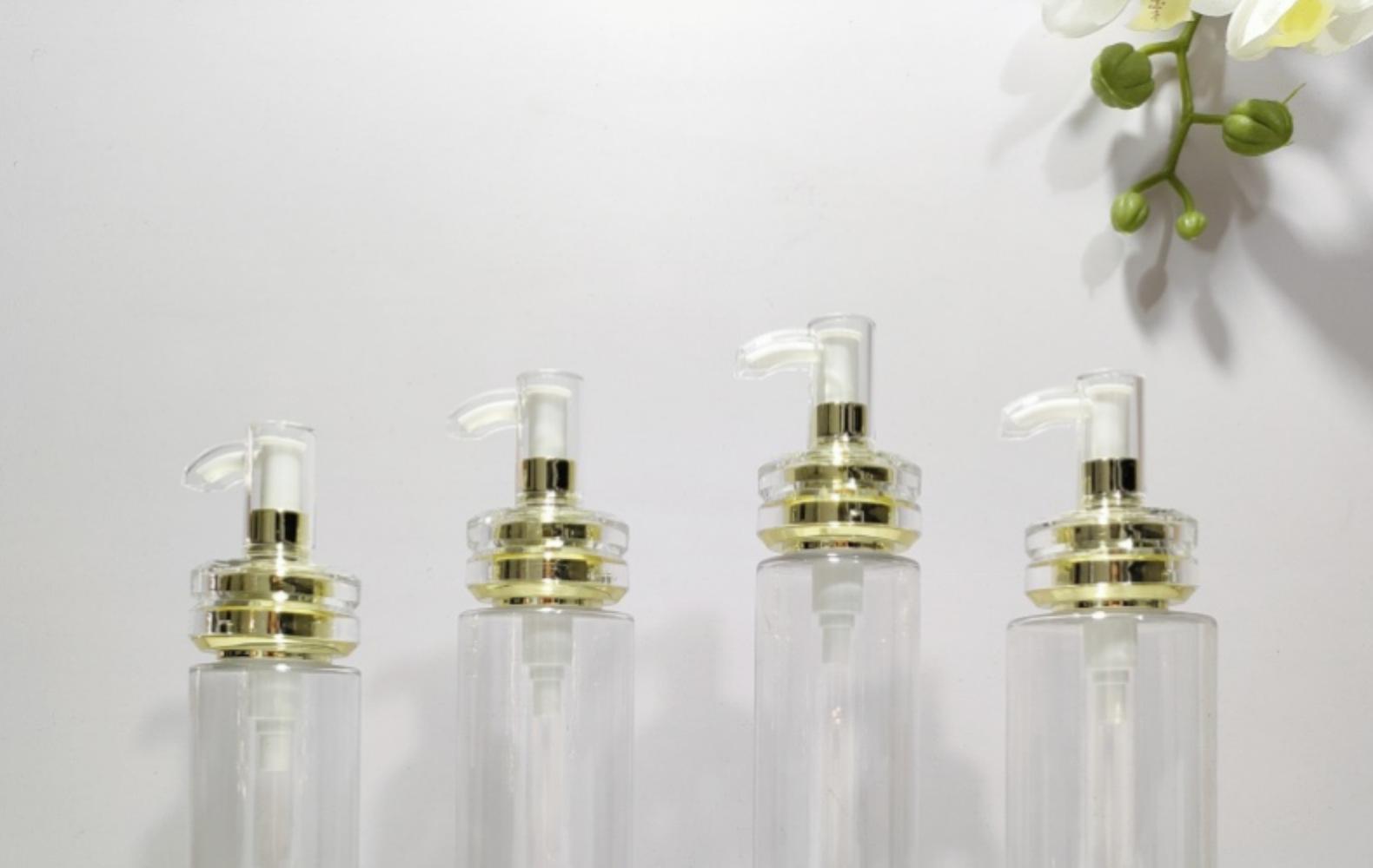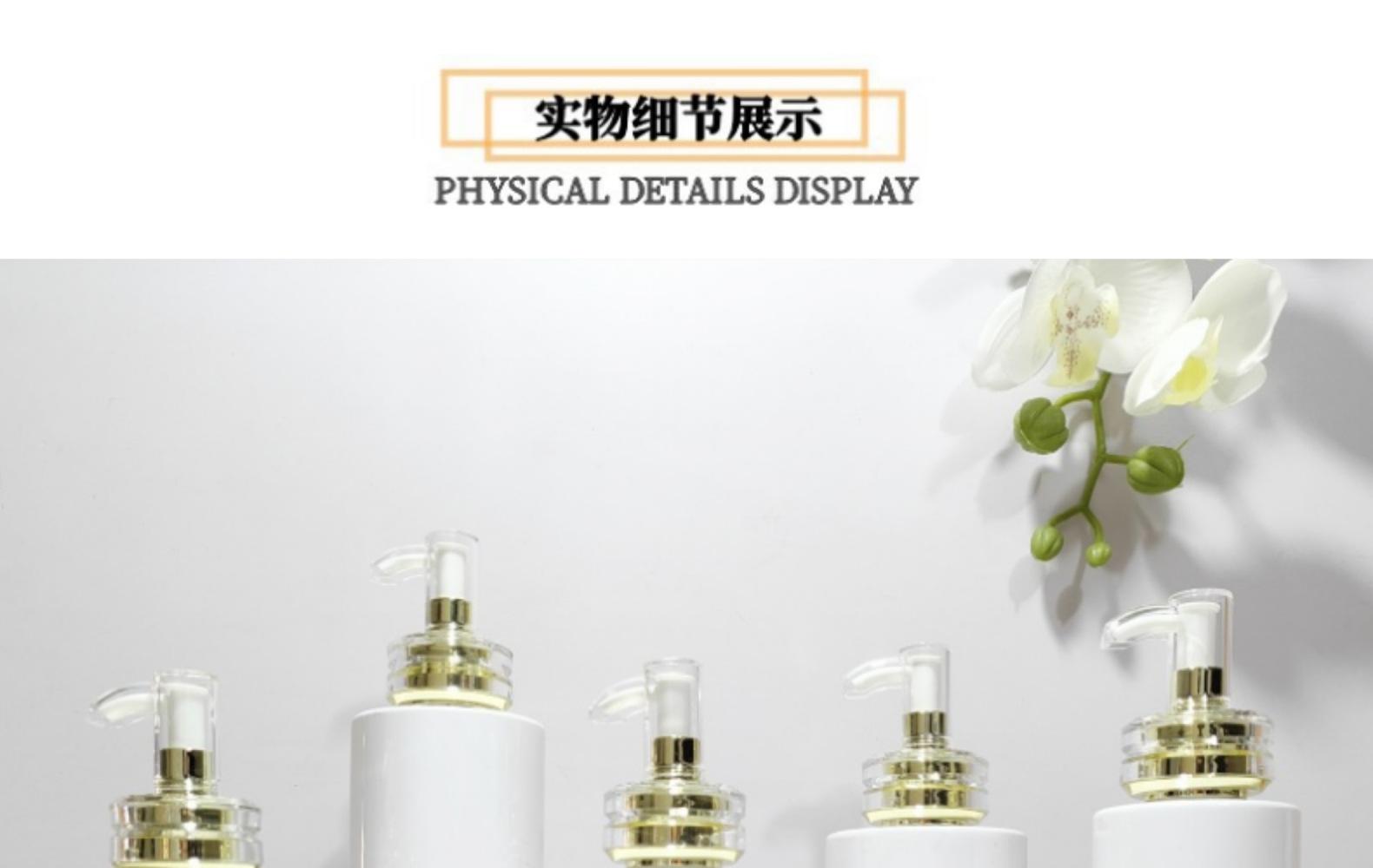 100ml; Transparent flat shoulder acrylic double ring electroplated gold white mouth pump; Plastic