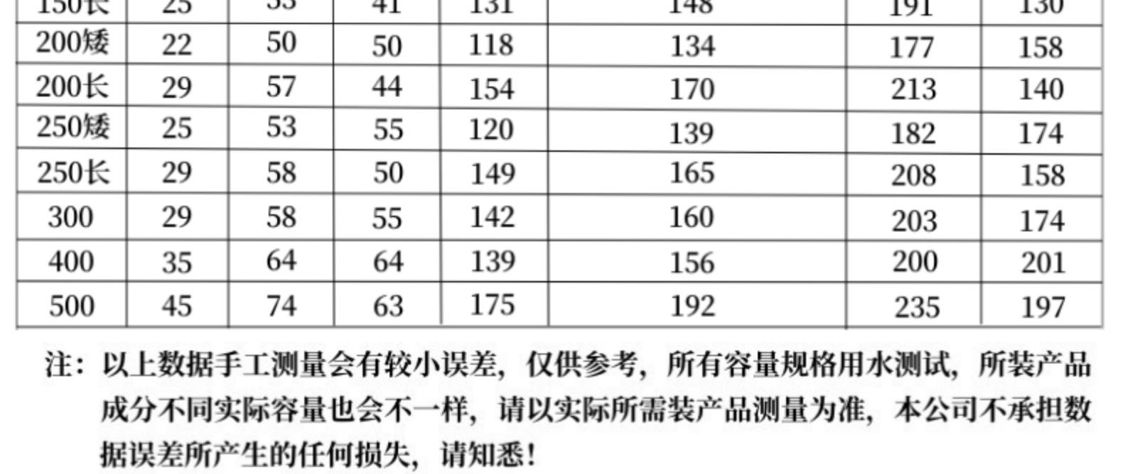 300ml, 120ml, 100ml, 500ml, 400ml, 250ml Short, 200ml Short, 150ml Short, 250ml long, 200ml long, 150ml long