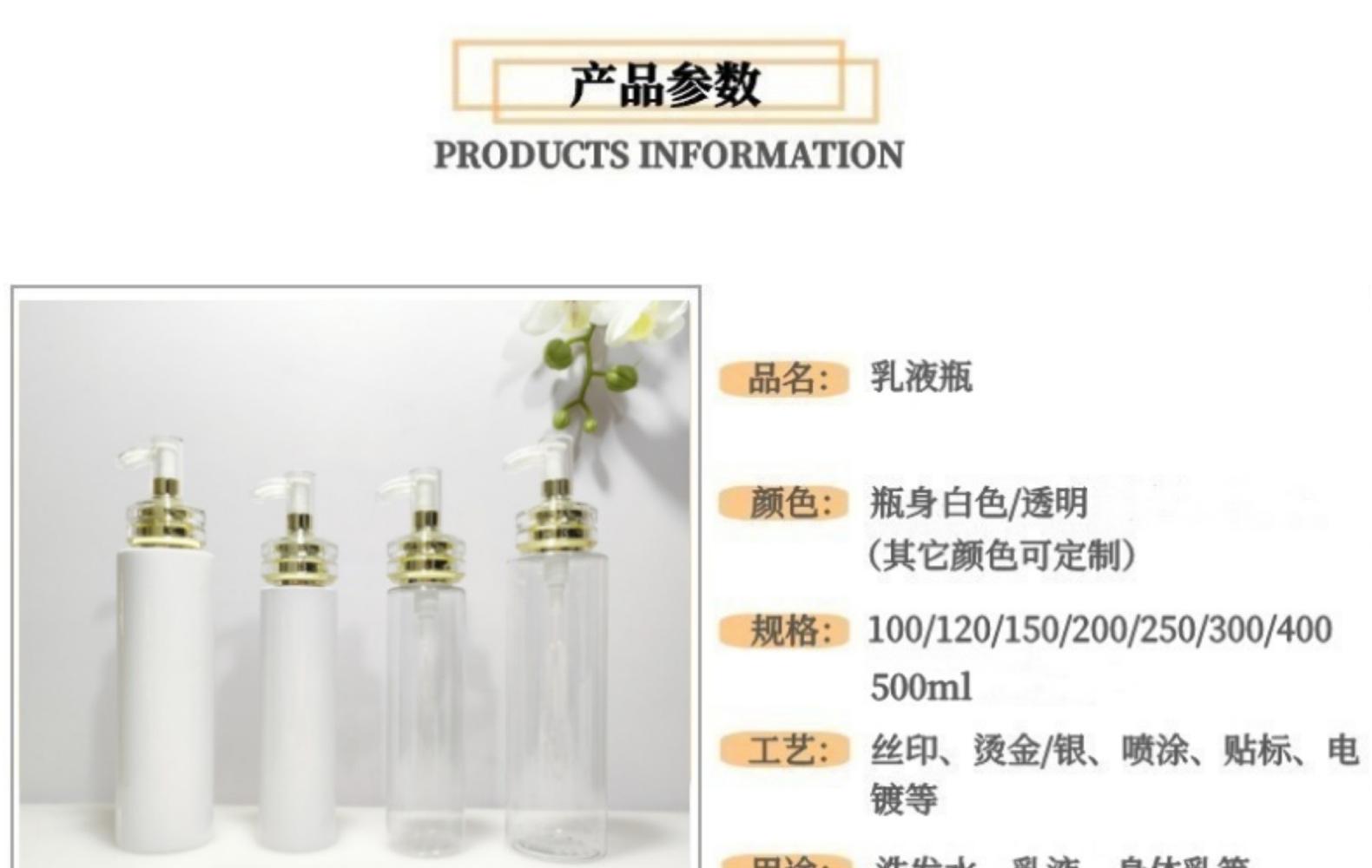 Botella de loción acrílica en stock, 100 ml, 500 ml, champú, gel de ducha, botella de plástico PET blanca.