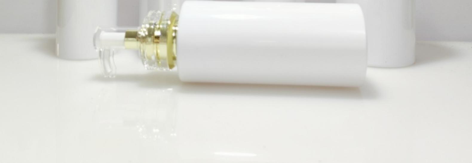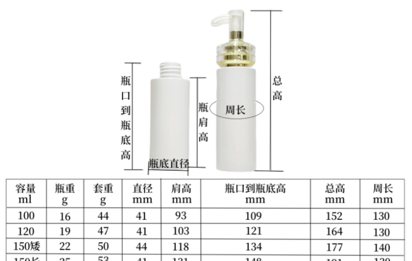 100ml; White flat shoulder acrylic double ring electroplated gold white mouth pump; Plastic, 100ml; Transparen...