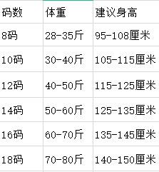 8 yards (95-108cm), 10 yards (105-115cm), 12 yards (115-125cm), 14 yards (125-135cm), 16 yards (135-145cm), 18 yards (140-150cm)
