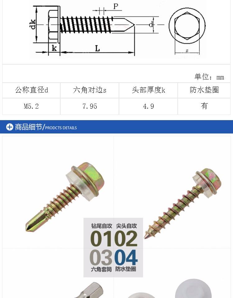 Color zinc drill tail (self-drilling) m5.2, Color zinc drill tail (pointed head) m5.2, 410 hexagonal drill tai...
