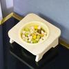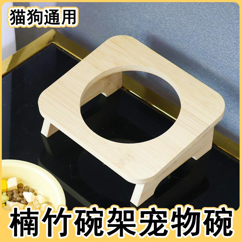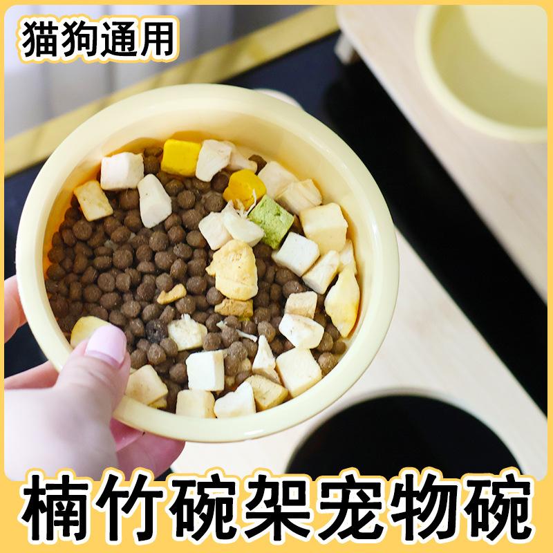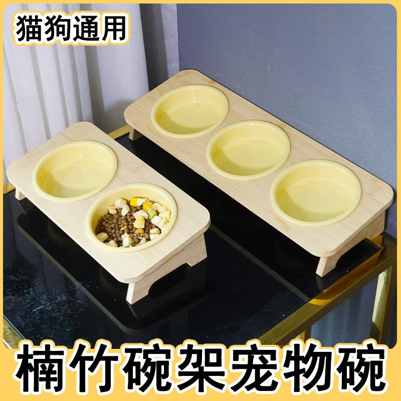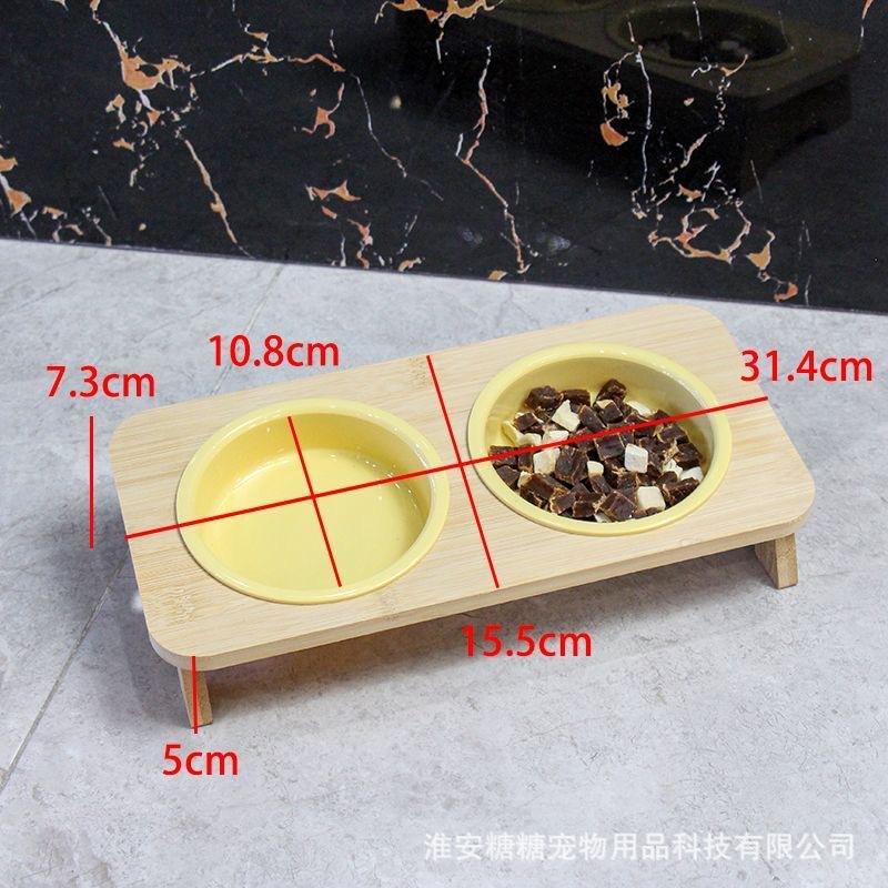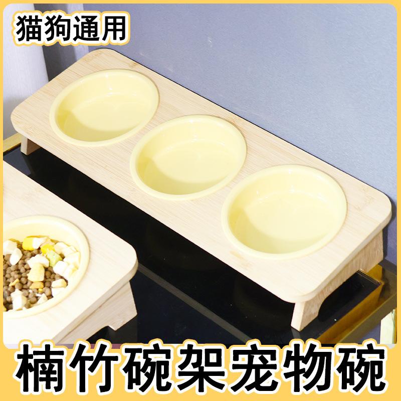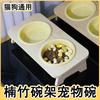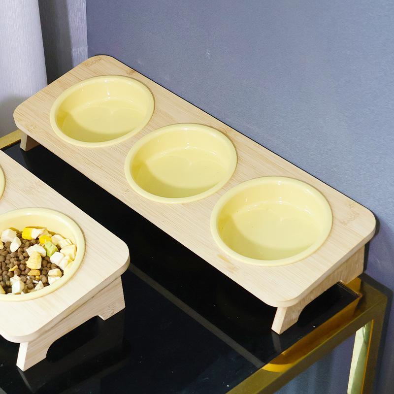 Rejilla de bambú para cuencos de comida para gatos, tres cuencos, cuenco de arroz oblicuo para gatos, inclinable, antivuelco, protección para la columna cervical.