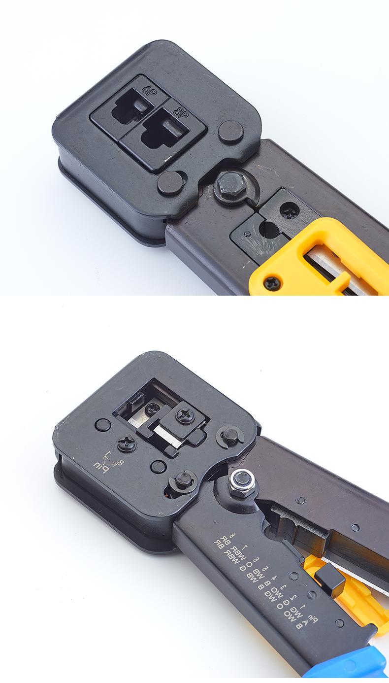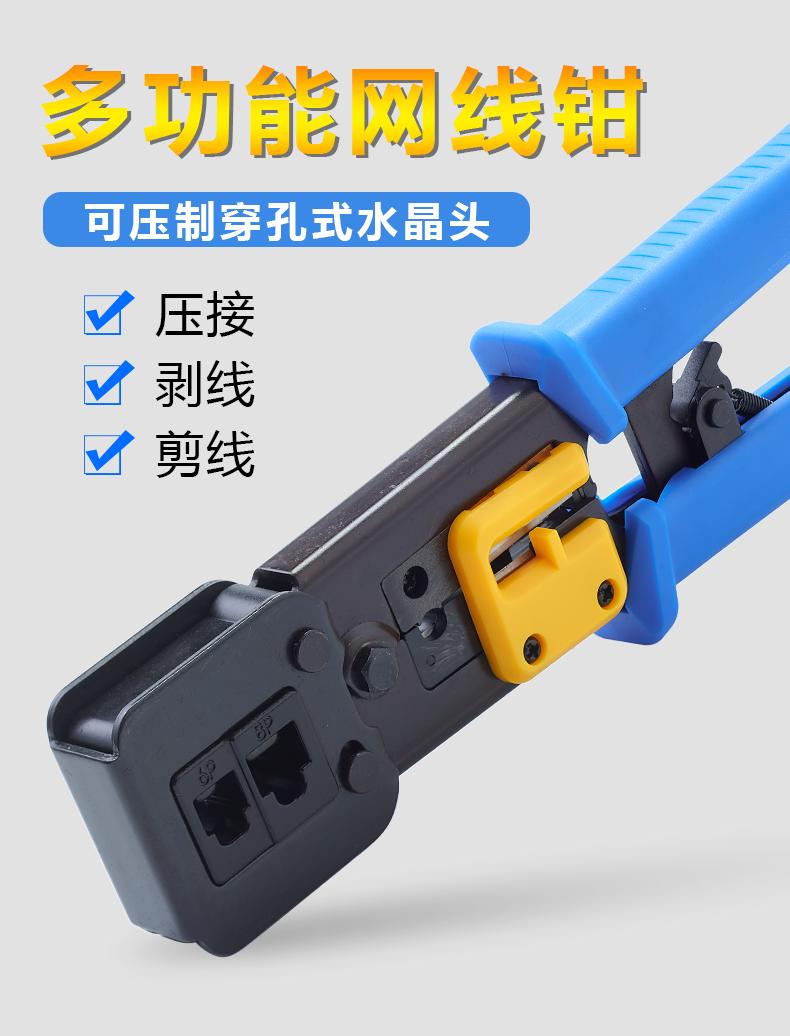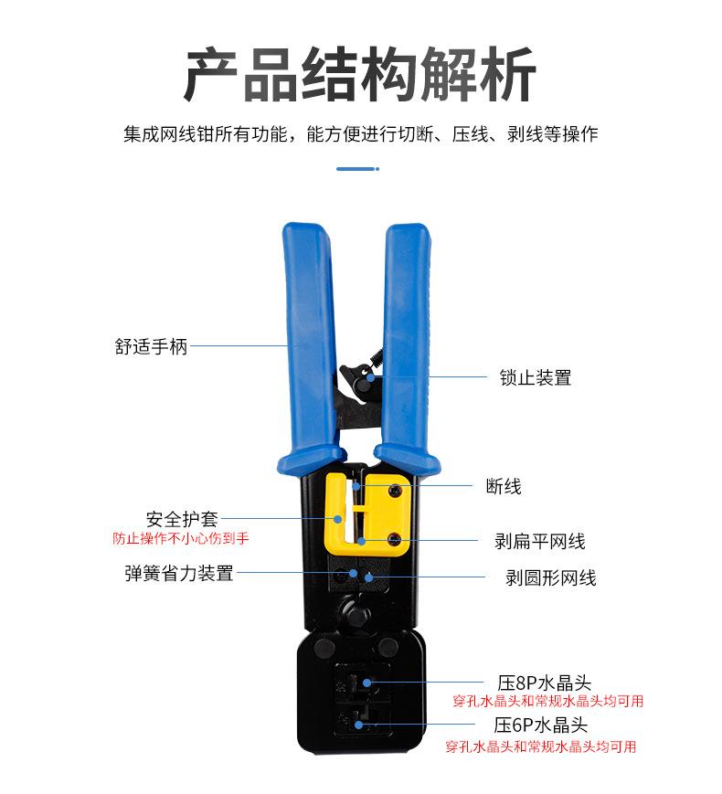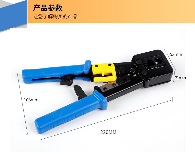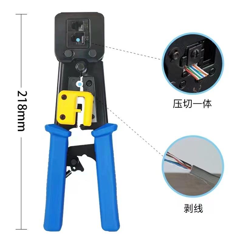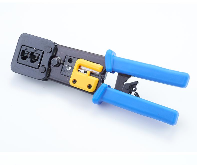 Alicates para cables de red con orificio pasante, alicates de crimpeado con cabeza de cristal perforada, alicates para cables de red EZ multicinéticos, alicates de doble propósito para cables de red 6P 8P: 1. Características del producto: ? 1. Se pueden utilizar tapones de cristal tanto pasantes como regulares. ? 2. Utilizar materias primas importadas respetuosas con el medio ambiente para cumplir con los estándares ambientales. ? 3. Cuchillas de alta calidad, borde afilado, fácil de cortar y uso duradero. ? 4. El uso de un molde de prensado de alta precisión no solo hace que el engarce se vea hermoso, sino que también hace que los datos sean mejores y más estables. ? 5. Gracias a la tecnología de circlip, es duradero y no se desprende. Dura más de 10 veces más que los tornillos convencionales. ? 6. Mango especial antideslizante, plástico de alta calidad. ? 7. Acero para herramientas de alta calidad.
