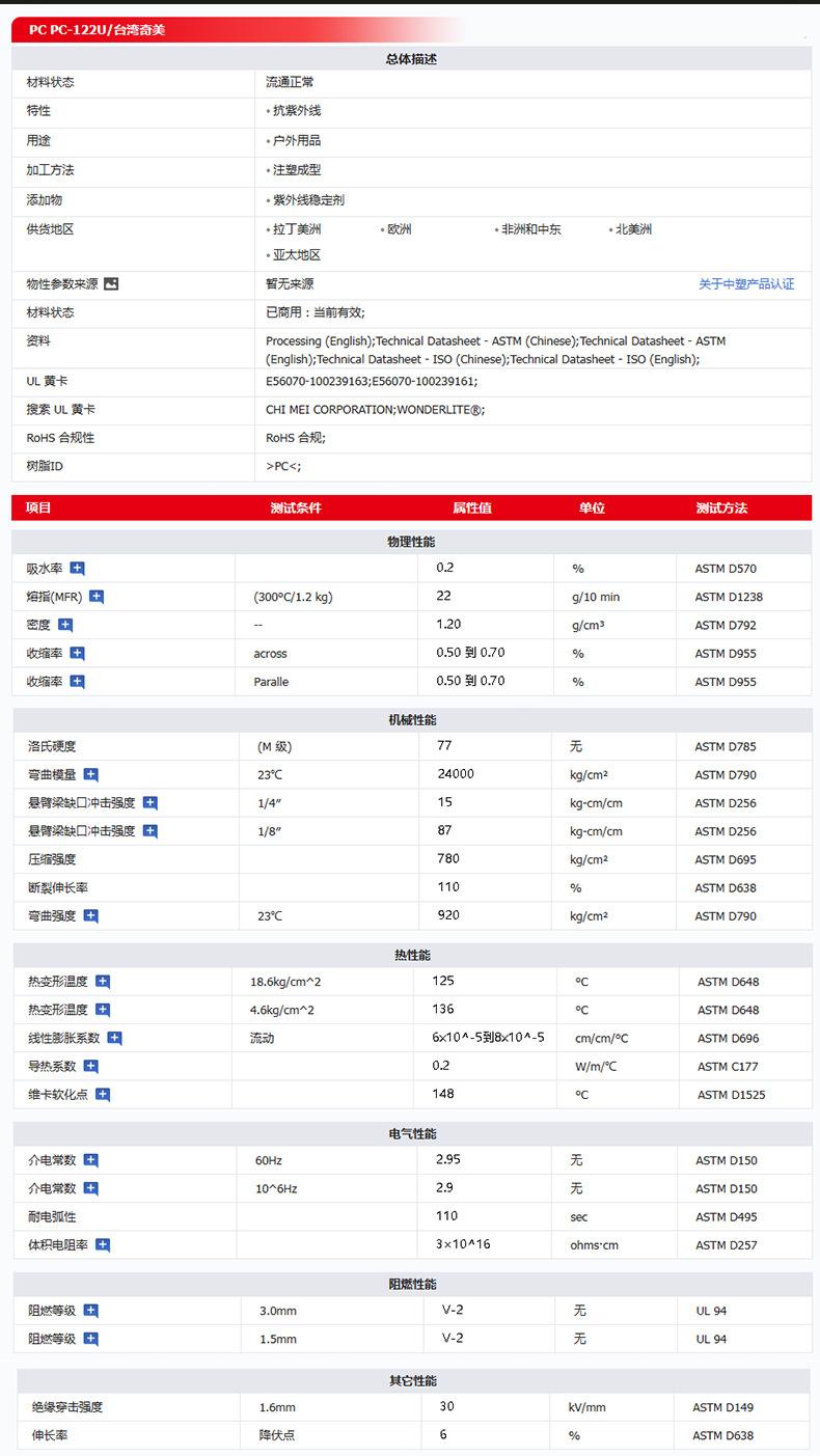 Suministro de PC Taiwán Chimei PC-122U Estabilizador UV transparente de alto flujo Productos para exteriores