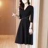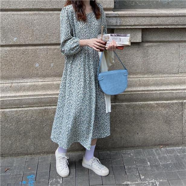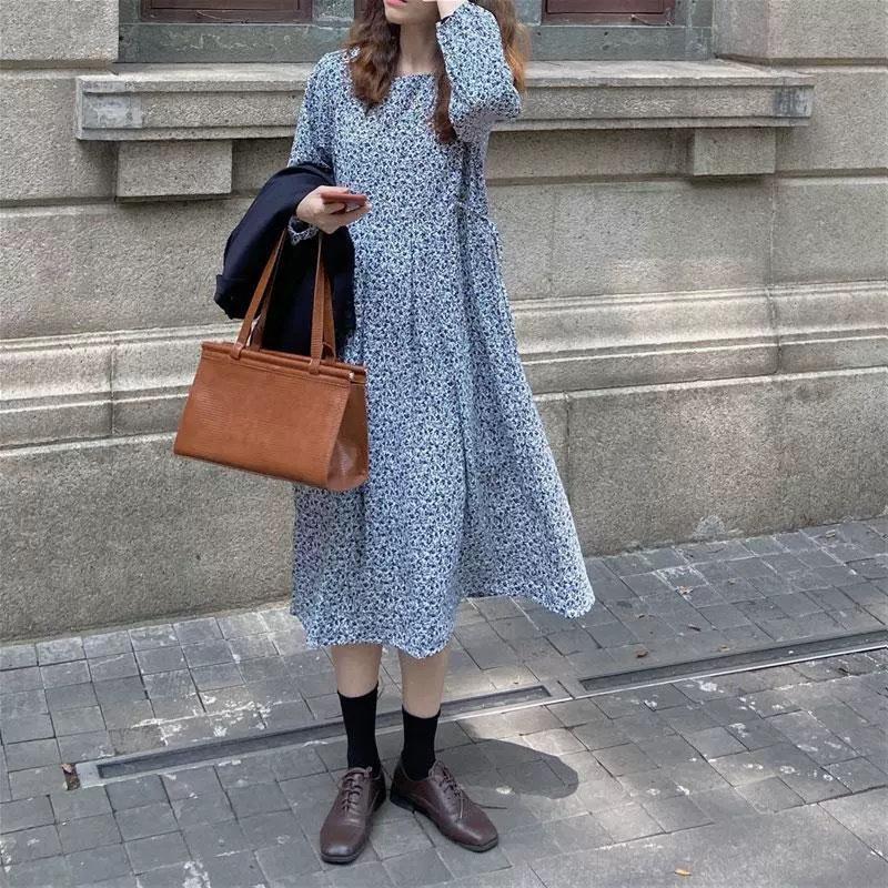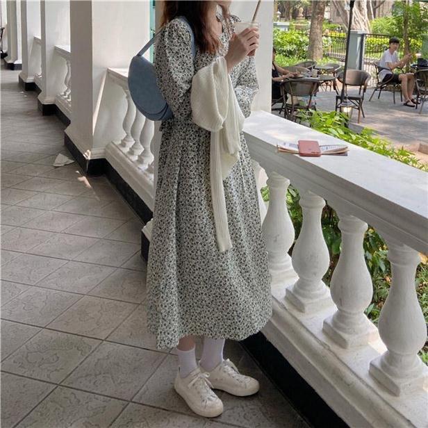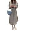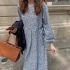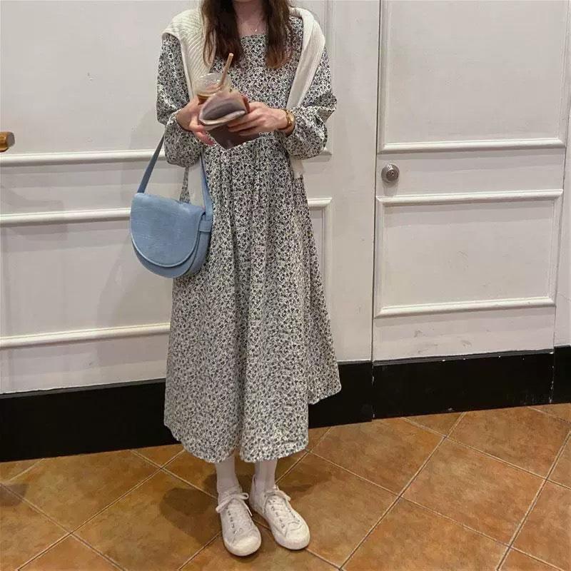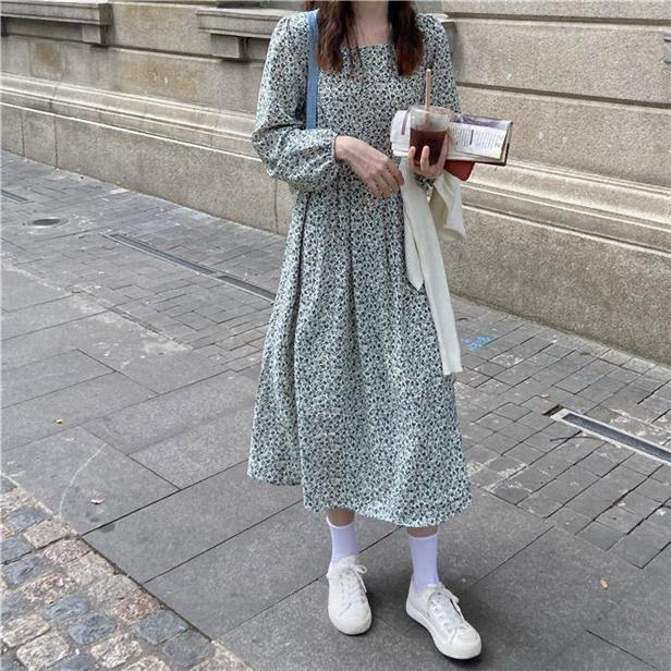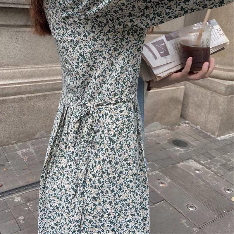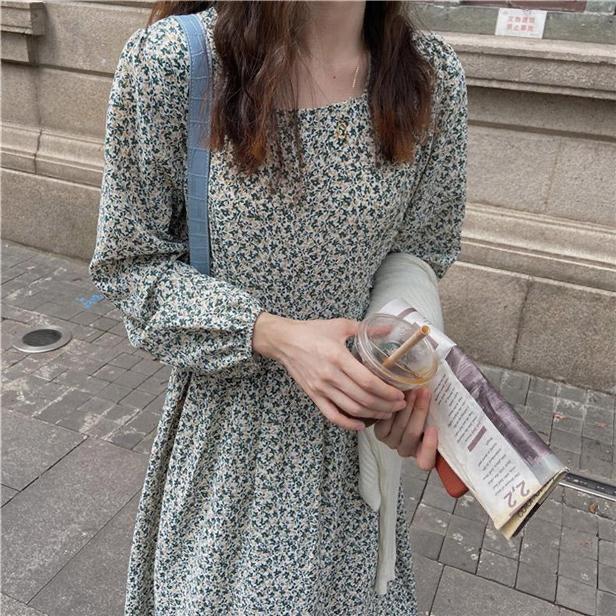 Vestido de manga larga con cuello cuadrado y estampado floral de estilo francés para mujer, nuevo vestido de otoño con cintura adelgazante, elegante falda de cola de pez, falda larga interior