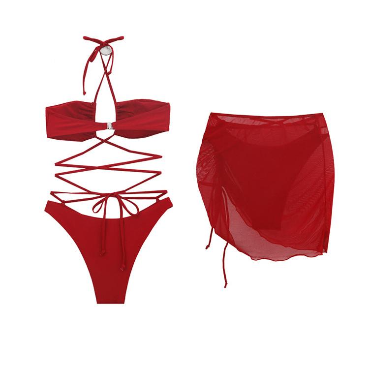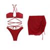 Traje de baño bikini sexy de exportación de fábrica, falda triangular sin espalda, conjunto de tres piezas, traje de baño europeo y americano para mujer