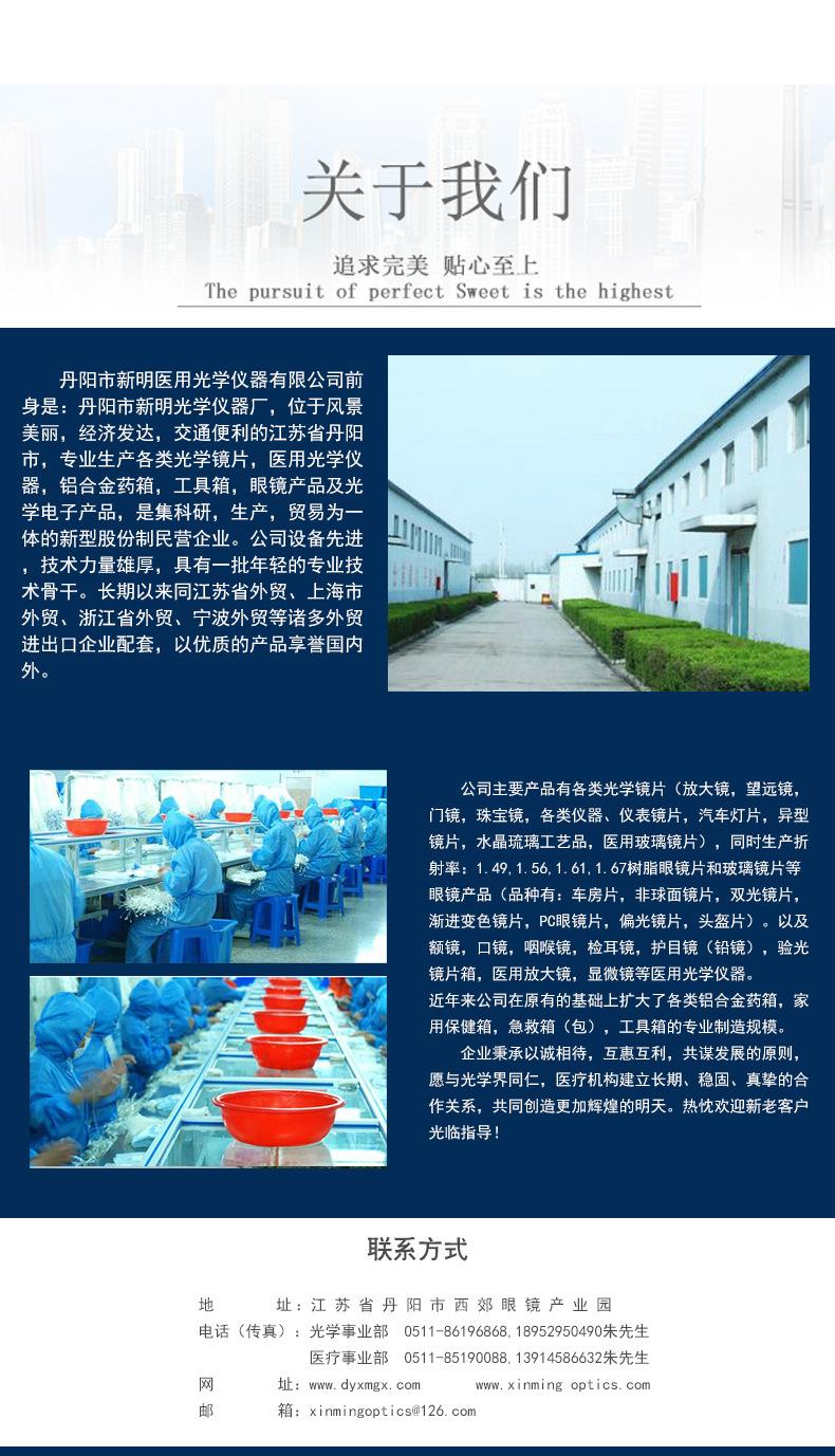 Danyang Xinming Medical Optical Instrument Co., Ltd., anteriormente conocida como Danyang Xinming Optical Instrument Factory, está ubicada en la ciudad de Danyang, provincia de Jiangsu, que tiene hermosos paisajes, una economía desarrollada y transporte conveniente. Se especializa en la producción de diversas lentes ópticas, instrumentos ópticos médicos, cajas de medicamentos de aleación de aluminio, cajas de herramientas, productos para gafas y productos ópticos electrónicos. Es un nuevo tipo de empresa privada de acciones conjuntas que integra investigación científica, producción y comercio. La empresa cuenta con equipos avanzados, una sólida fuerza técnica y un grupo de jóvenes profesionales y técnicos. Durante mucho tiempo, ha apoyado a muchas empresas de importación y exportación de comercio exterior como Jiangsu Foreign Trade, Shanghai Foreign Trade, Zhejiang Foreign Trade, Ningbo Foreign Trade, etc., y es bien conocida en el país y en el extranjero por sus productos de alta calidad.