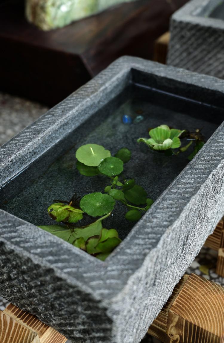 A set of stone grooves with stone grinding flowing water (the bottom groove has a water outlet and does not include green plants)